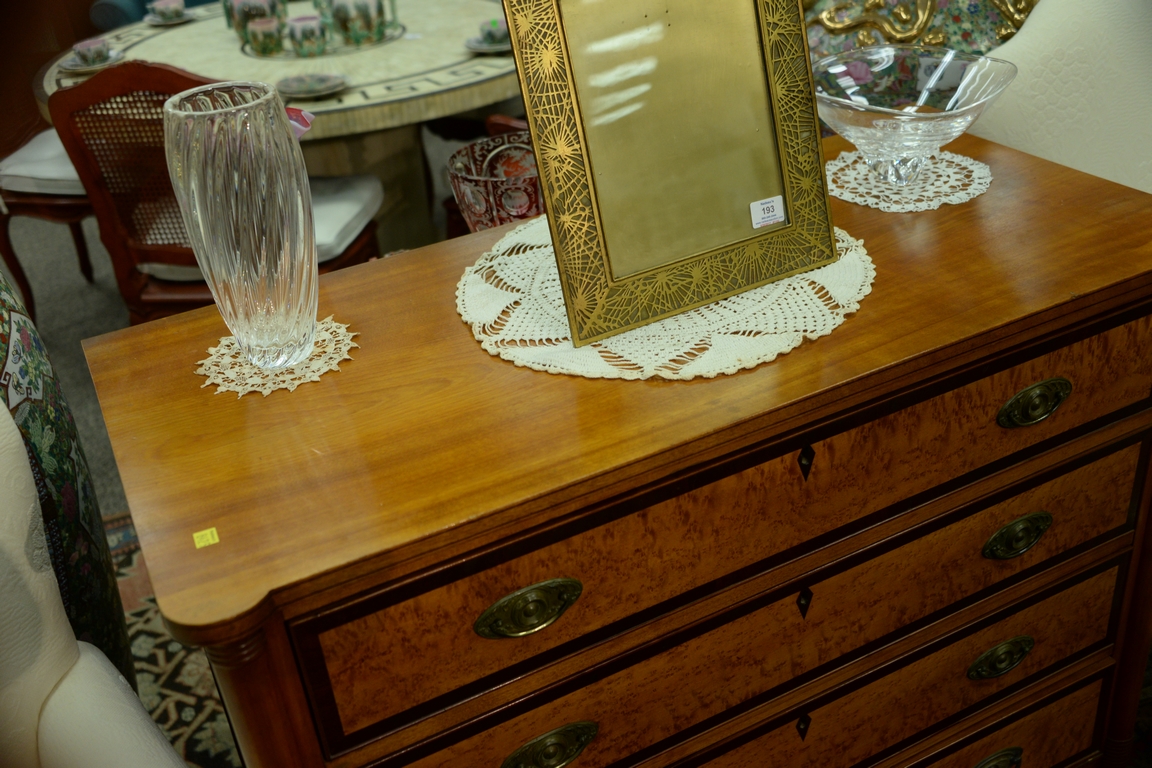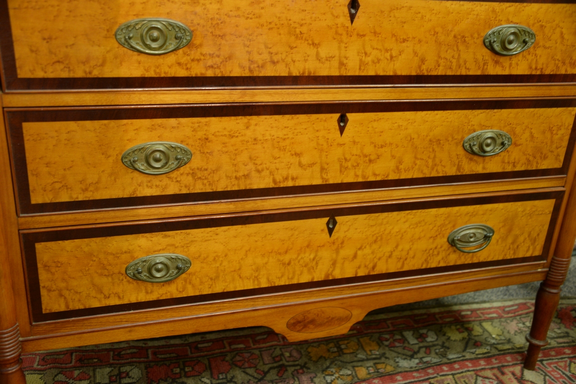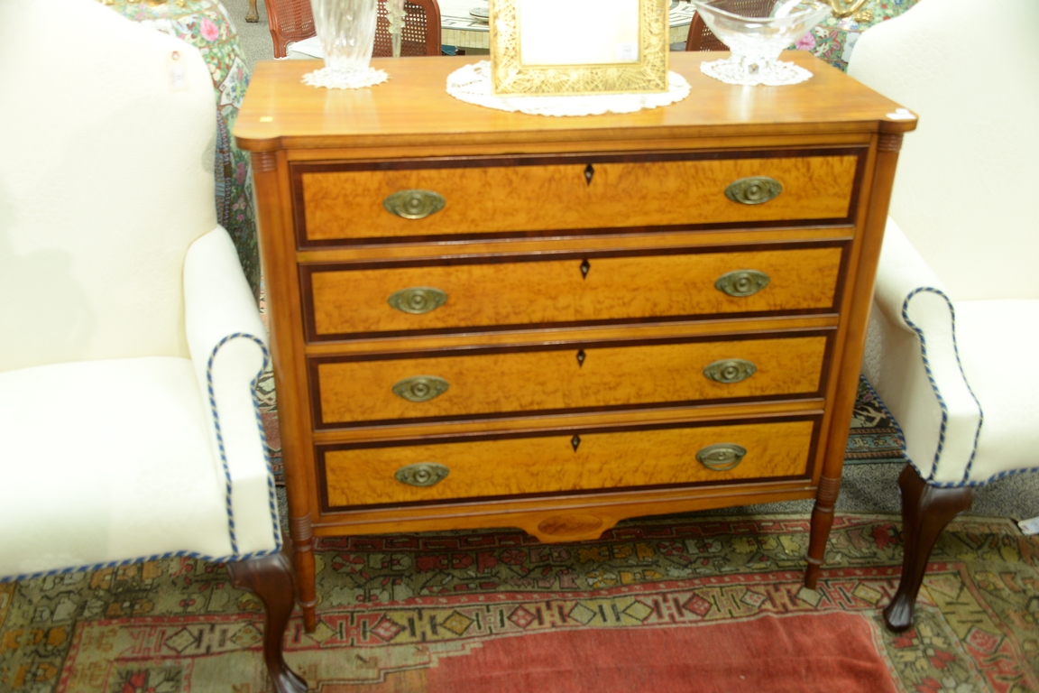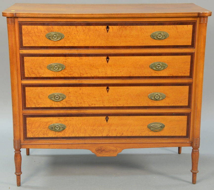 Lot 122: Sheraton four drawer chest with banded inlaid and birdseye maple drawer fronts, set on turned legs, circa 1830. ht. 38 1/2in., wd. 4…