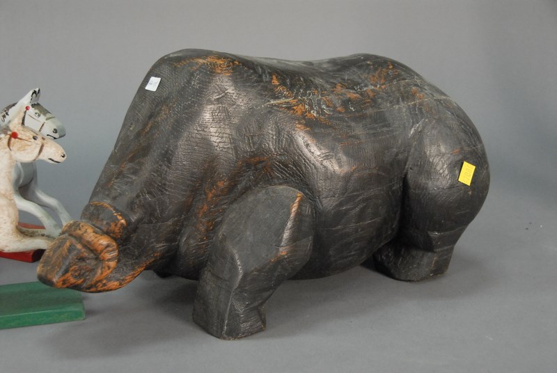 Lot 122: Six piece lot to include two folk art pigs, one signed G. Ronnie 87, and carved wood animal, largest: ht. 17in. lg. 18in. and small…