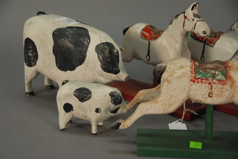 Six piece lot to include two folk art pigs, one signed G. Ronnie 87, and carved wood animal, largest: ht. 17in. lg. 18in. and smallest: ht. 3in. lg. 4 1/2in.