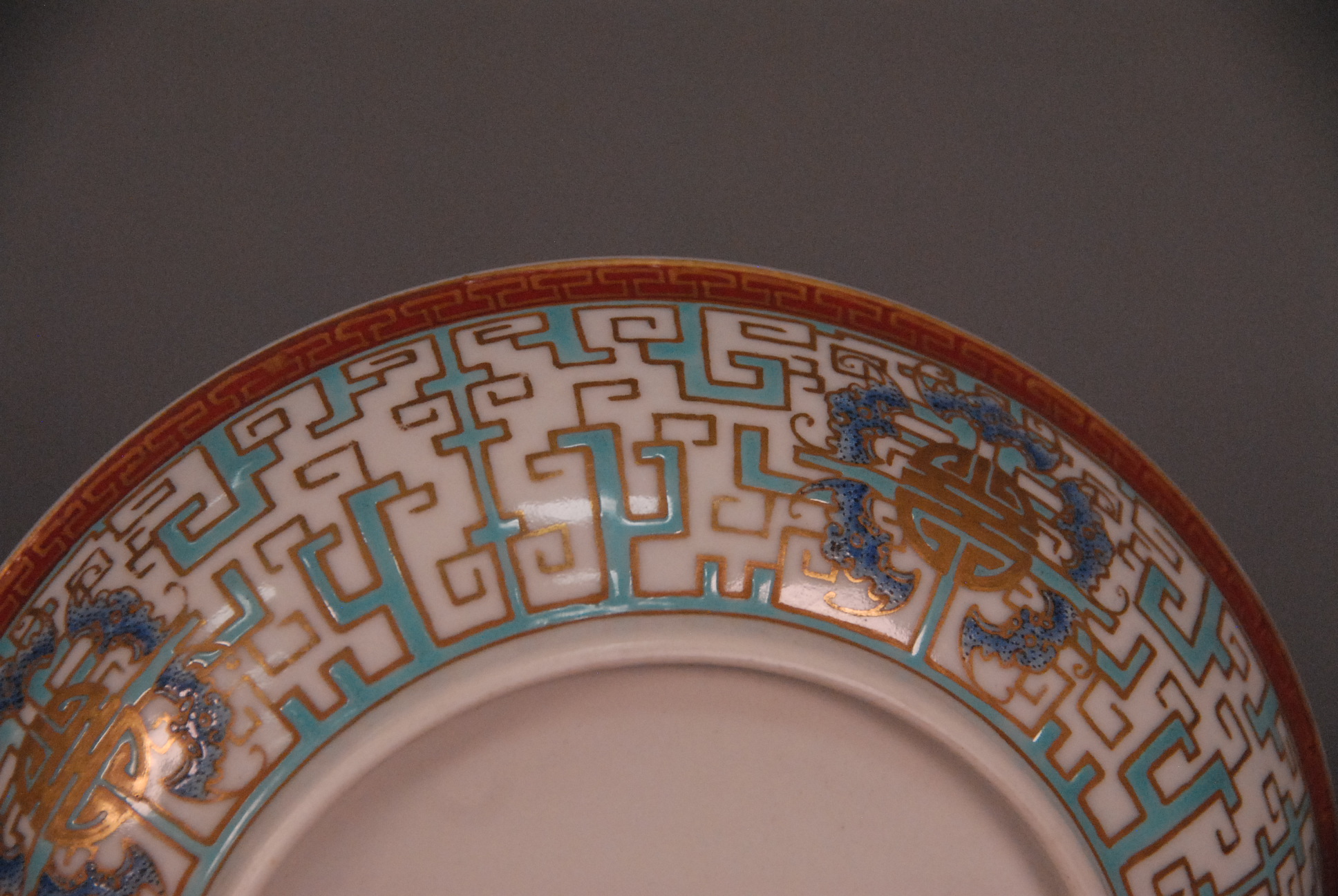 Small porcelain bat bowl having painted bats and geometric design with four character marks on bottom, ht. 1 1/2in. dia. 6 3/4in.