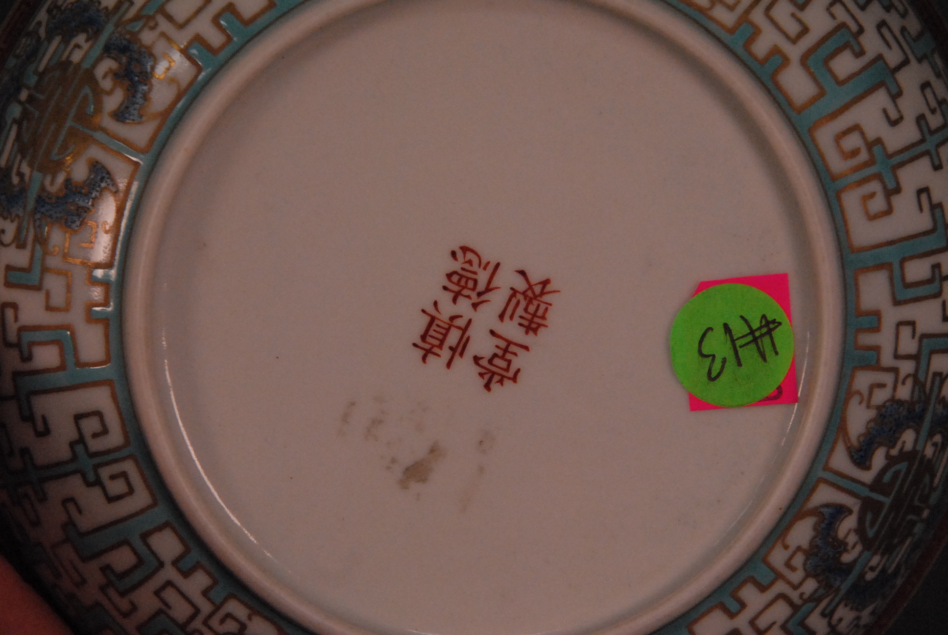 Lot 122: Small porcelain bat bowl having painted bats and geometric design with four character marks on bottom, ht. 1 1/2in. dia. 6 3/4in.