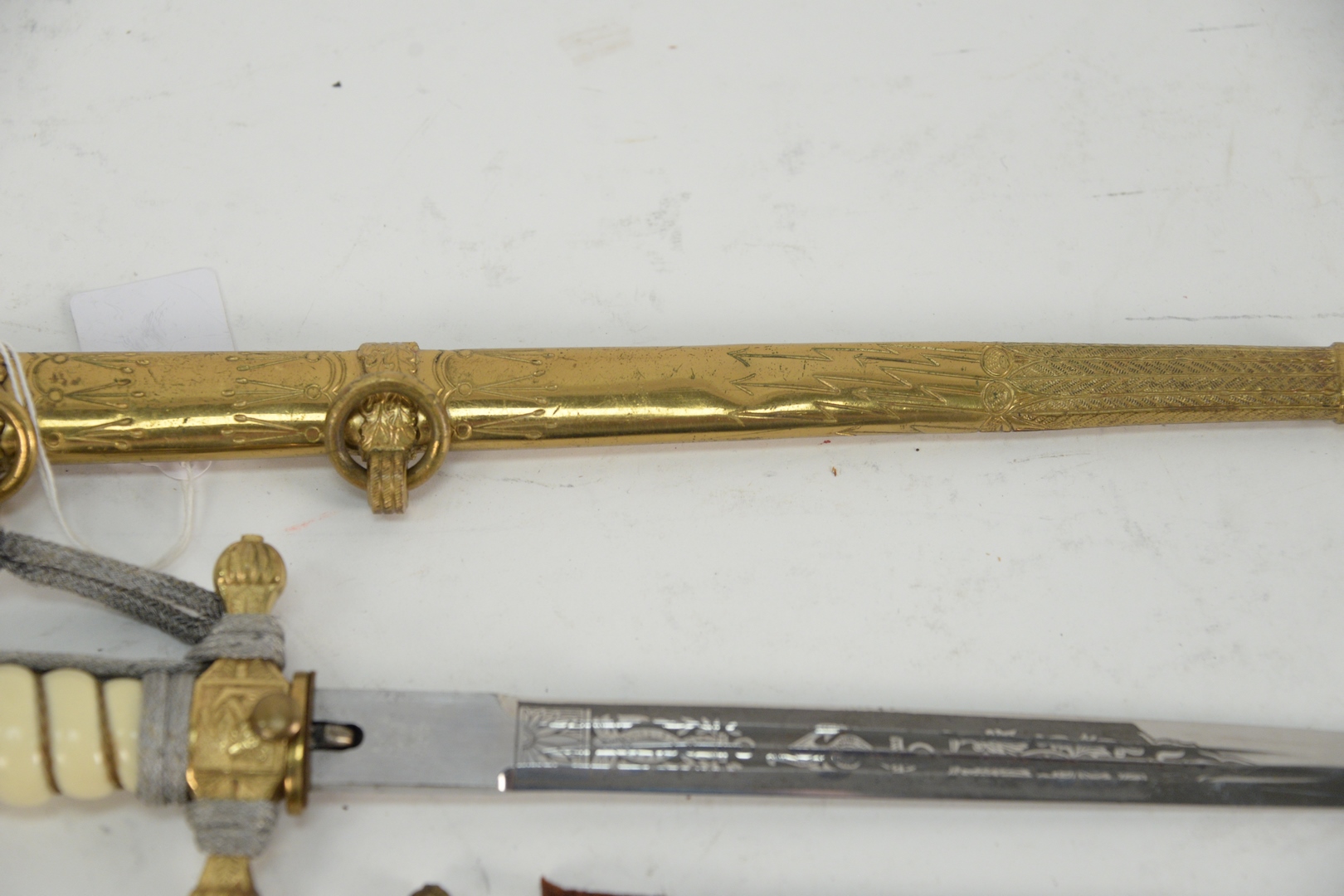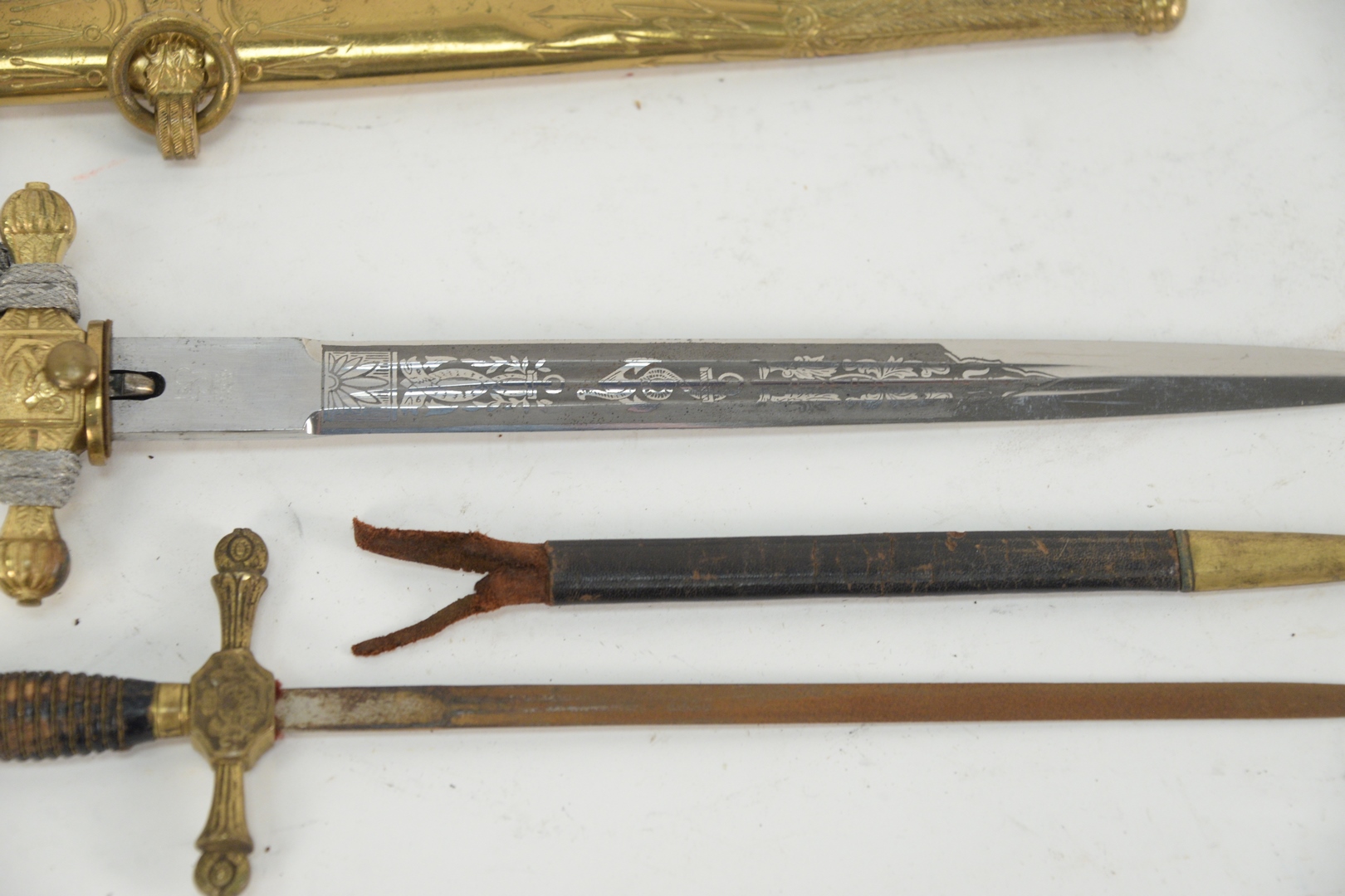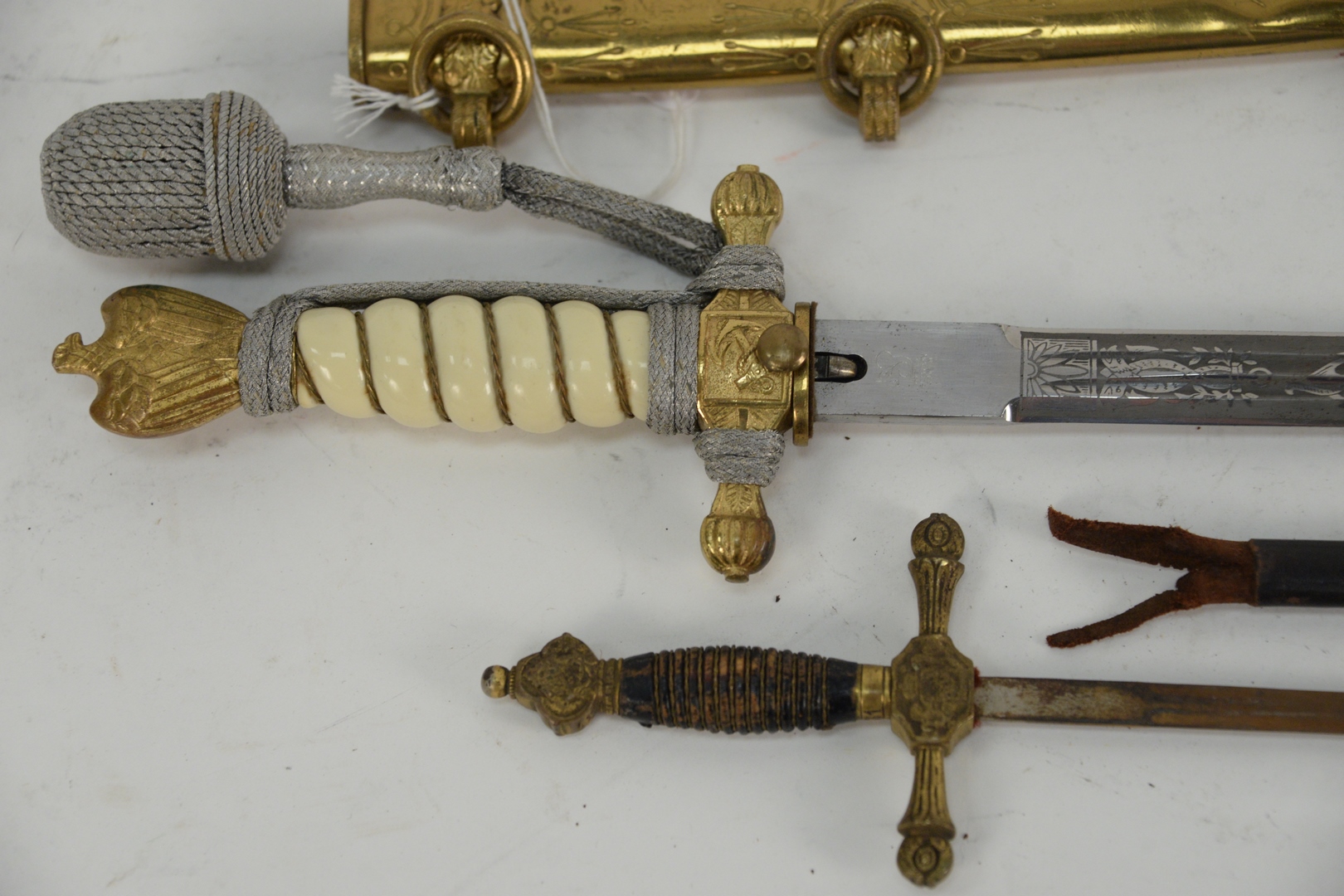 Lot 122: Three Piece Group to include Imperial Kriegsmarine dagger, a nickel plated steel blade marked Carl Eickhorn, along with a small sword and a brass sheath, largest 16 and 18 inches. Provenance: The Estate of Diana Atwood Johnson.