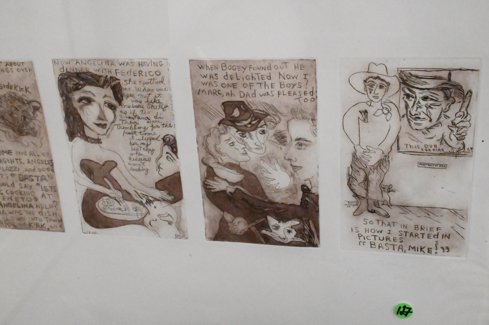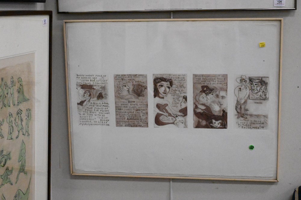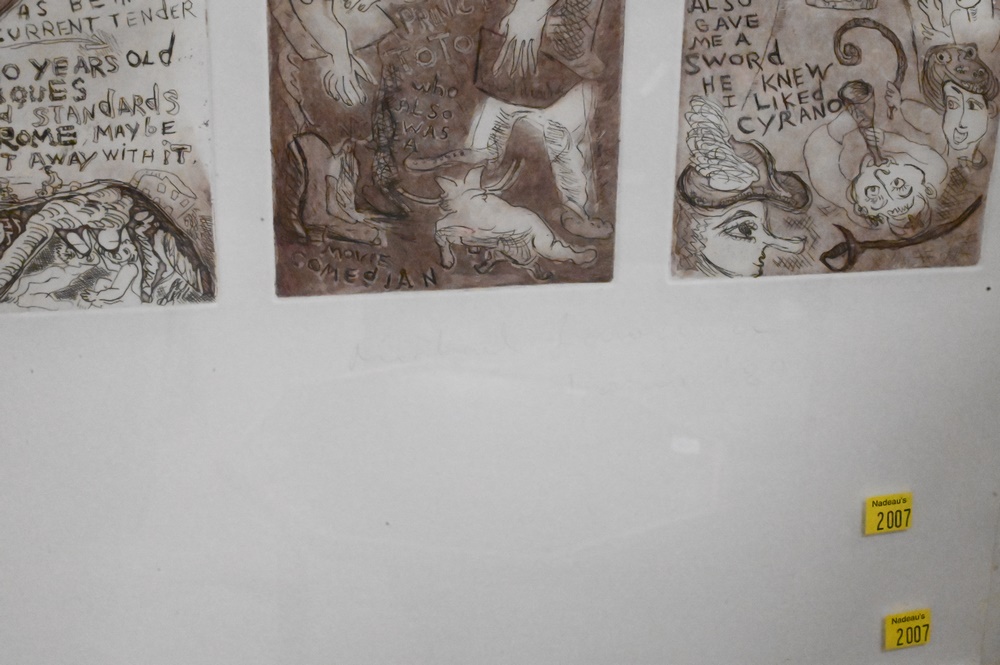 Lot 122: Two Michael Lawrence (born 1943) Etchings, five part comic story etching, pencil signed lower right “Michael Lawrence, Paris, August 84″, 22″ x 29 1/2”.