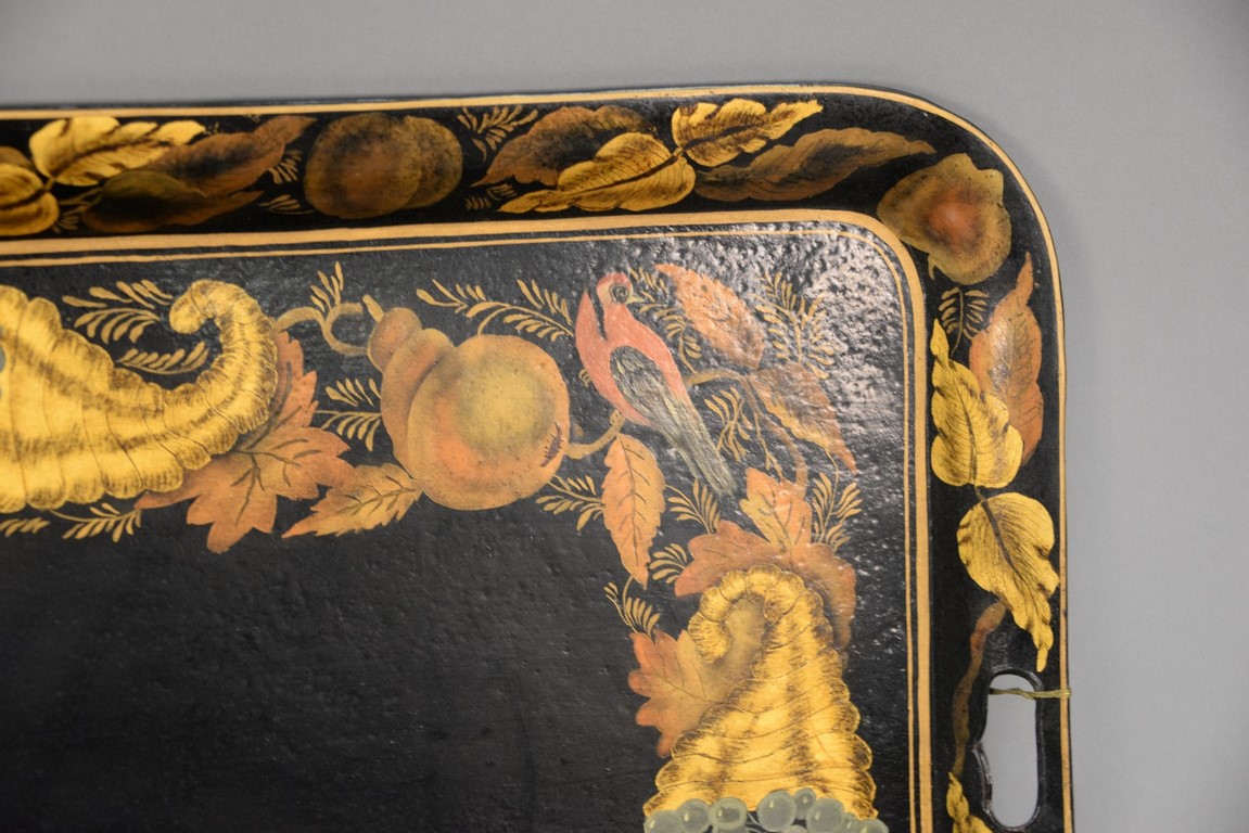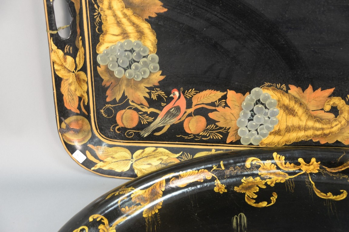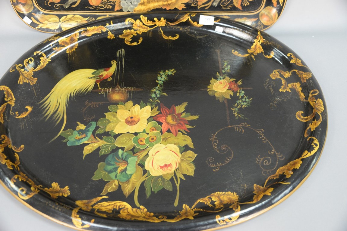 Lot 122: Two painted tole pieces to include tole oval tray lg. 30 in., and a tole rectangular tray with cornucopias lg. 28 in.