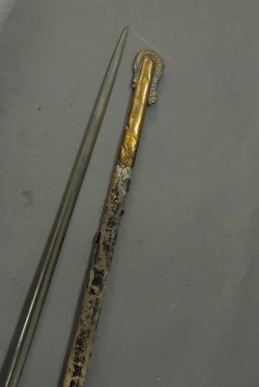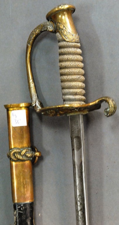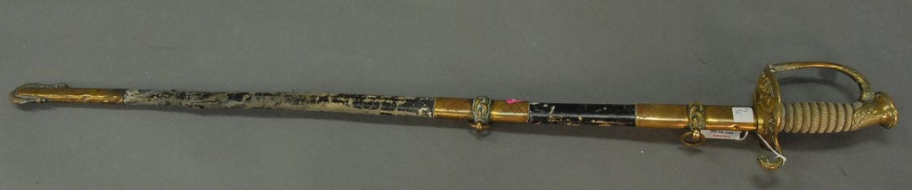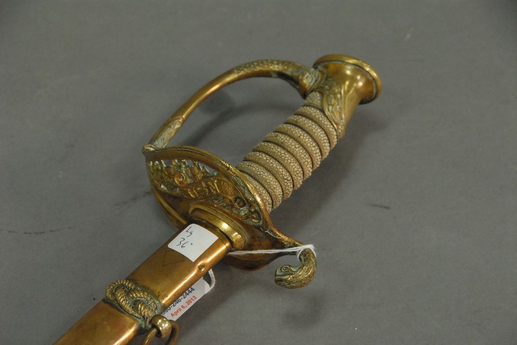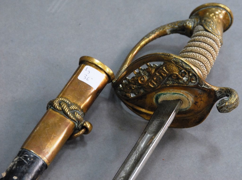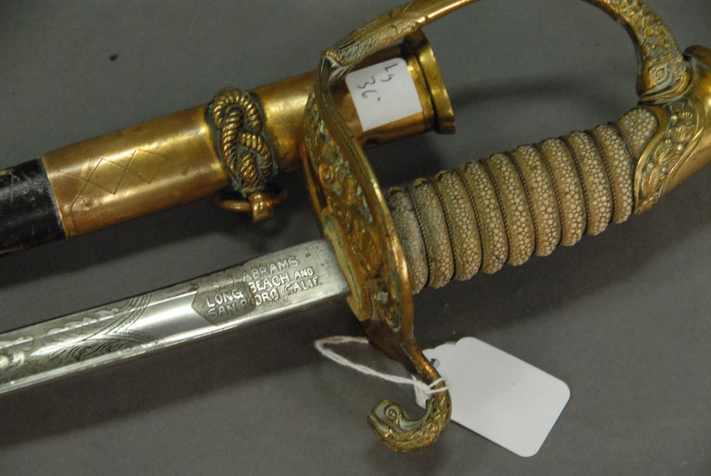 Lot 122: U.S. Navy sword and scabbard, blade marked U.S.N. S.S. Abrams Long Beach and San Pedro, Calif. blade lg. 30in.