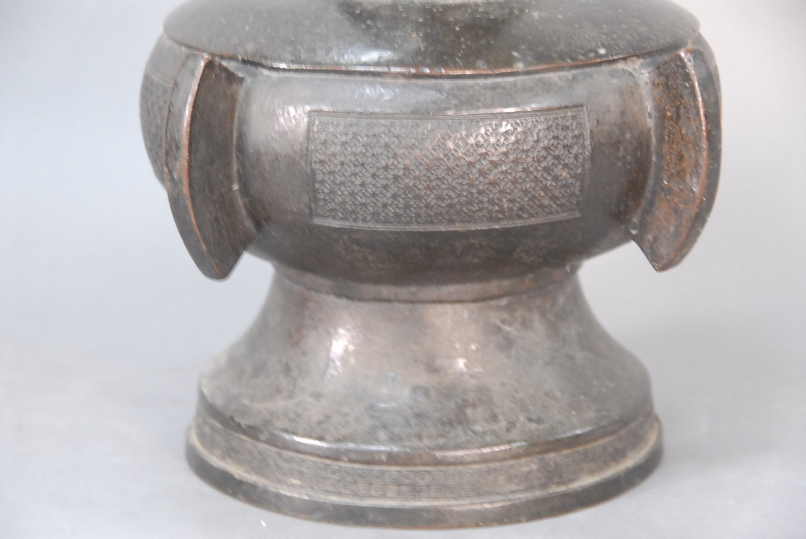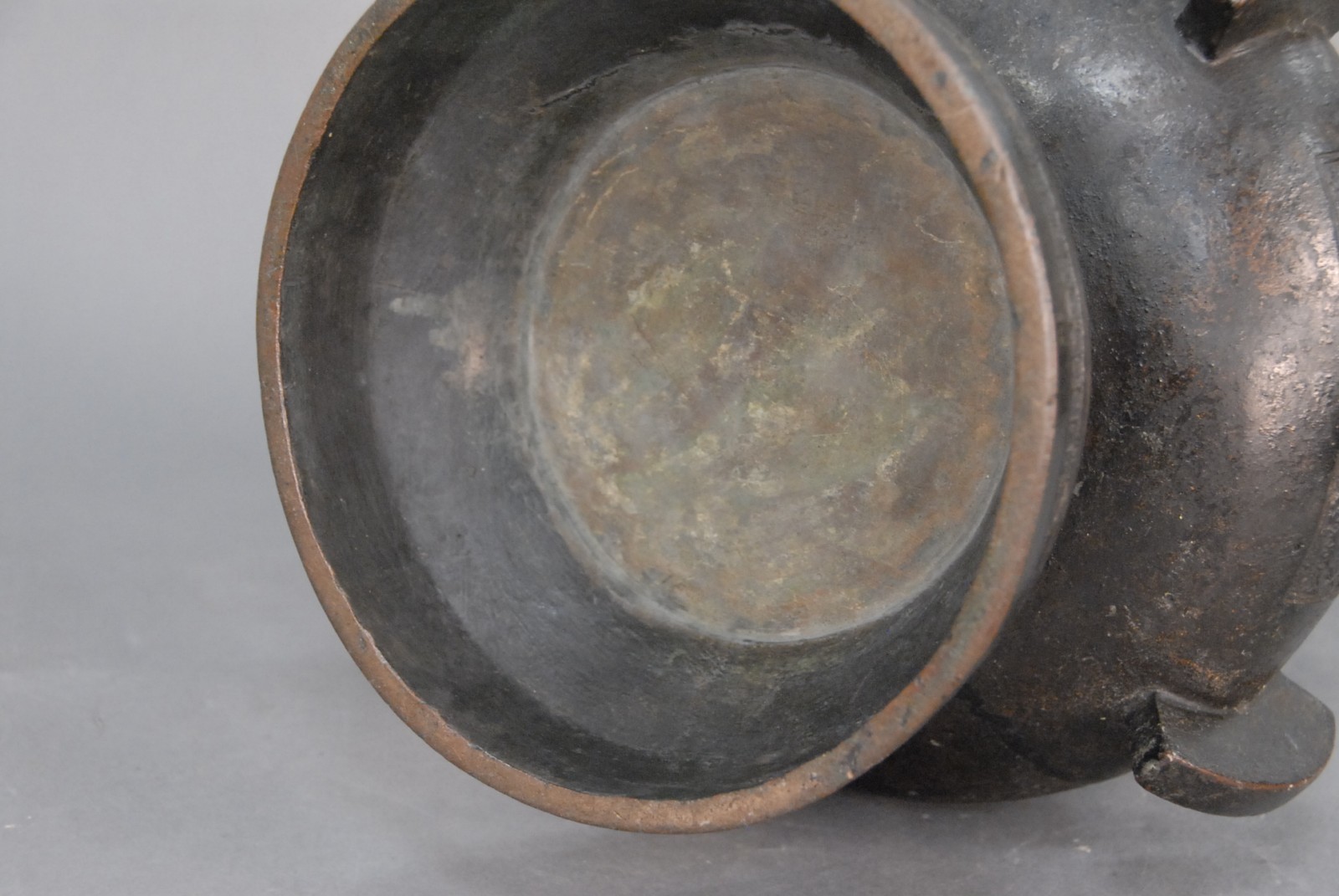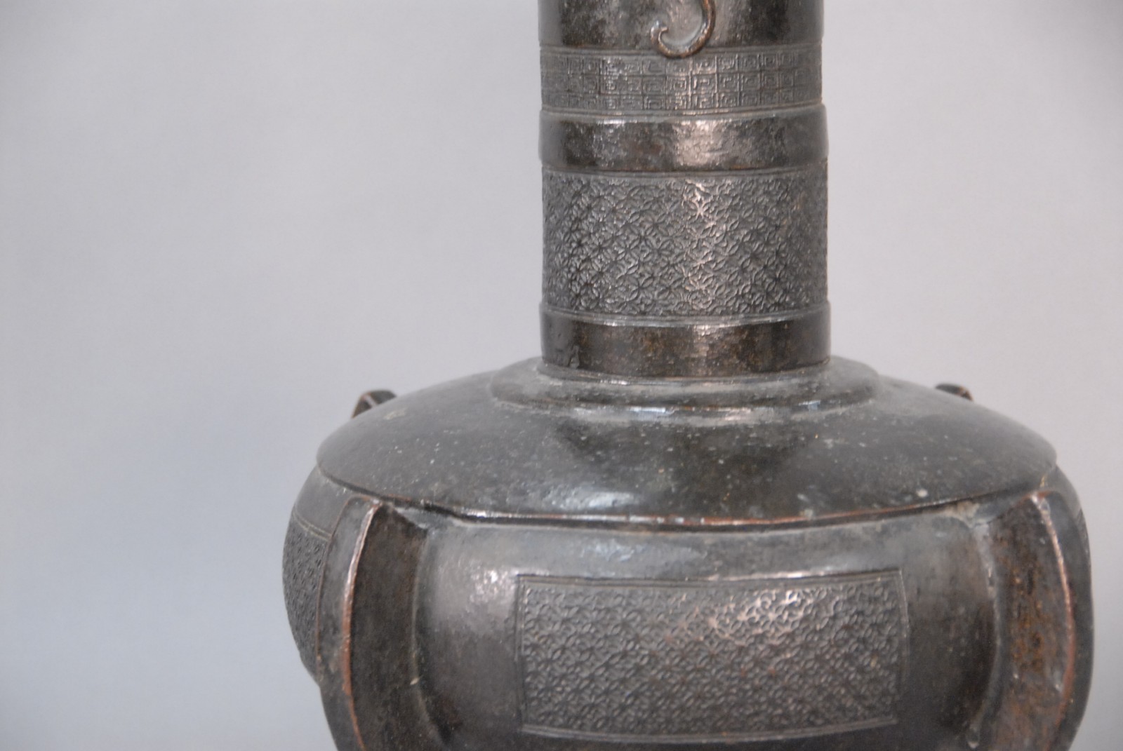 Very large Chinese bronze bottle-form vase with salamanders applied to neck and supported by two tubular handles, 18th century, possibly older.