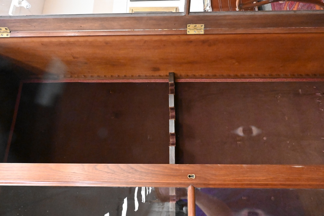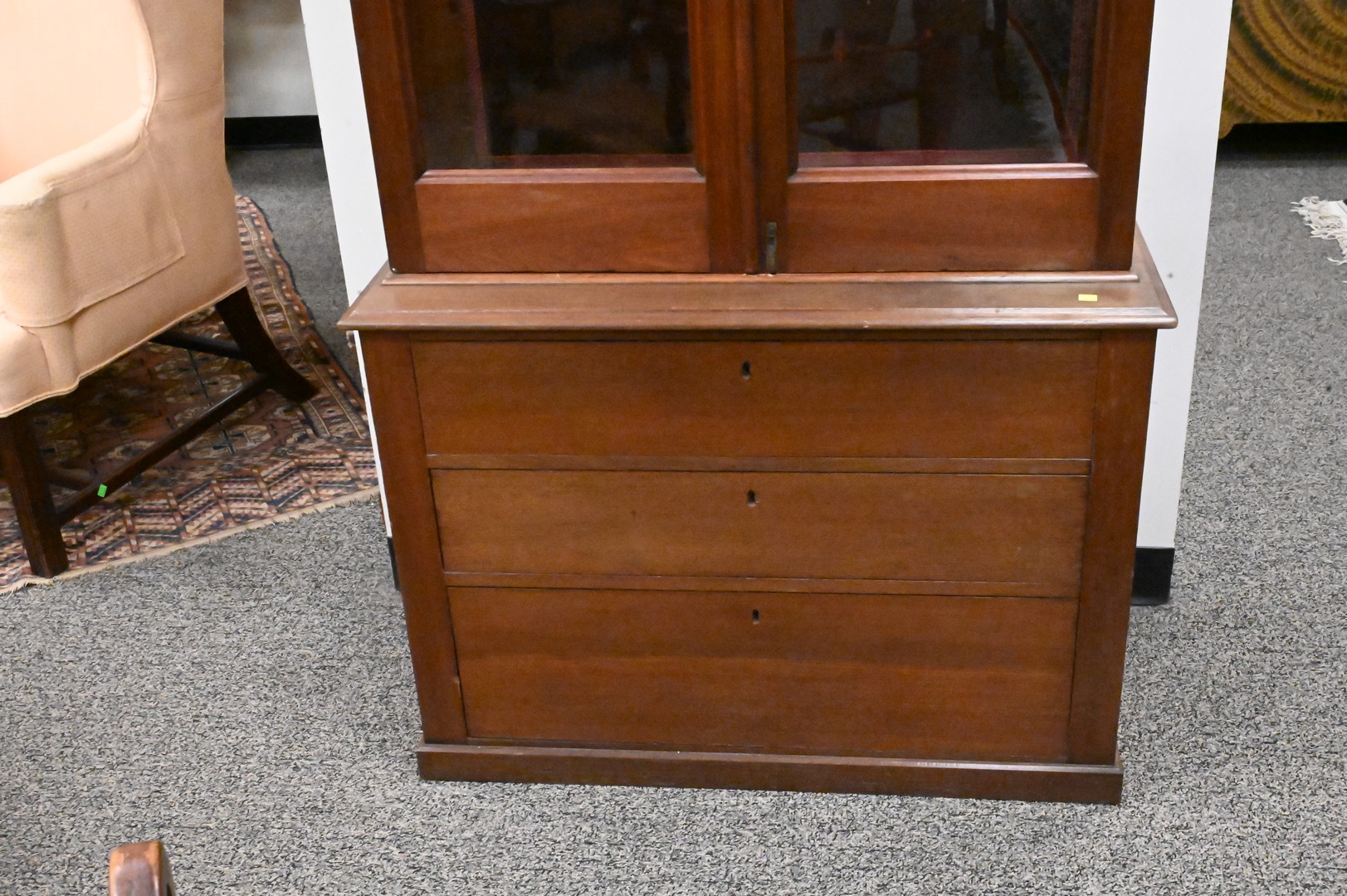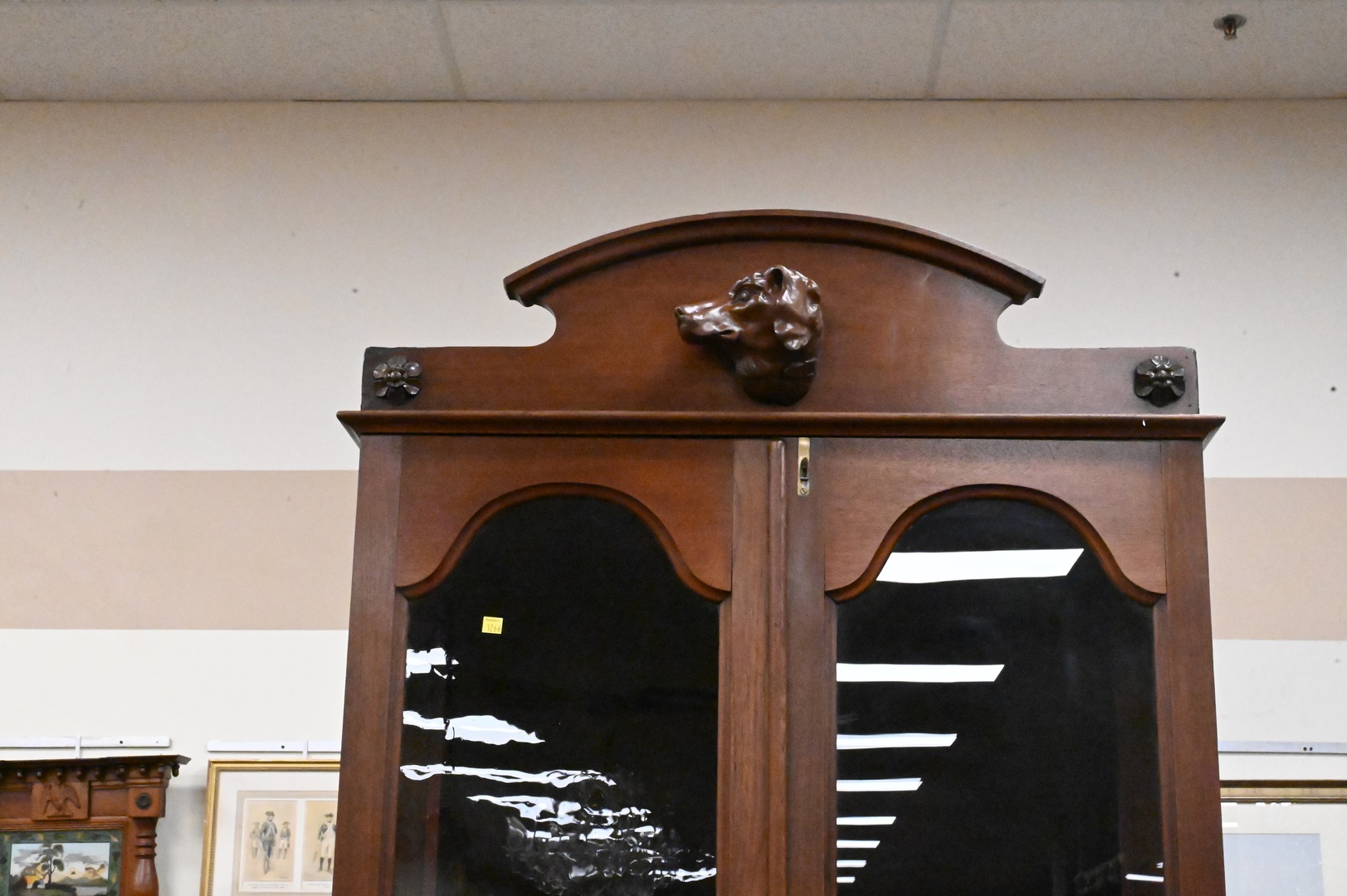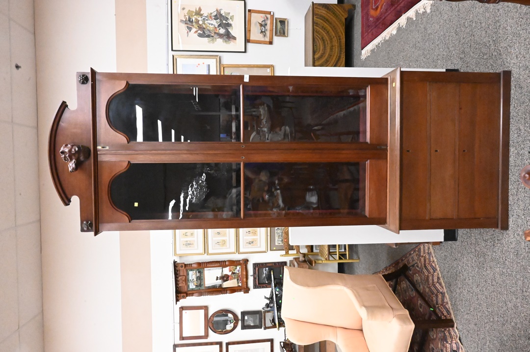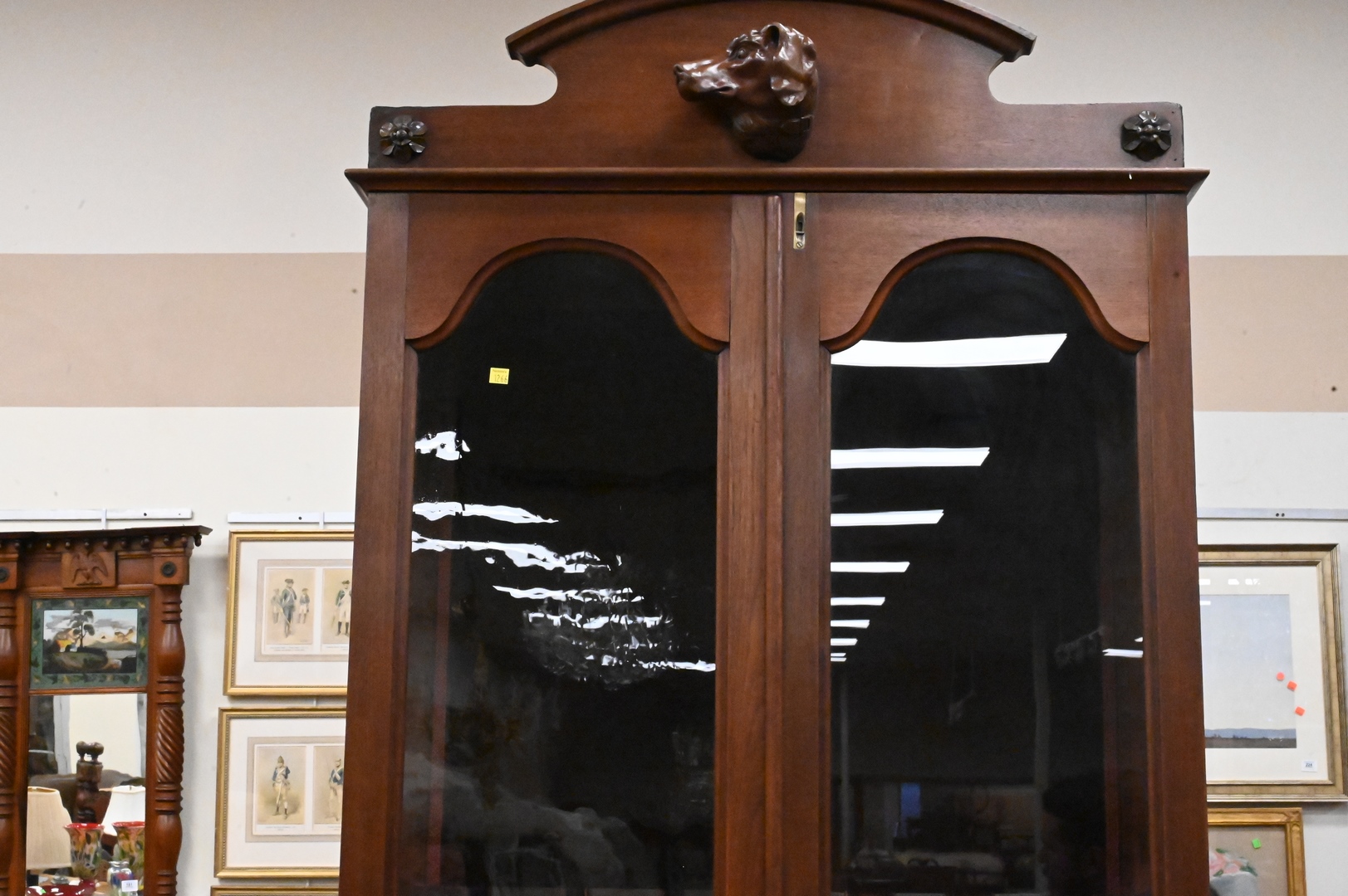 Victorian Gun Cabinet, holds seven guns, having sporting dog head, seven doors, on base with three drawers, height 104 inches, width 38 1/2 inches.