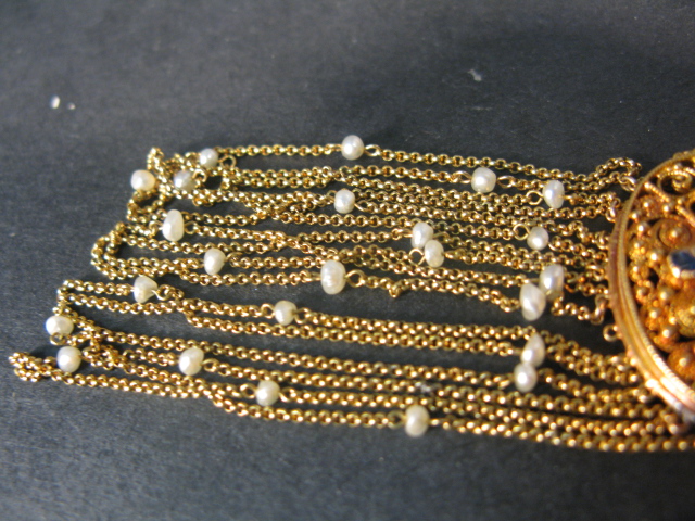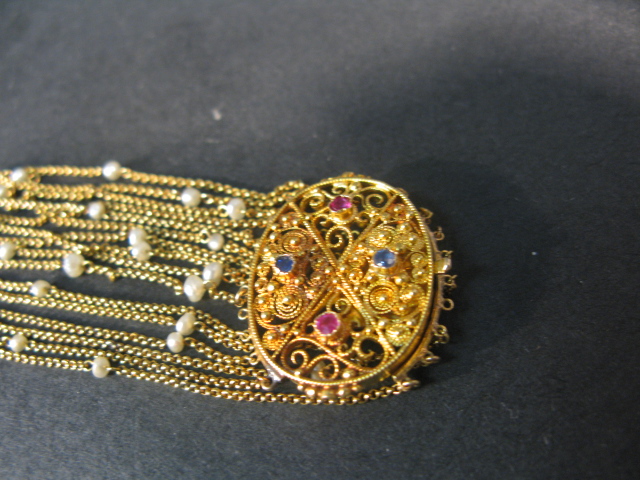 18K – 22K gold bracelet probably Far Eastern set with several stones and pearls.