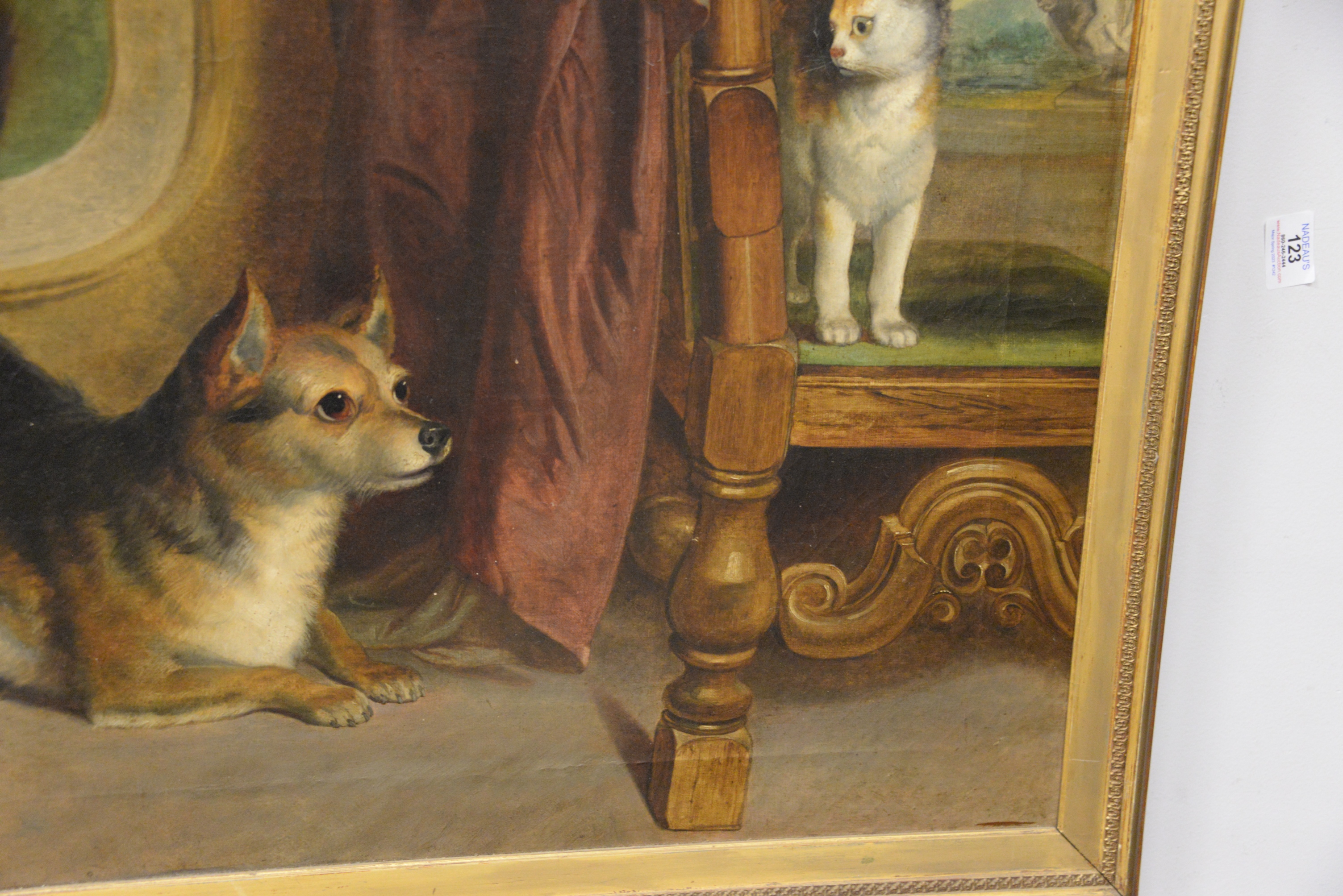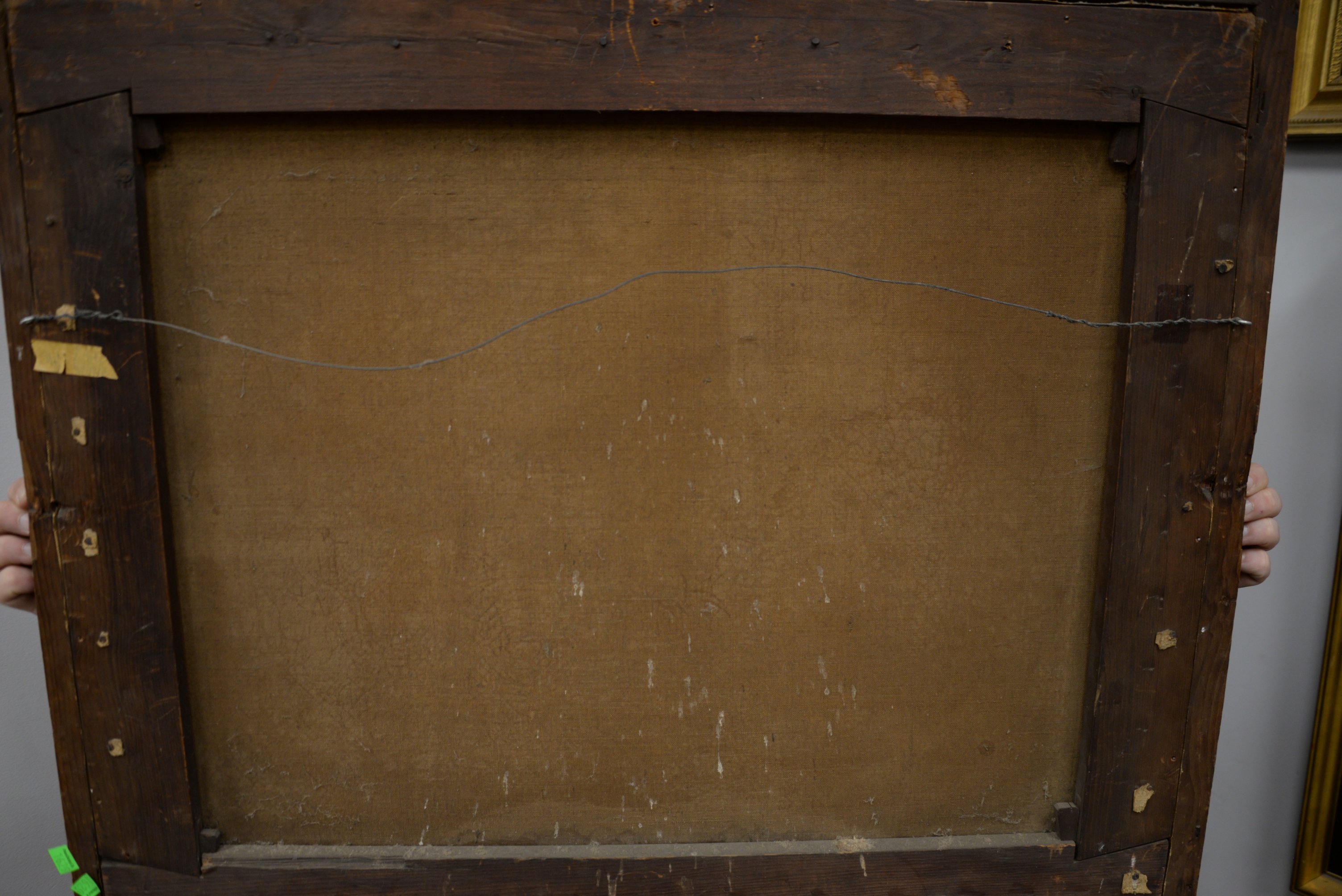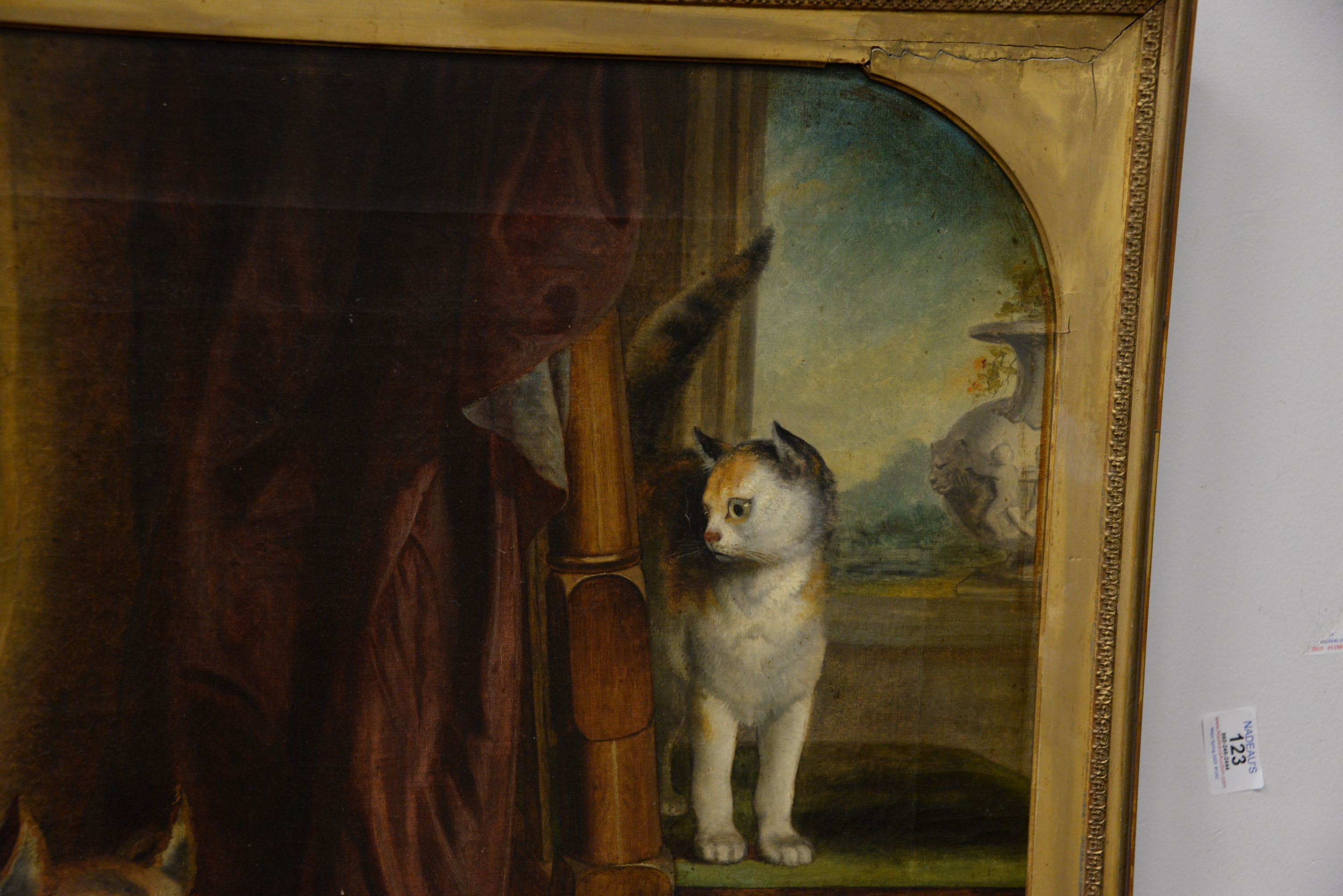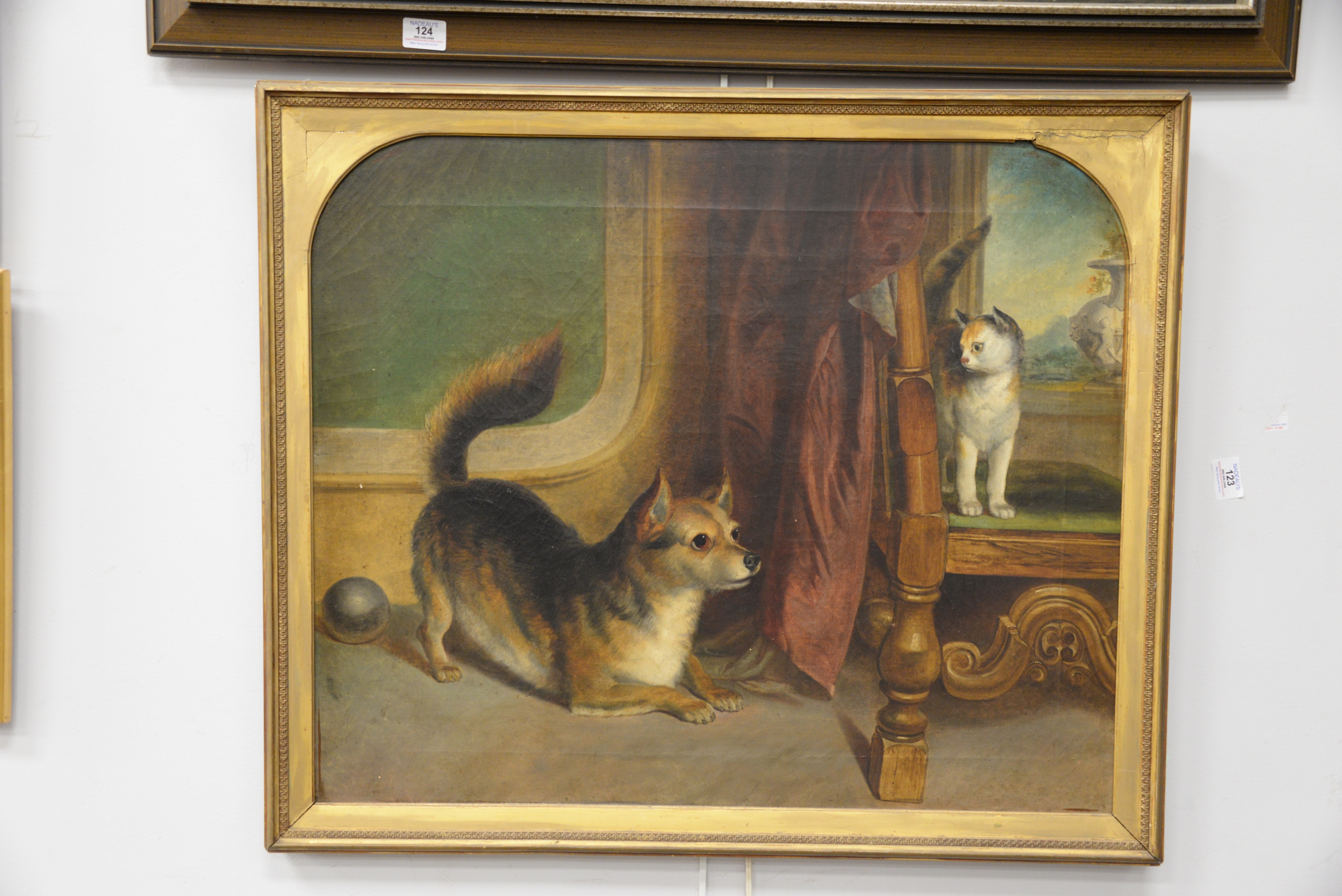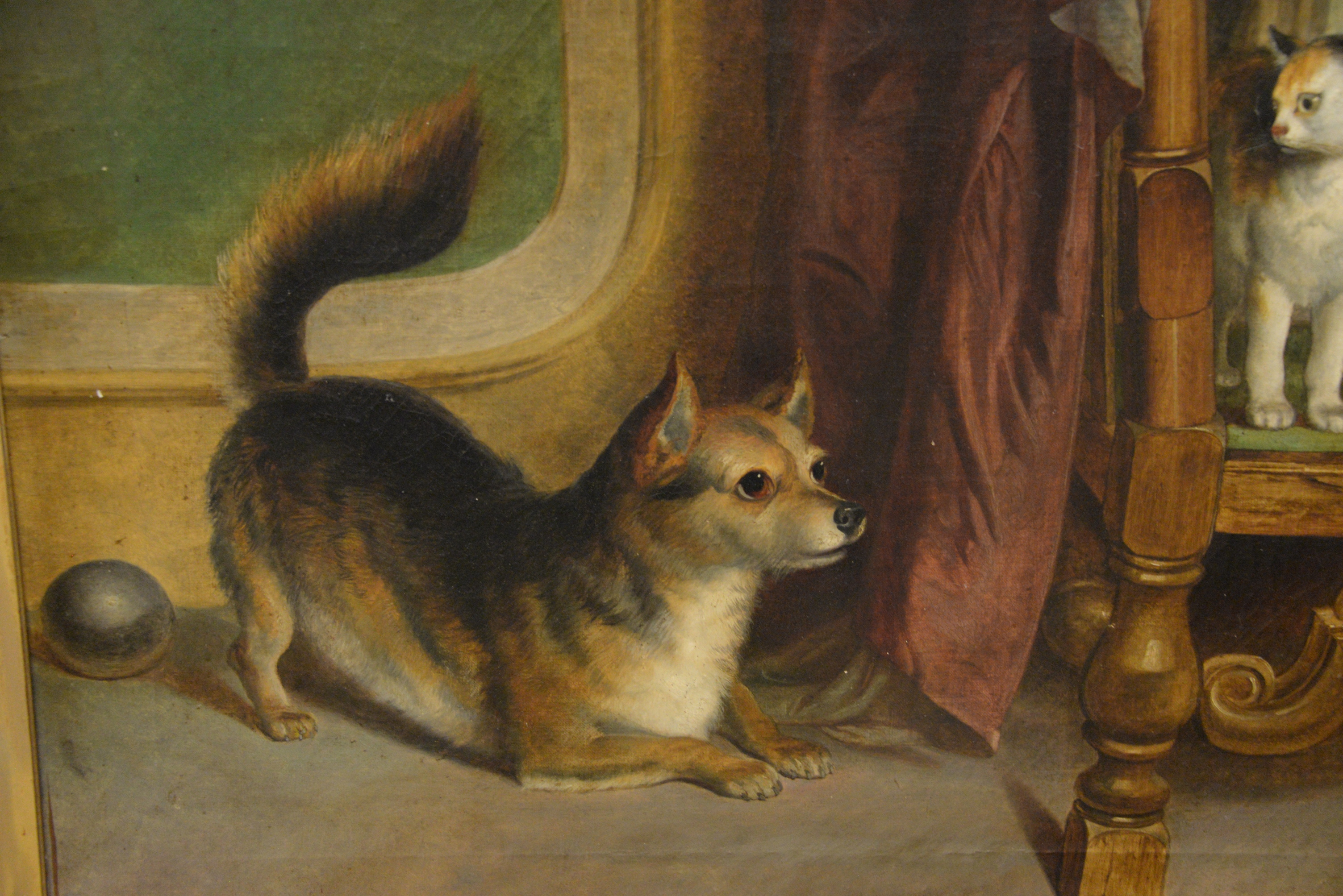 Unknown Artist “Cat and Dog at Play” oil on canvas small dog crouched down and gazing up at a calico cat in an arched picture frame signed illegibly lower left 25″ x 31″.