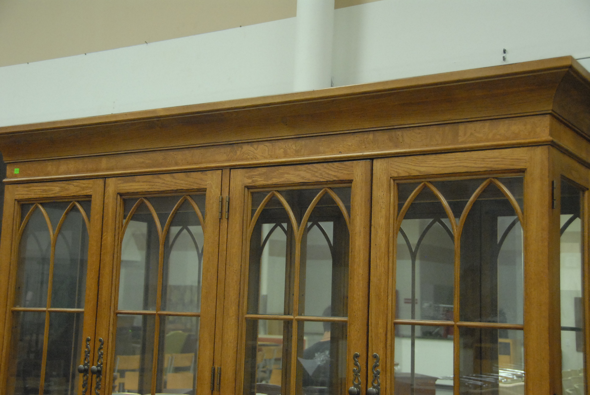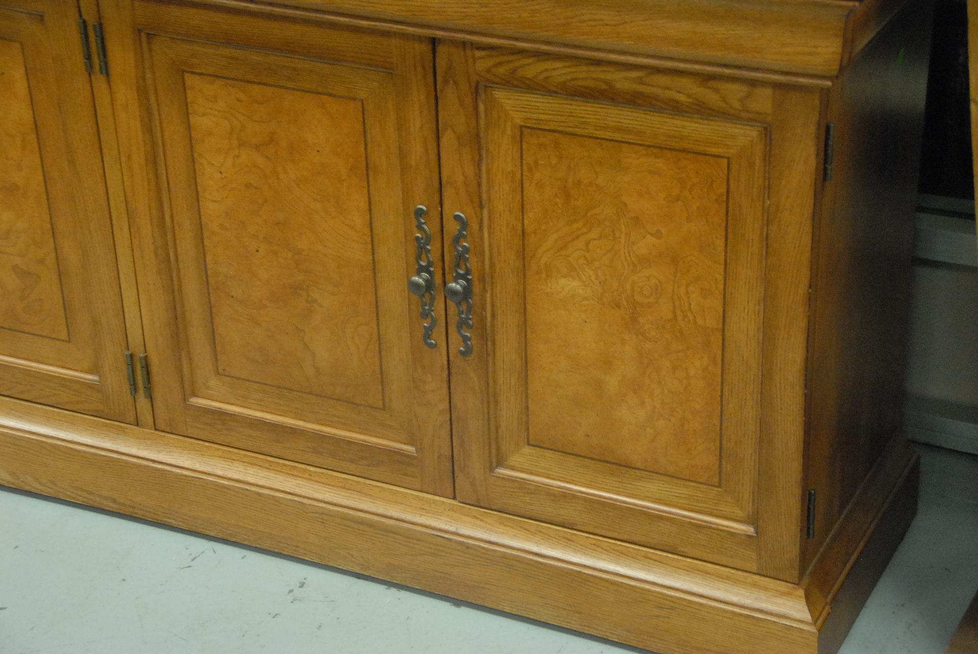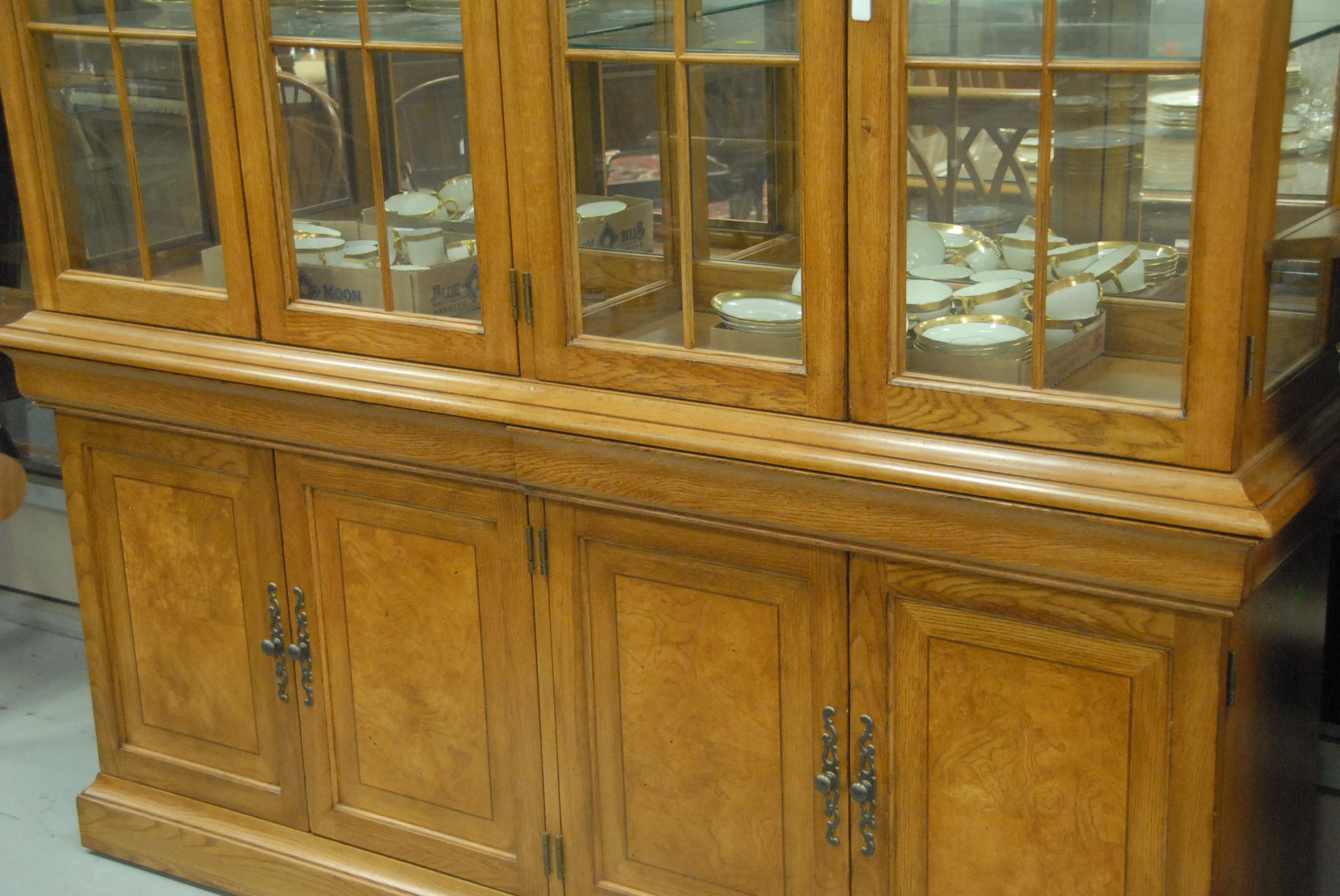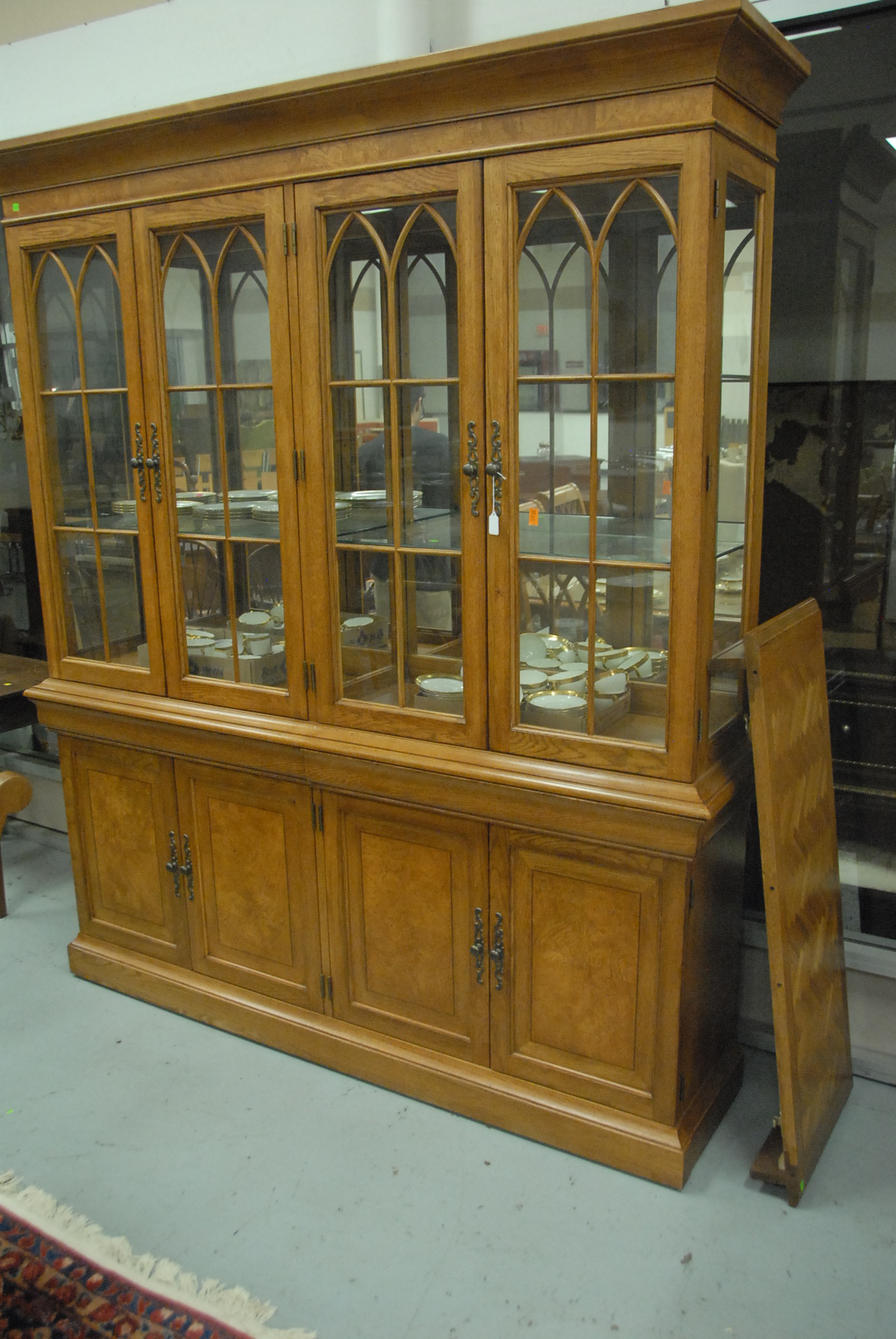 Lot 123: Contemporary oak breakfront with four doors and glass shelves.