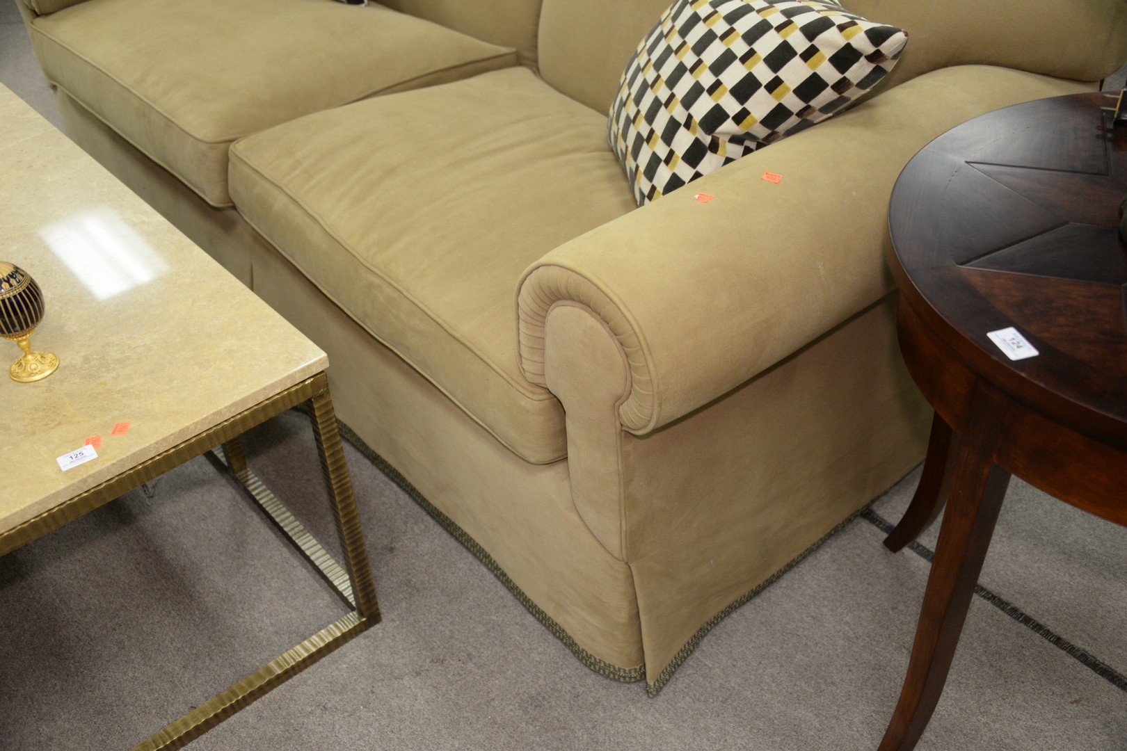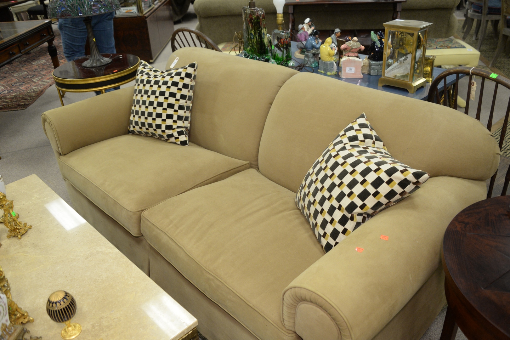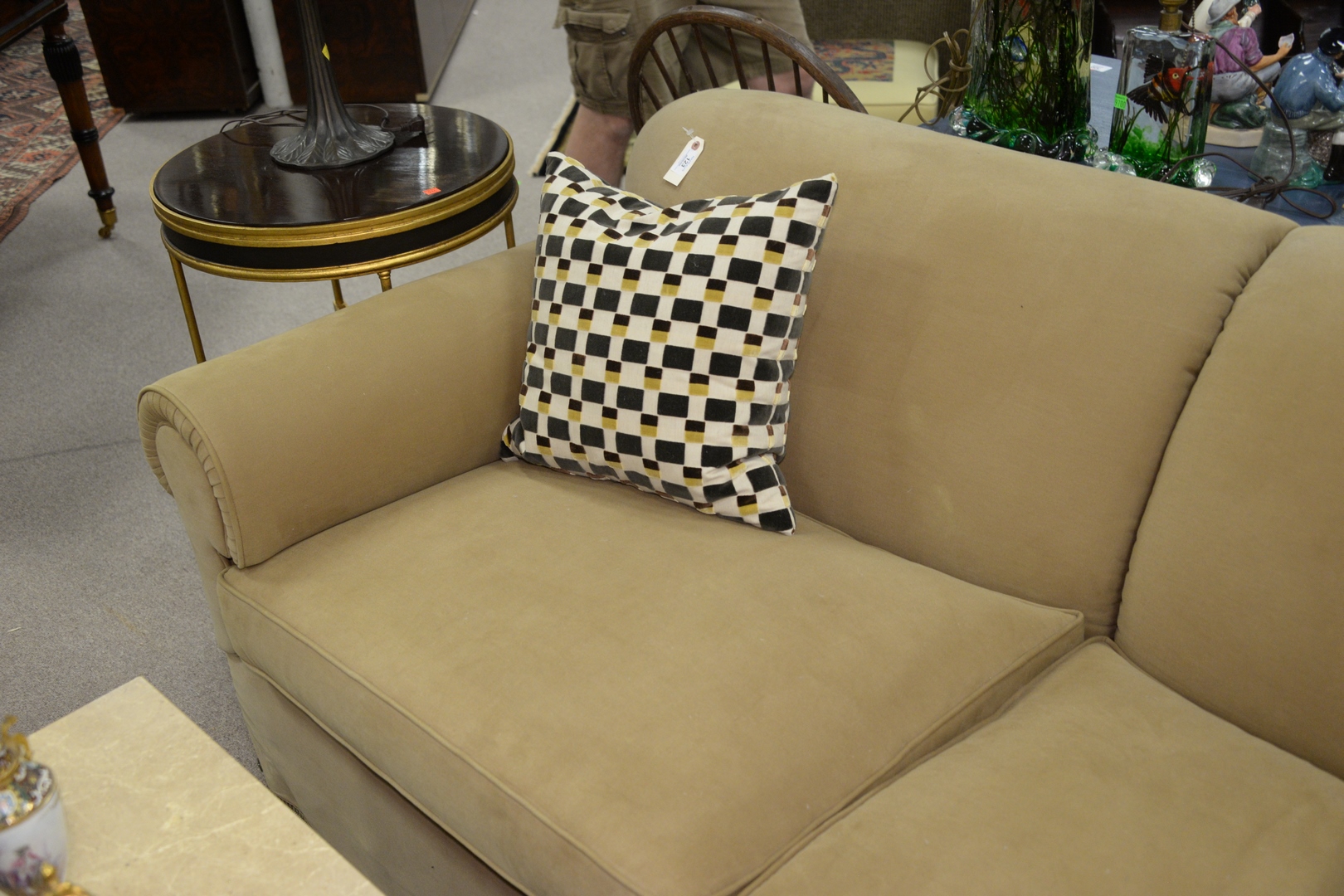 Lot 123: Edward Ferrell Custom Upholstered Sofa, tan upholstery with two cushions and two throw pillows, length 76 1/2 inches, depth 36 inches. Provenance: David and Cynthia Kim, 22 Stoney Wylde Lane, Greenwich, Connecticut. View home by visiting: https://www.zillow.com/homedetails/22-Stoney-Wylde-Ln-Greenwich-CT-06830/177238281_zpid/