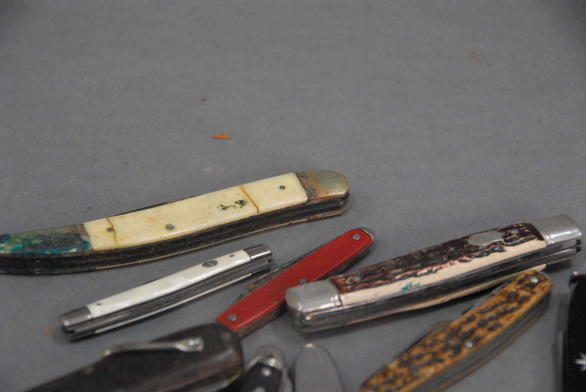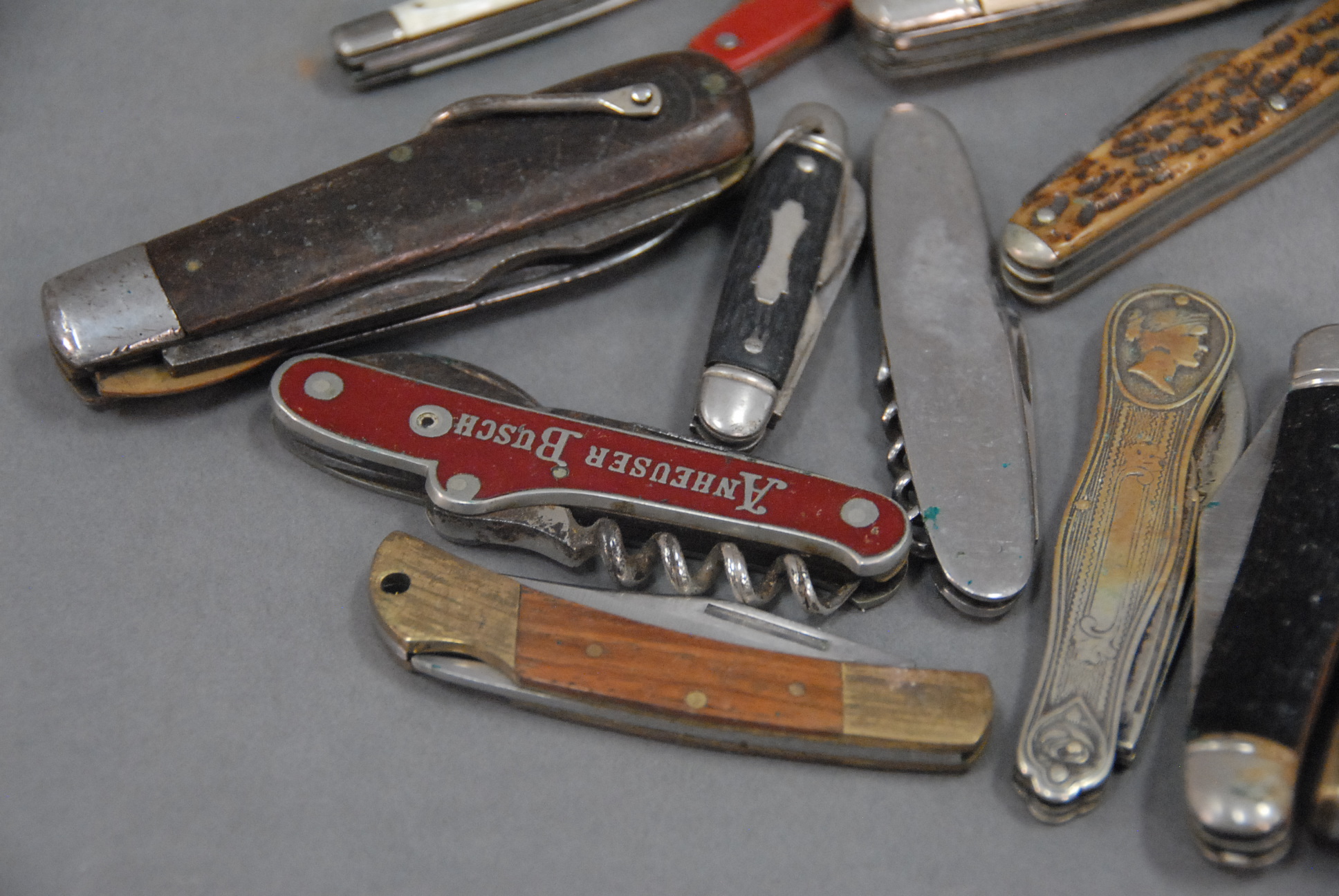 Fourteen piece grouping of jack-knives including red Anheuser Busch jack-knife with cork screw.