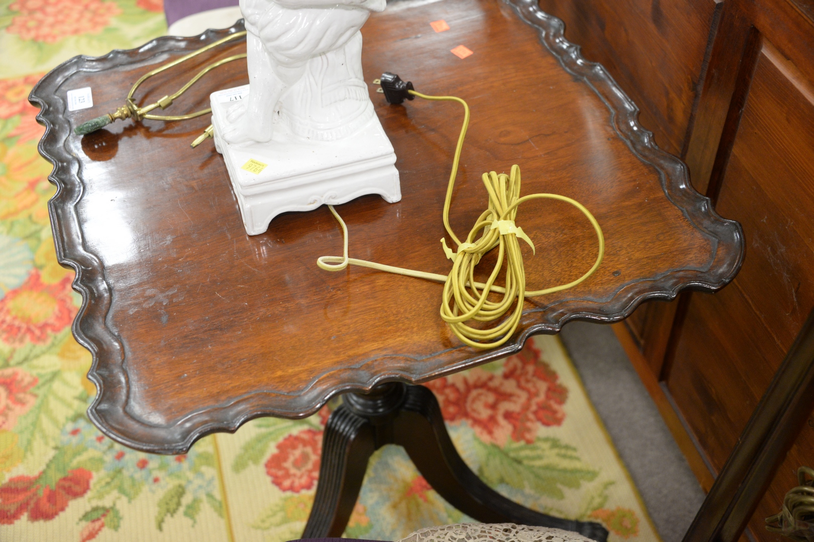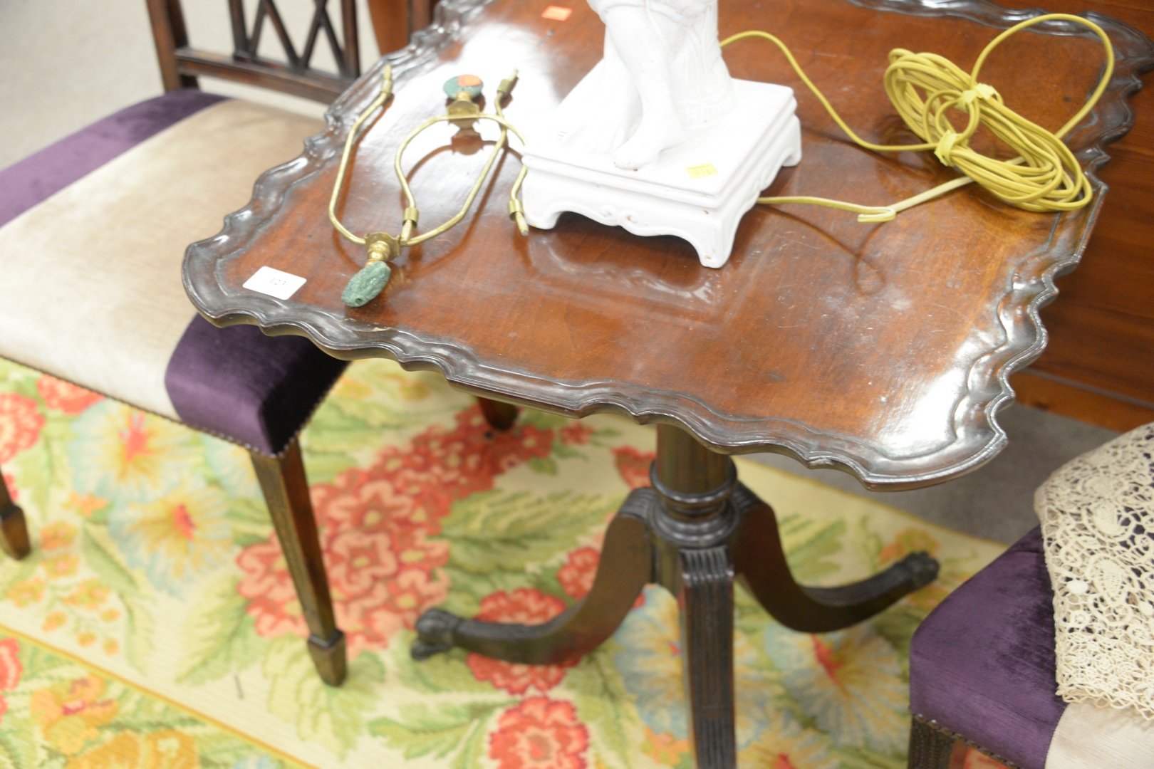 Lot 123: George II Mahogany Piecrust Tip Table, on turned shaft, on reeded downswept members, ending in brass paw feet, with 18th Century, he…