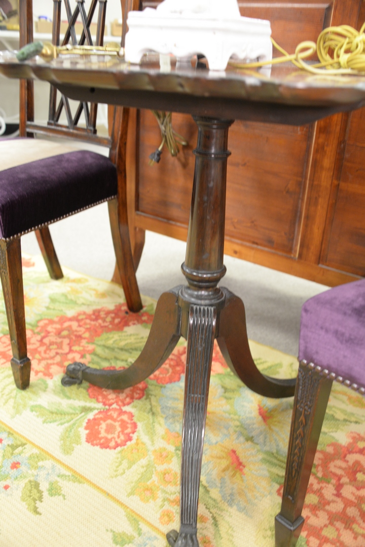 George II Mahogany Piecrust Tip Table, on turned shaft, on reeded downswept members, ending in brass paw feet, with 18th Century, height 28 inches, top 23 1/2 x 24.