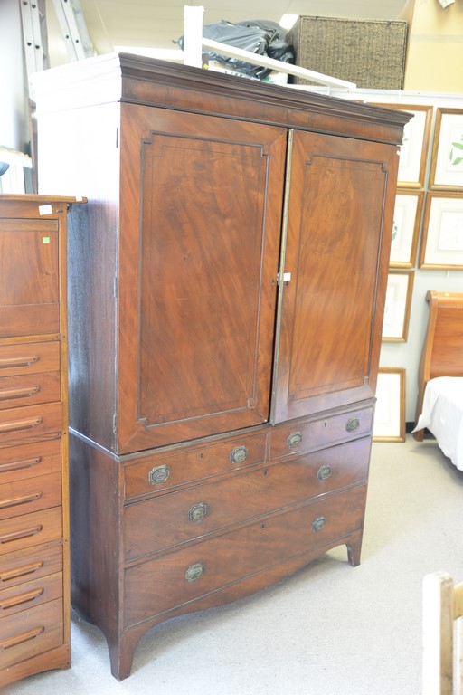 George IV mahogany linen press in two parts, two door cabinet with fitted drawer interior over three drawer base, circa 1800. ht. 79in., lg. 52 1/4in., wd. 23in.