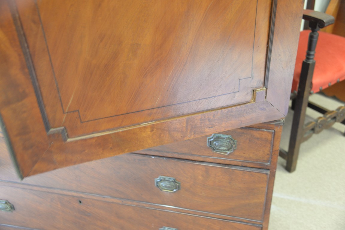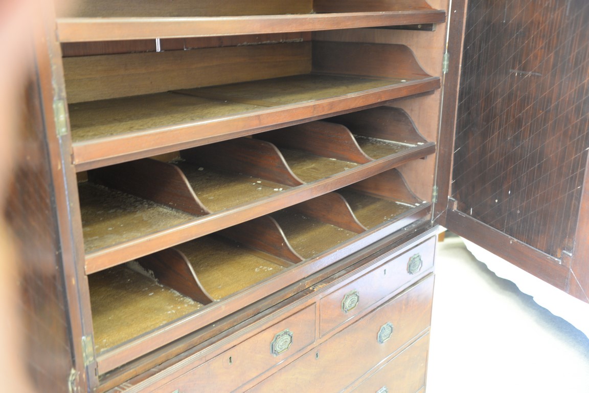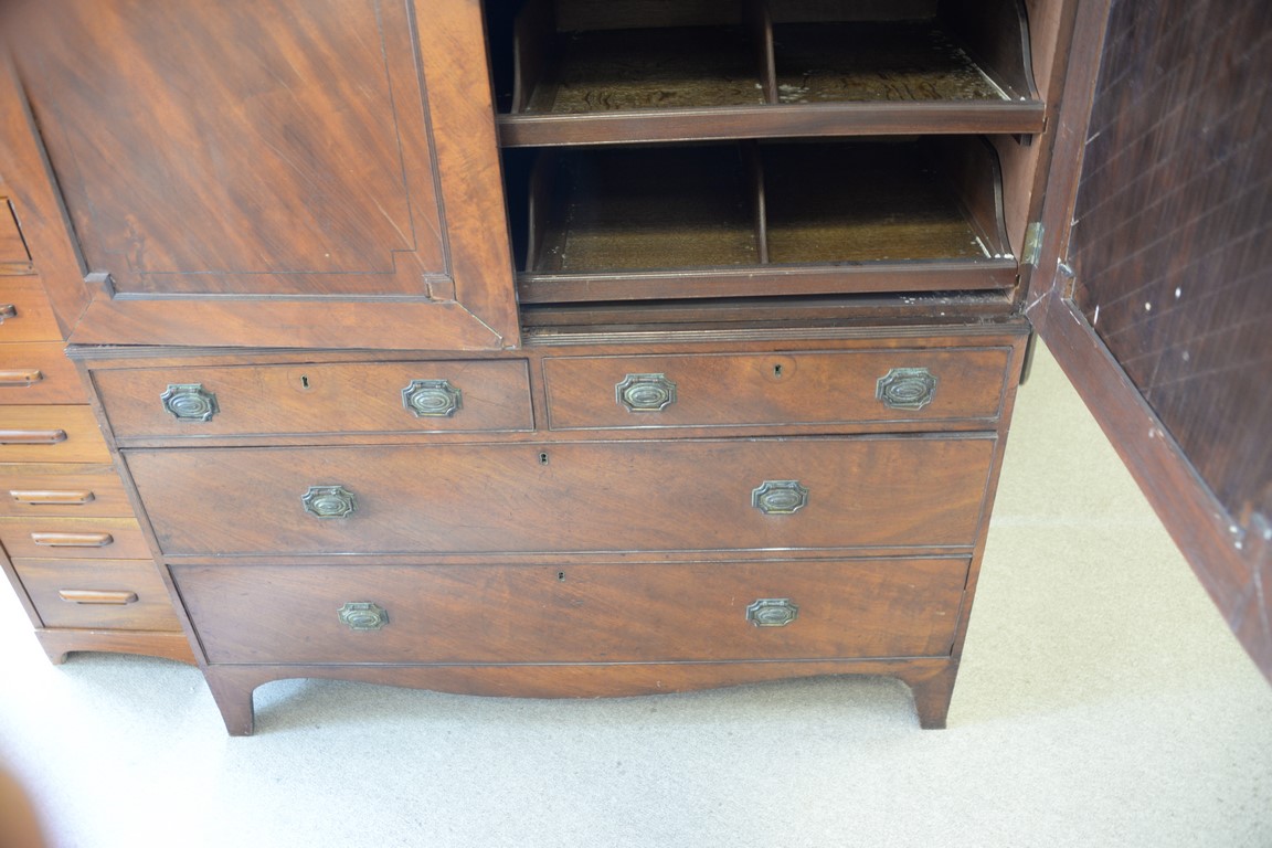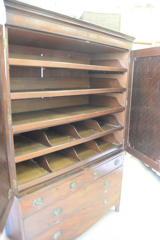Lot 123: George IV mahogany linen press in two parts, two door cabinet with fitted drawer interior over three drawer base, circa 1800. ht. 79…