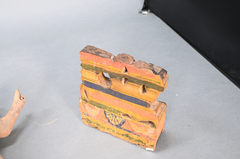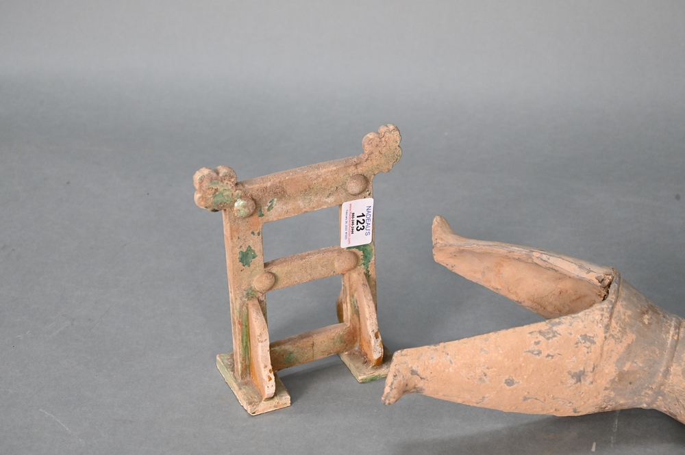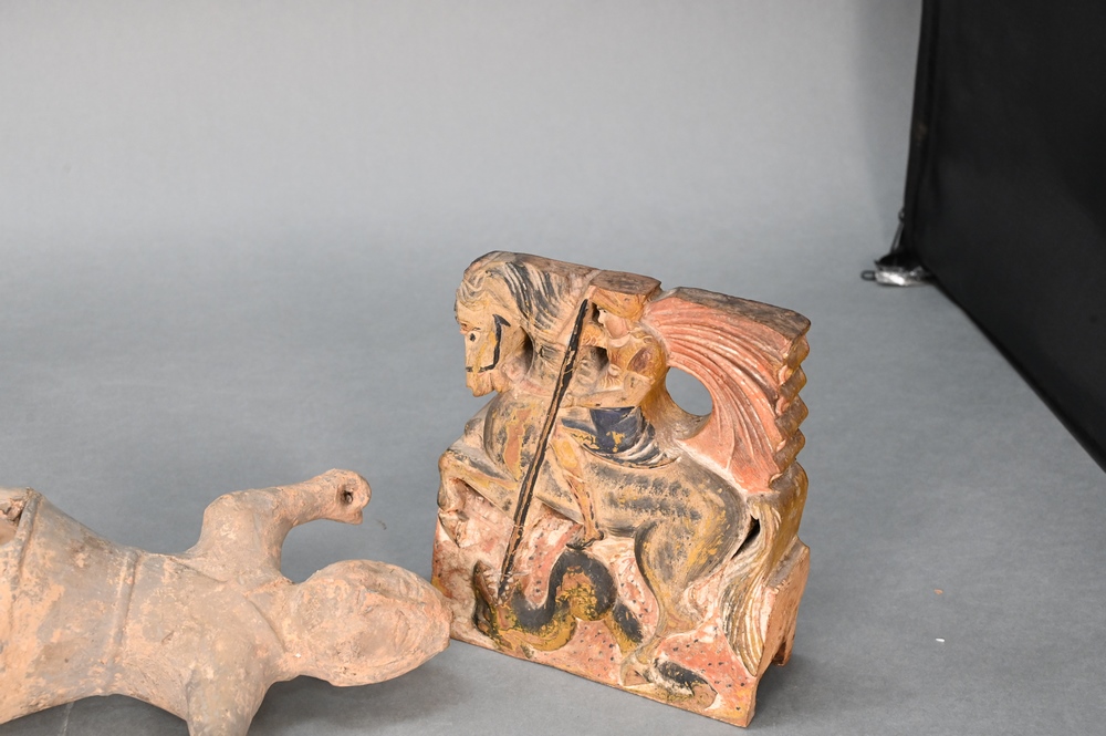 Lot 123: Group of Three Chinese Items, to include a Chinese glazed pottery rack, Ming period, height 8 inches, width 6 1/4 inches; a terracotta figure, height 13 inches; along with a carved and painted wood warrior on horse height 8 inches, Ancient Art International certificate of authenticity and receipt for pottery clothes rack. Provenance: From a private New York City collection.