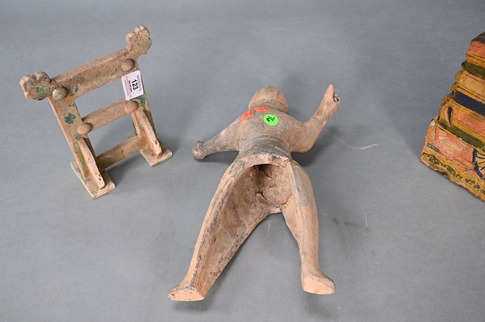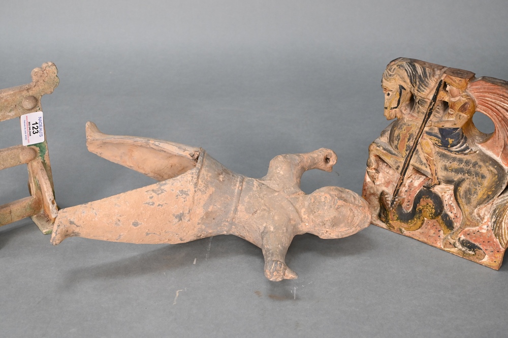 Group of Three Chinese Items, to include a Chinese glazed pottery rack, Ming period, height 8 inches, width 6 1/4 inches; a terracotta figure, height 13 inches; along with a carved and painted wood warrior on horse height 8 inches, Ancient Art International certificate of authenticity and receipt for pottery clothes rack. Provenance: From a private New York City collection.
