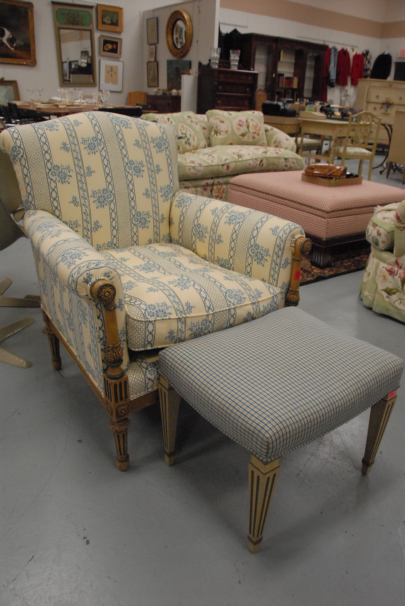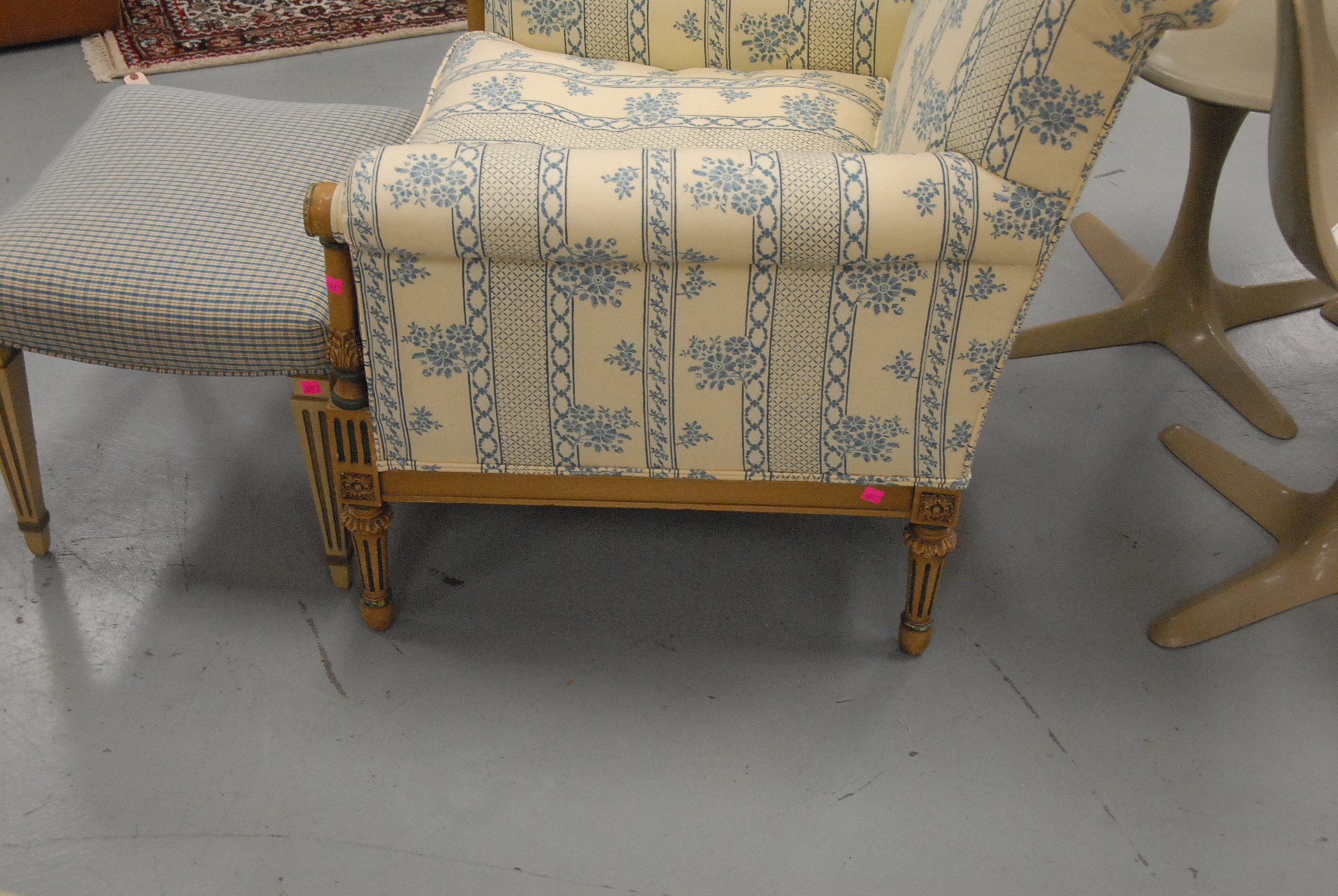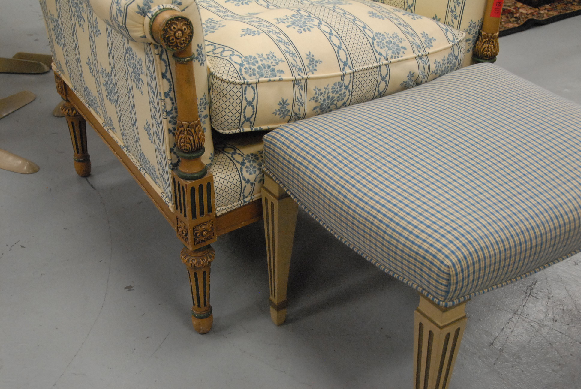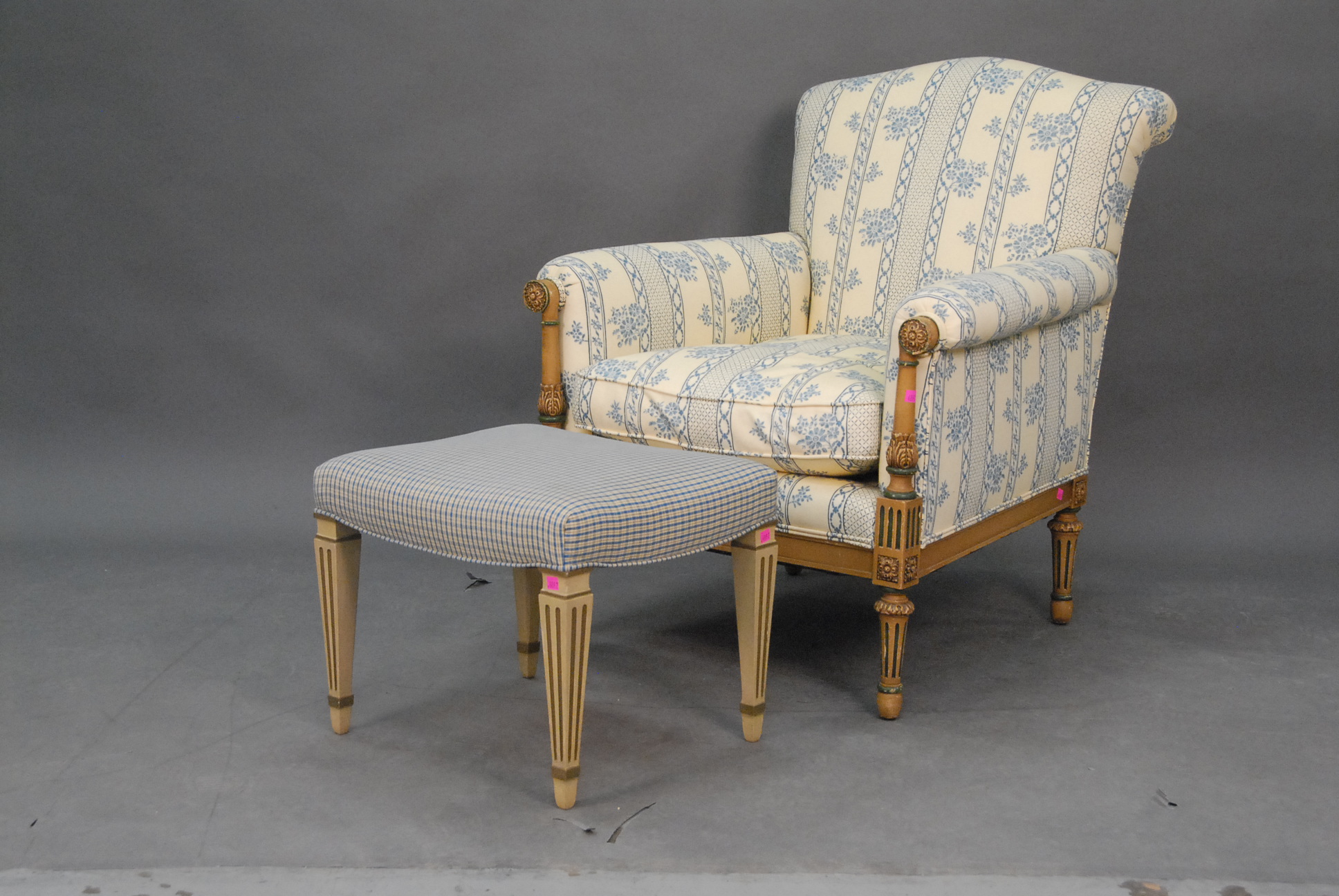 Lot 123: Louis XVI style upholstered armchair and non-matching footstool, chairs in custom upholstery.