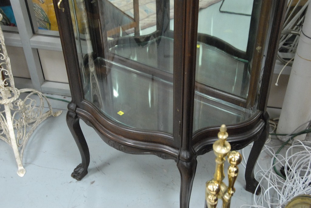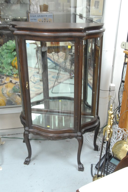 Lot 123: Mahogany curio cabinet with serpentine sides and serpentine front glass, glass shelves, and mirrored back, ht. 51in. wd. 32in.