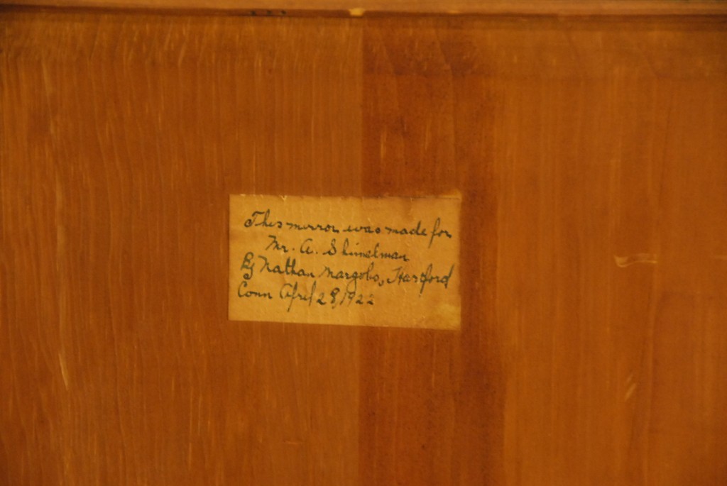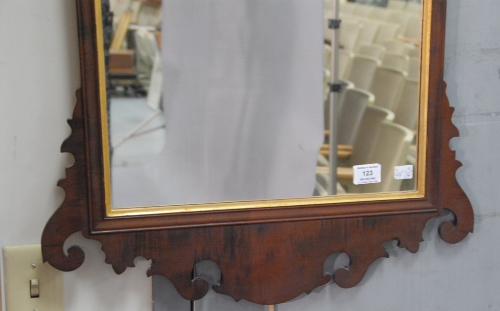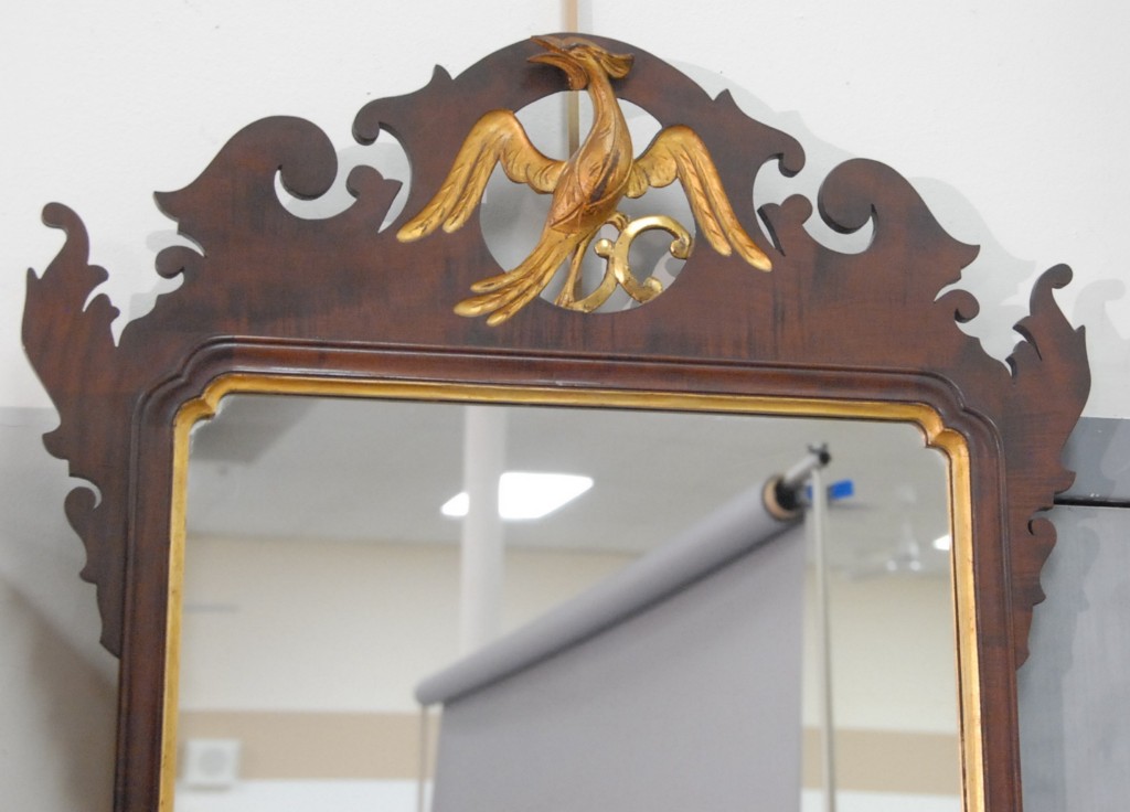 Margolis mahogany Chippendale style mirror with gilt phoenix bird, signed top reverse N. Margolis 1922. height 44in. width 24in.