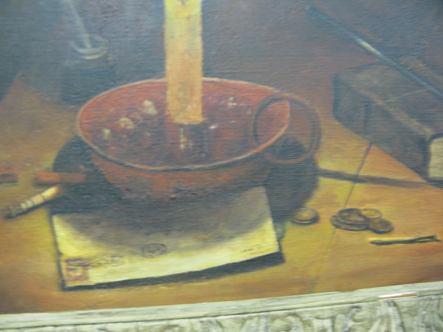 Oil on canvas, trompe l’oeil, style life, including a book, pipe, coins, letter, candle and a quill pen.