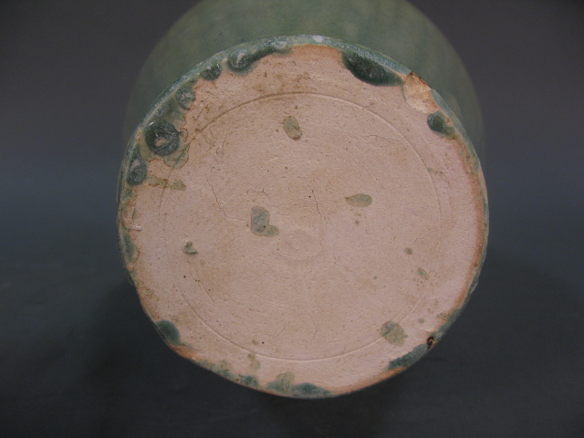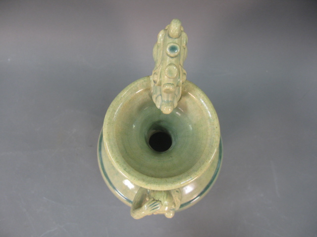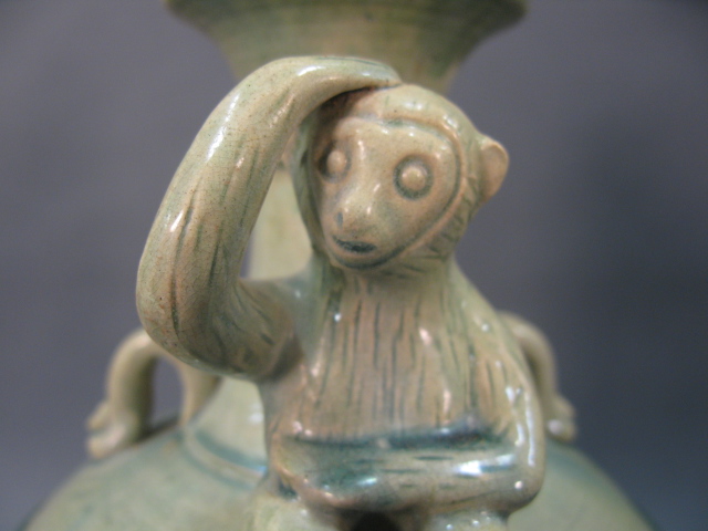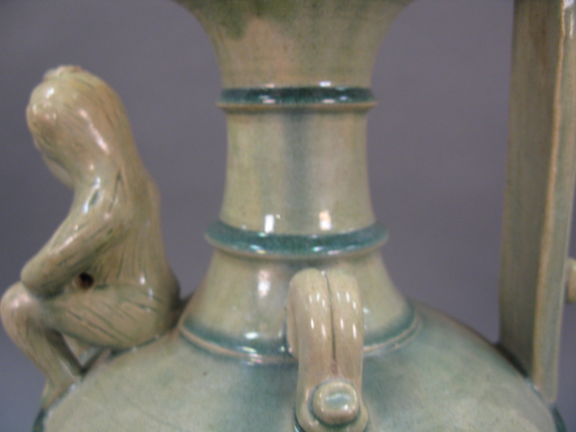 Oriental green glazed dragon-ears base having molded dragon handle and molded monkey figure on front.