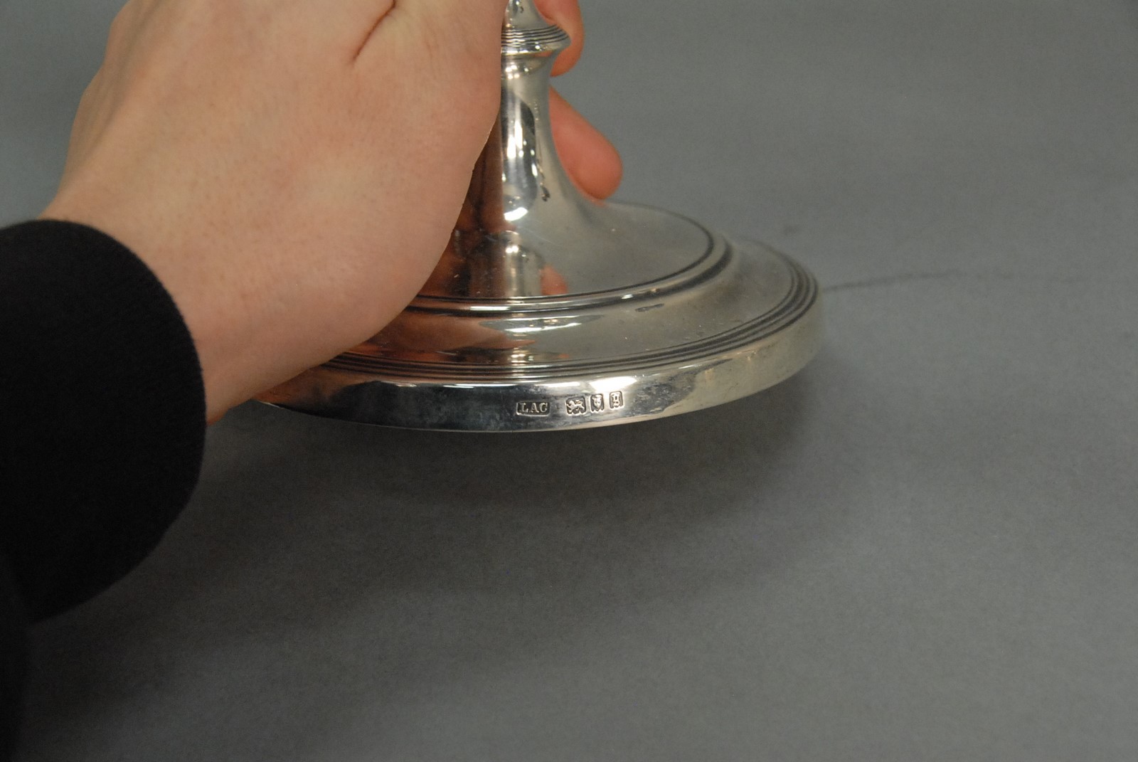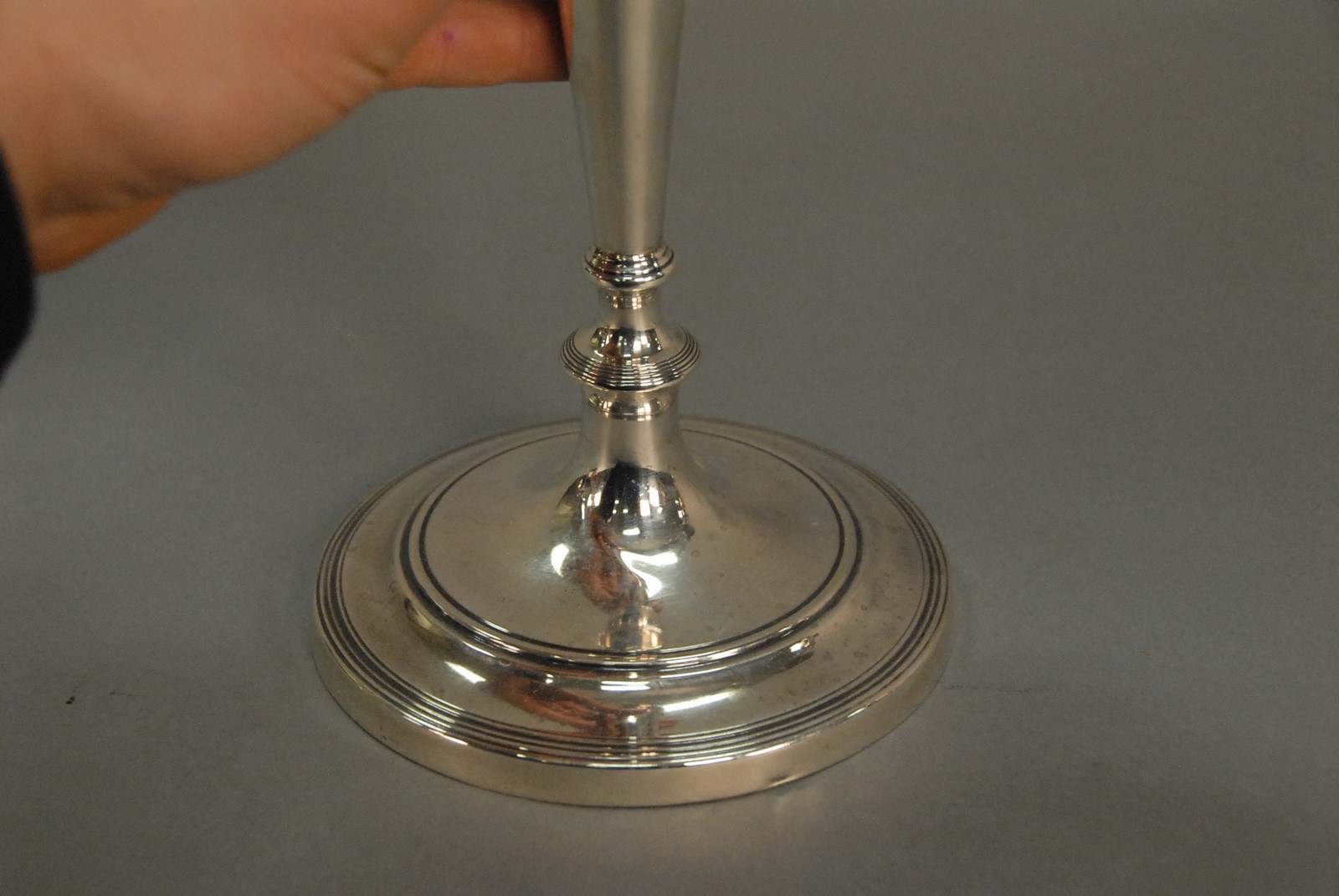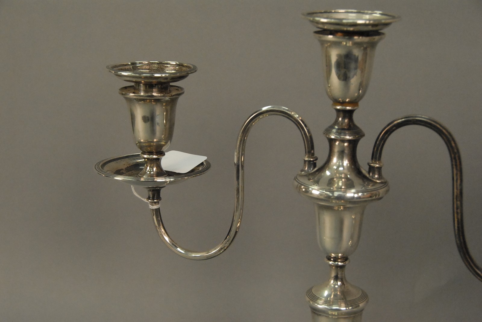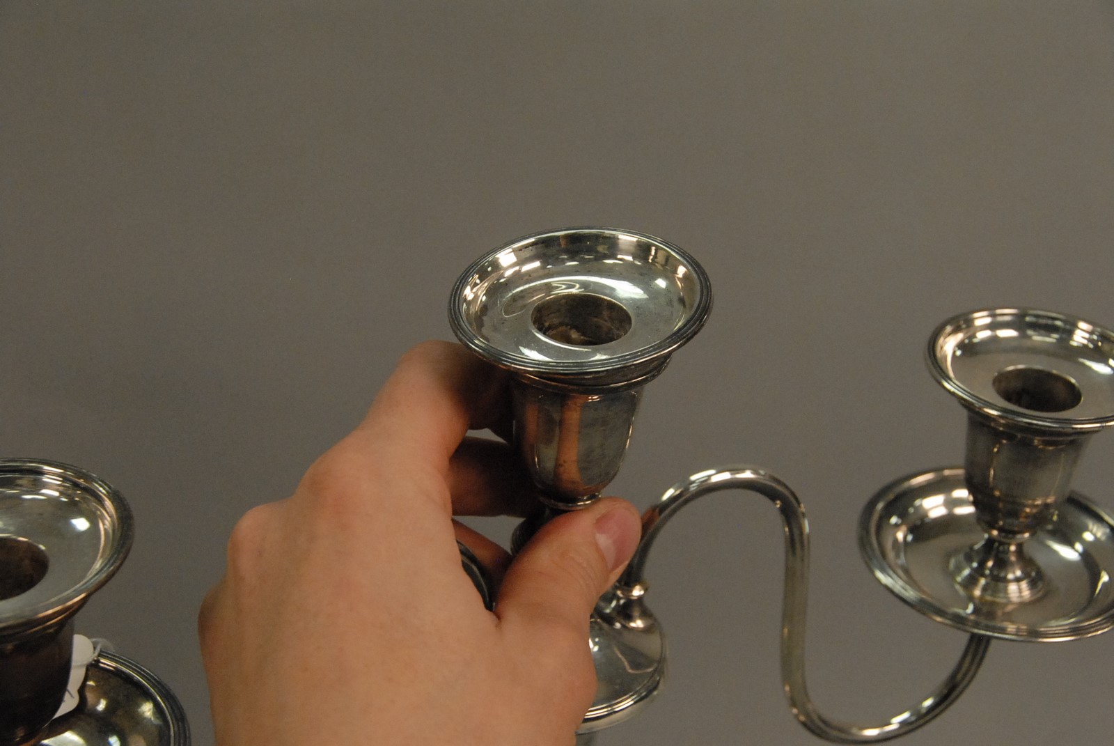 Lot 123: Pair of Crichton sterling silver three light candelabras one bobeche slightly bent. ht. 15 1/2in.