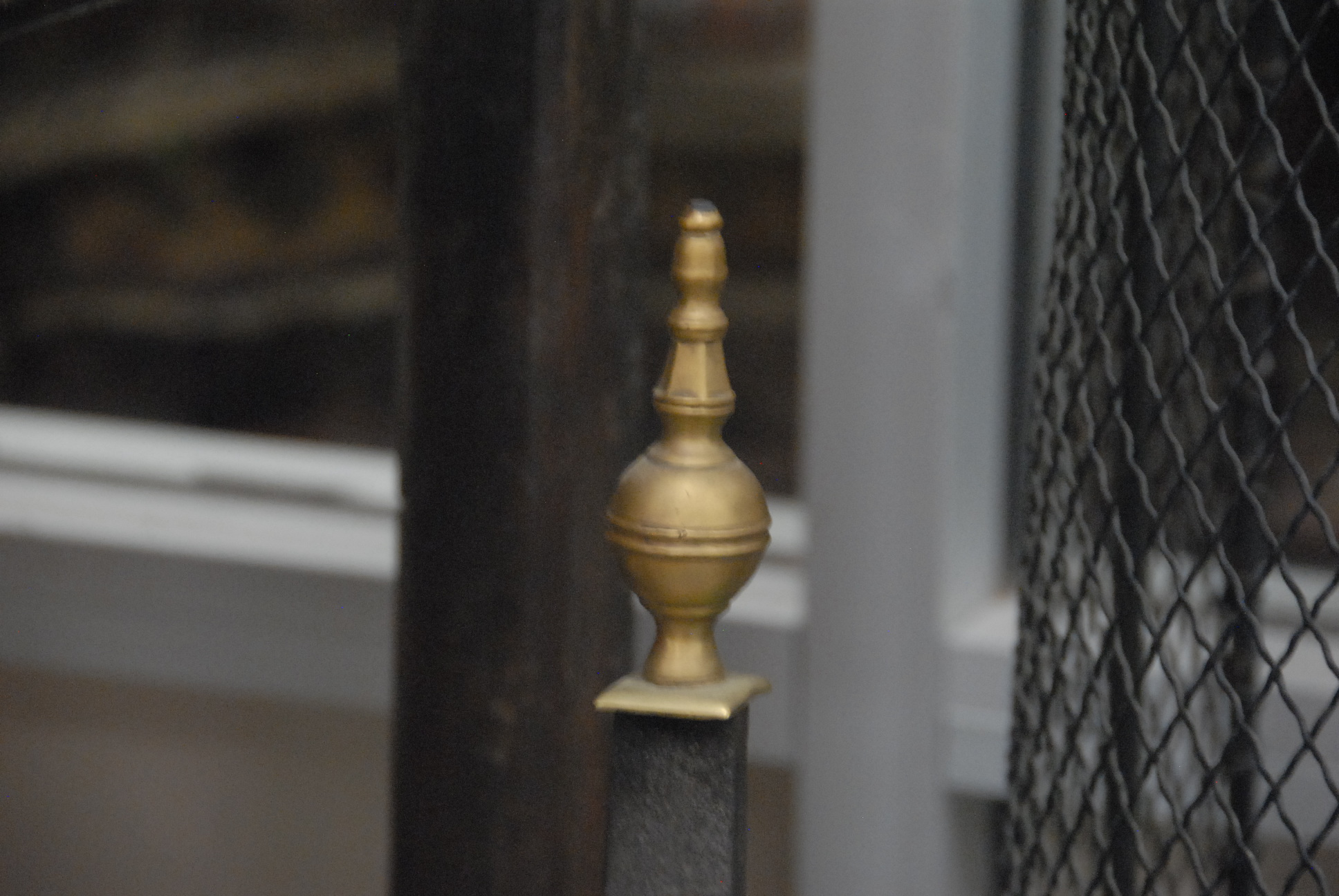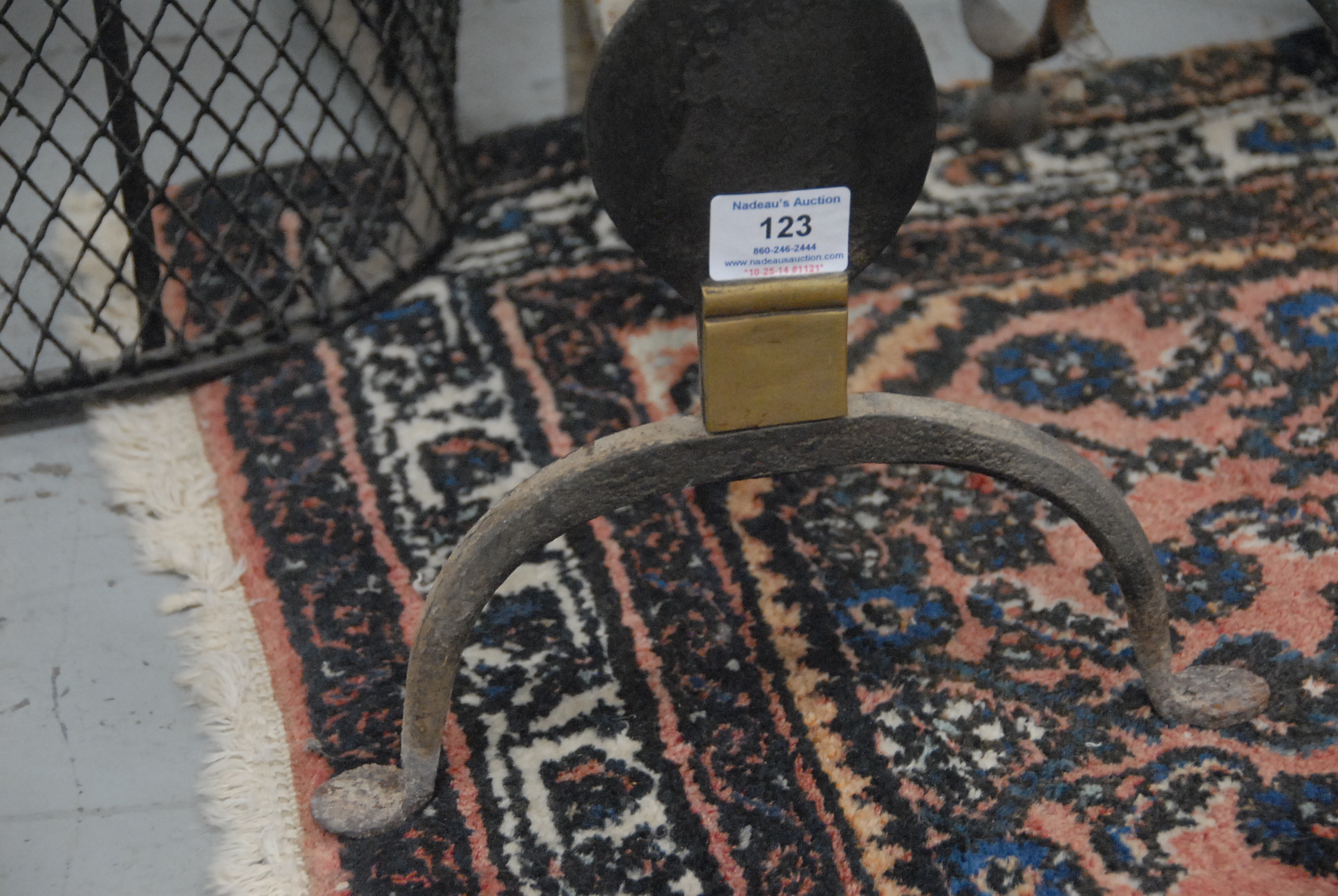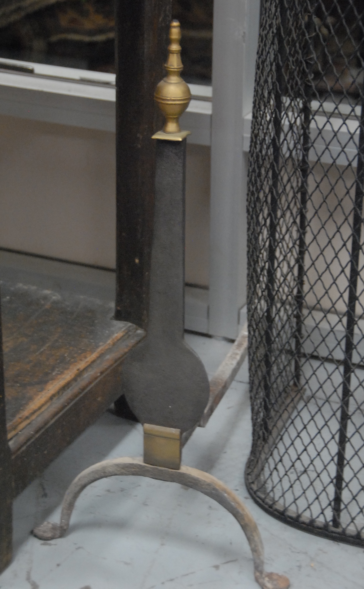 Pair of Federal iron knife blade andirons with brass finials, circa 1820. ht. 22 in.
