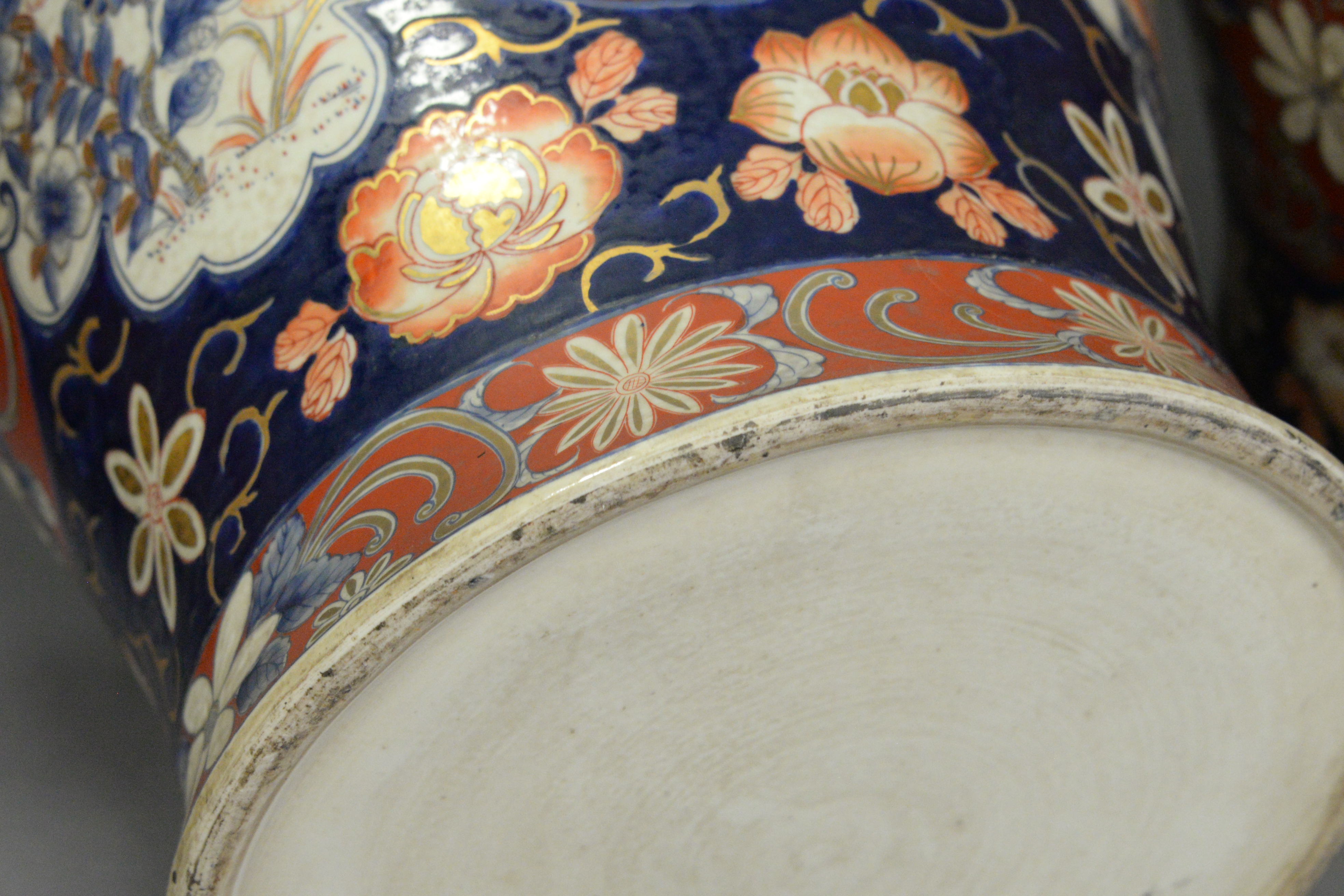 Pair Of Large Imari Porcelain Baluster Covered Vases, height 25 1/2 inches