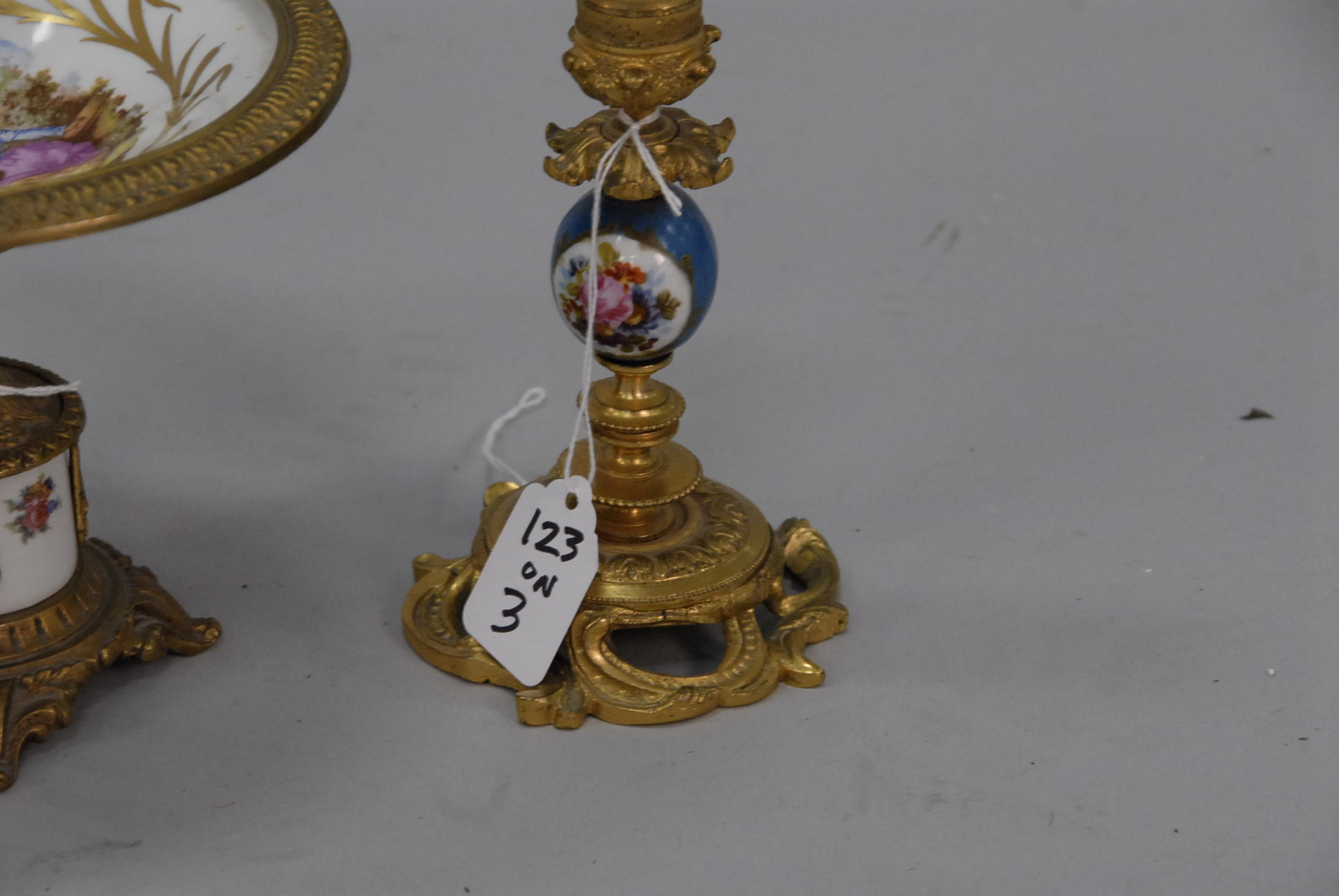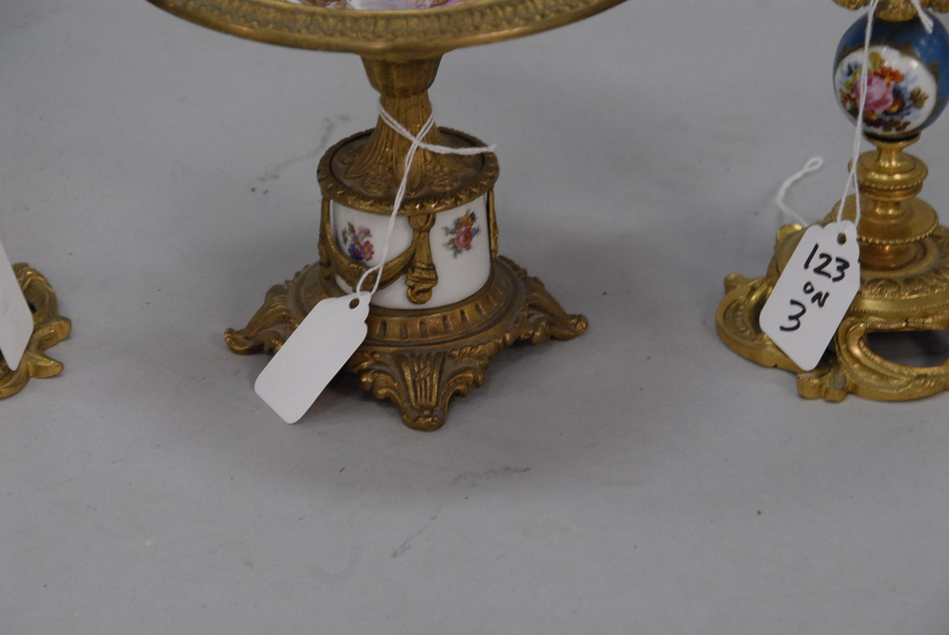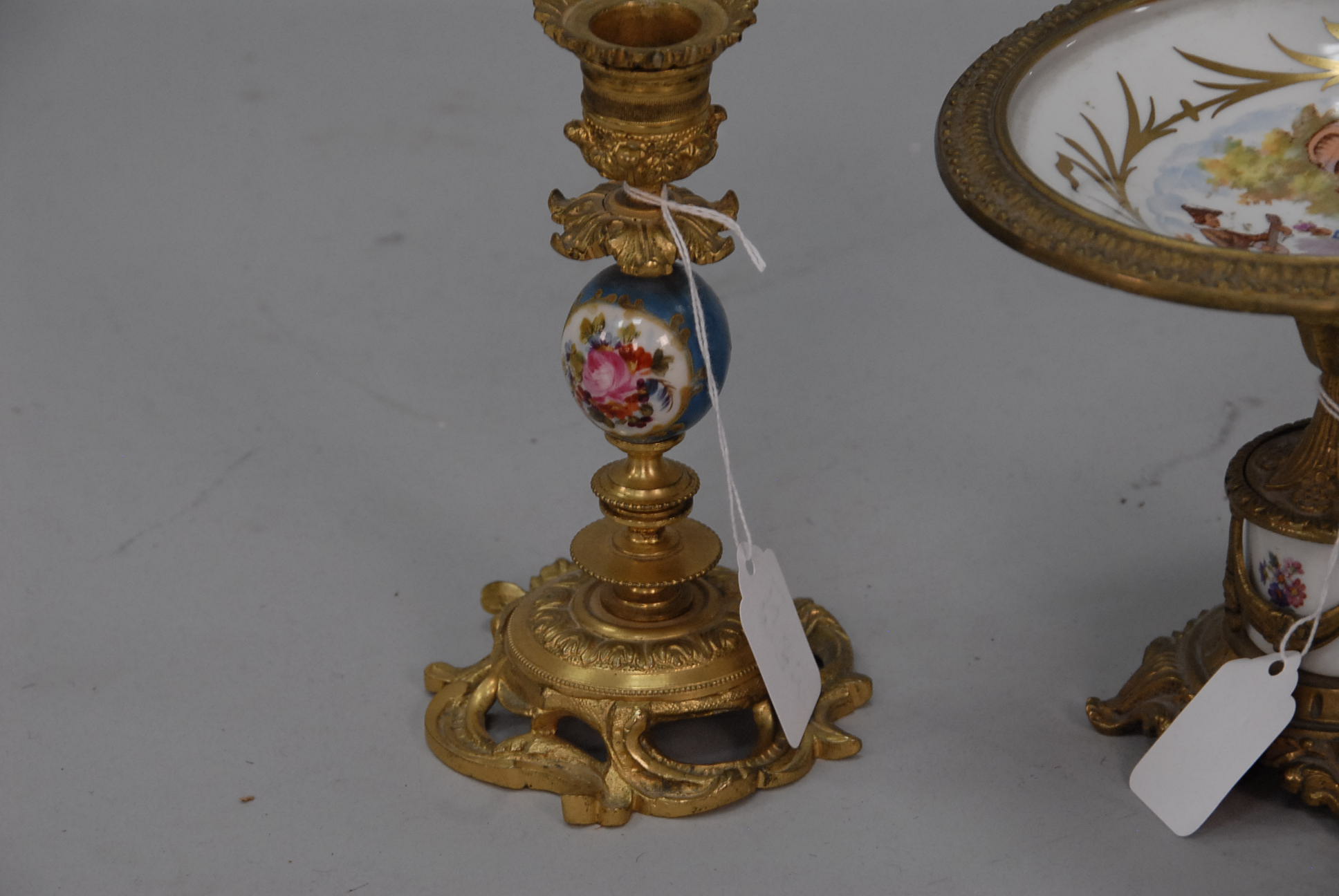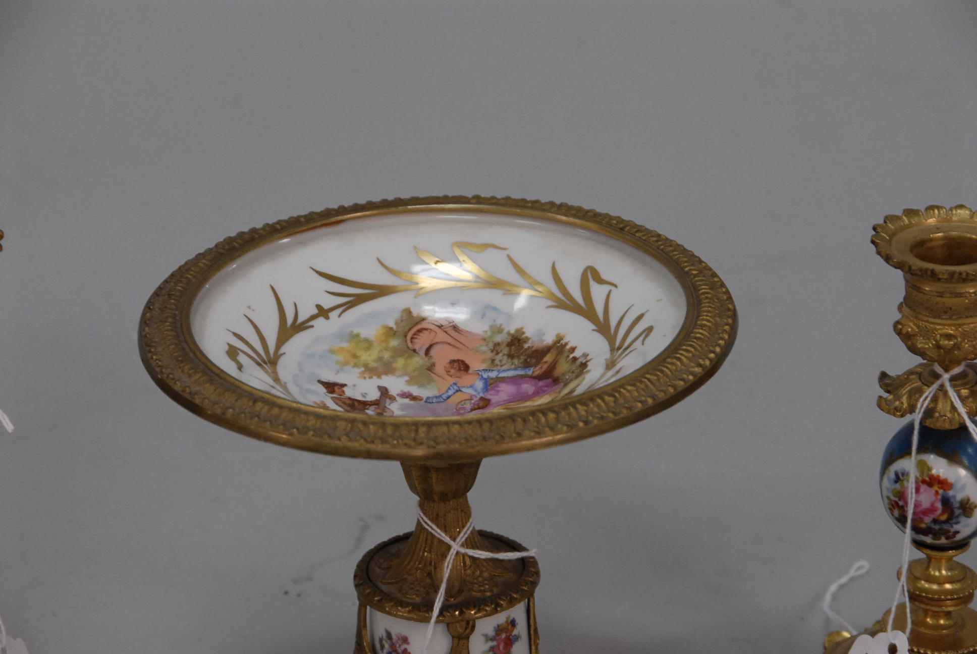 Porcelain Sevres style metal mounted compote along with a pair of similar candlesticks