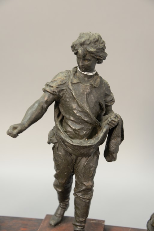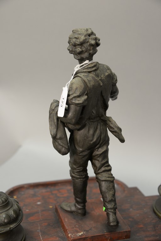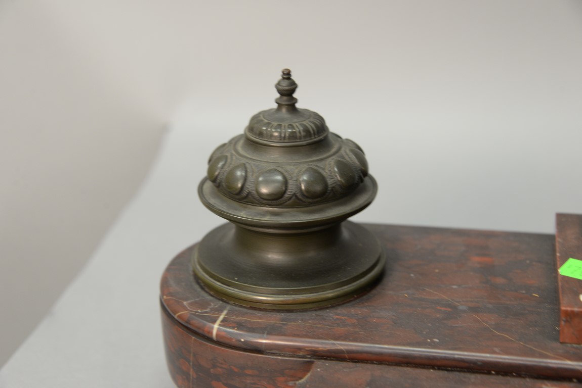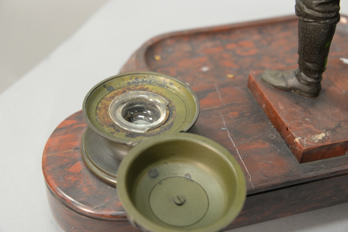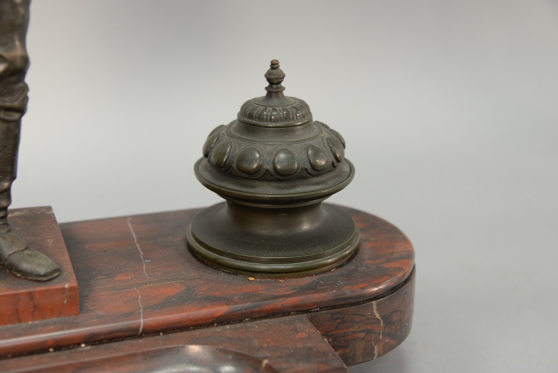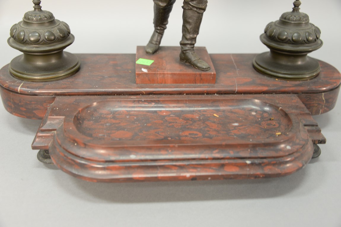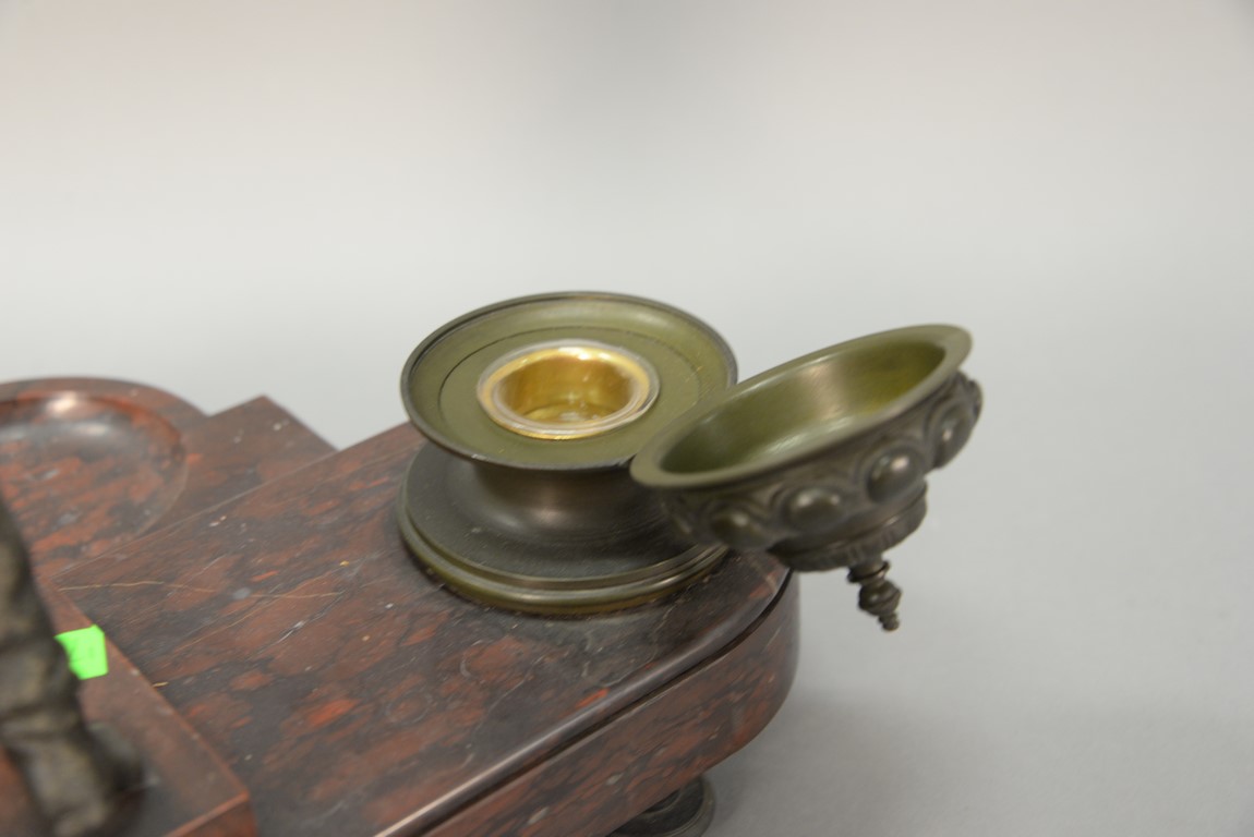 Lot 123: Rouge marble figural ink well set with white metal figure and two bronze inkwells. ht. 15in. 17 3/4in.