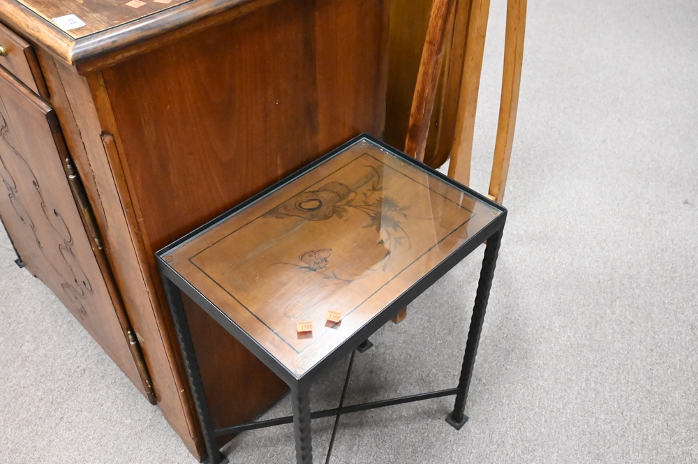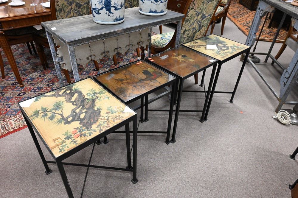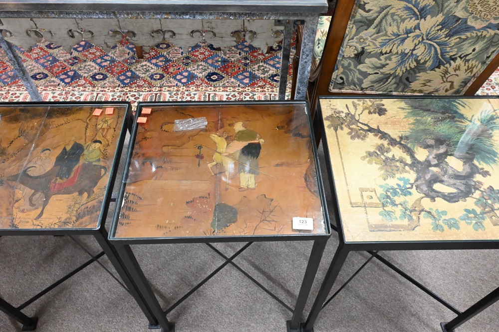 Three Pairs of Iron Glass Top Tables, having Oriental design panels, largest 24 inches, top 16 1/2″ x 18 1/2″.