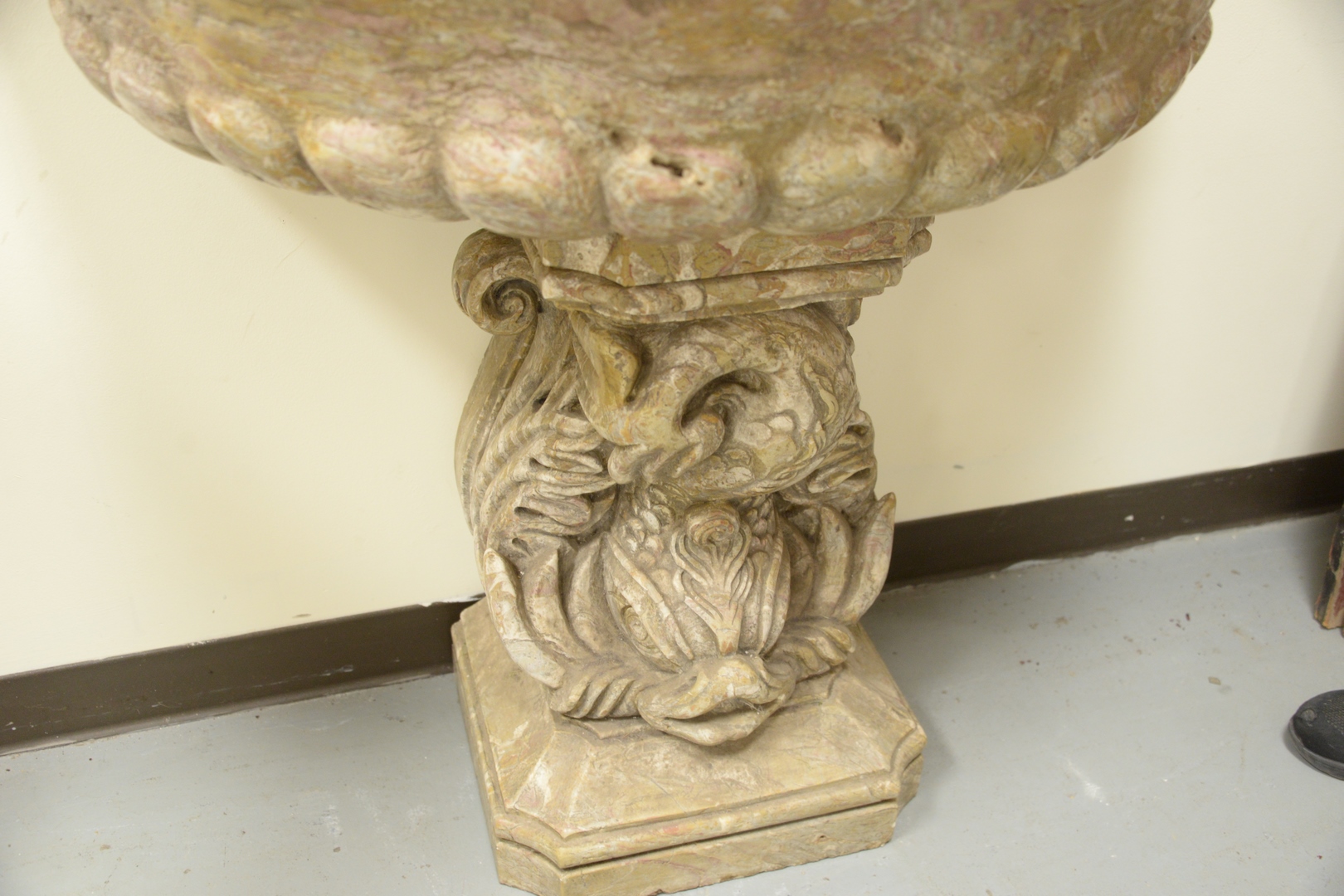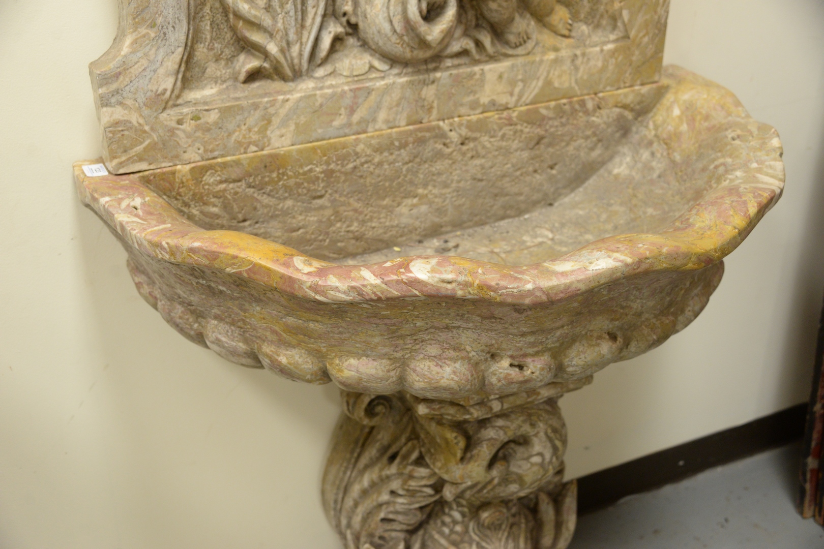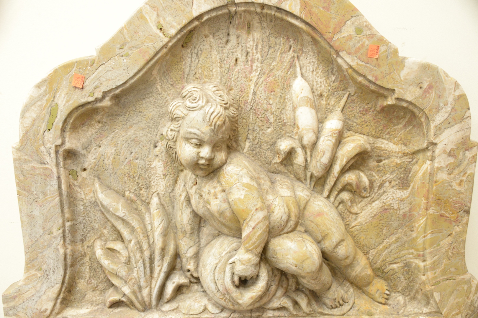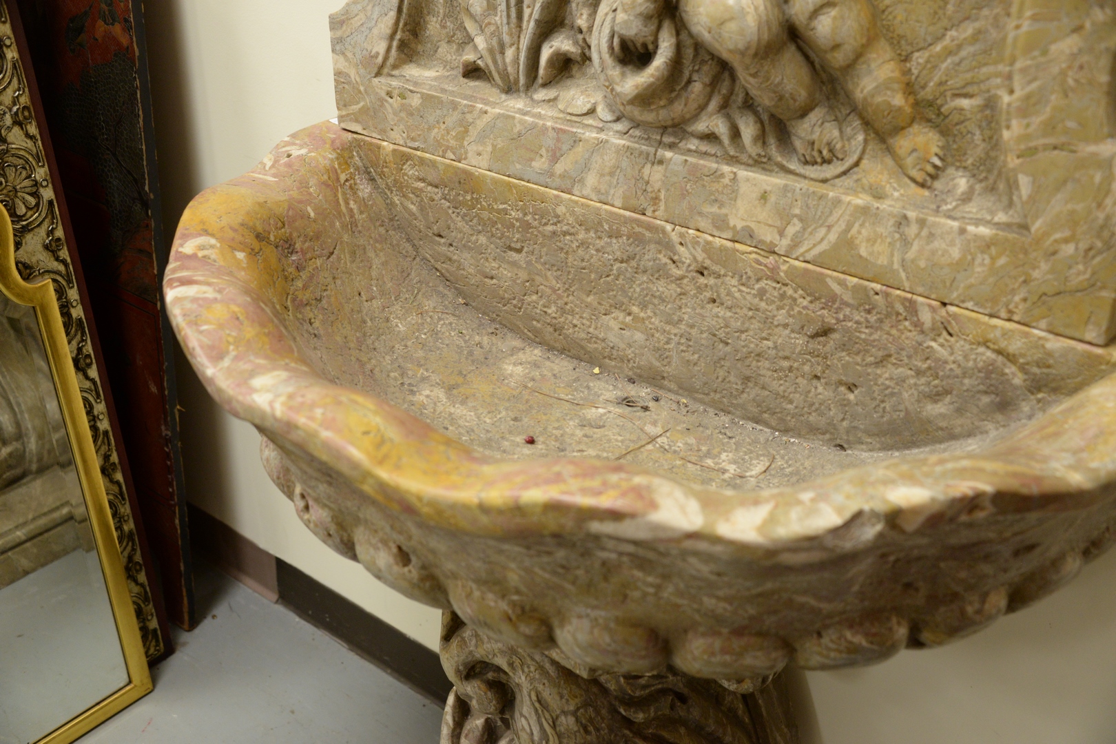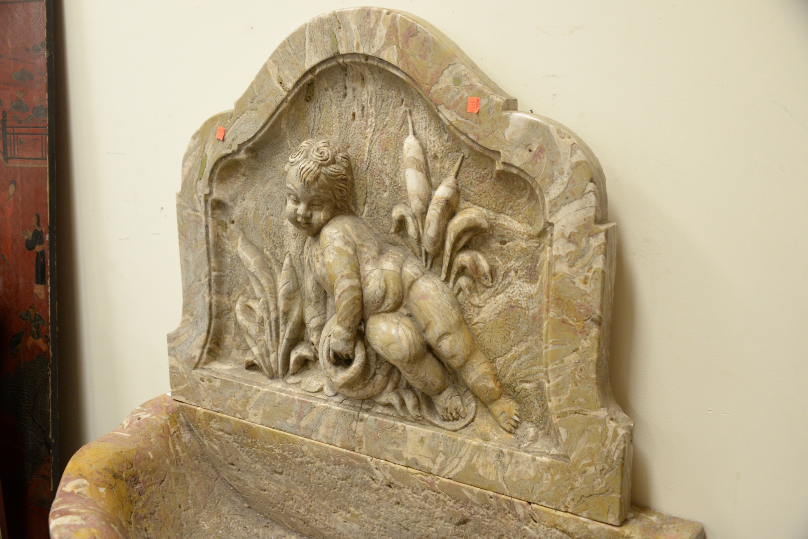 Lot 123: Three Piece Marble Fountain, having wall mounted putti fountain over scalloped oval bowls set on dolphin carved pedestal, probably 18th century or earlier.