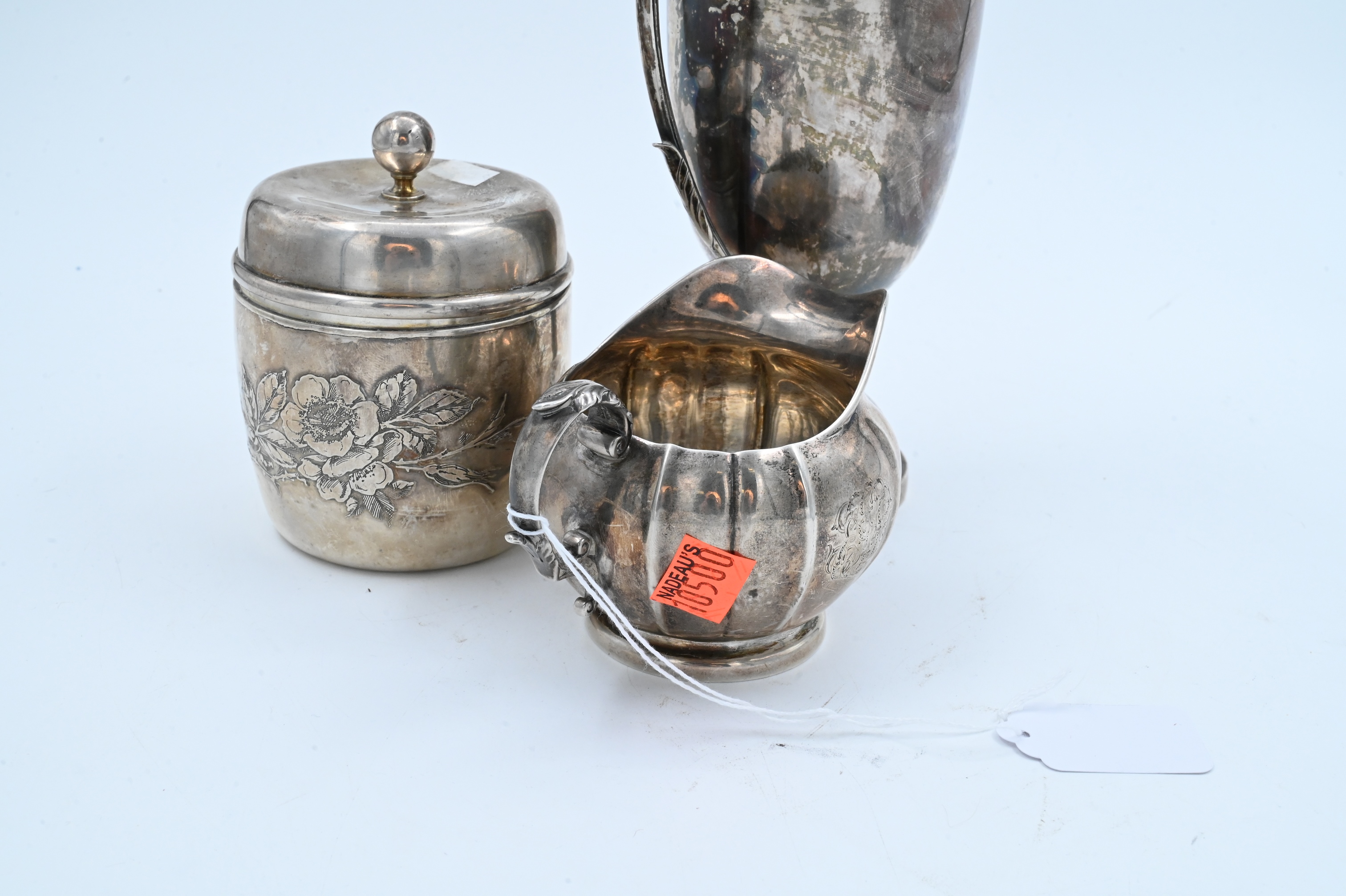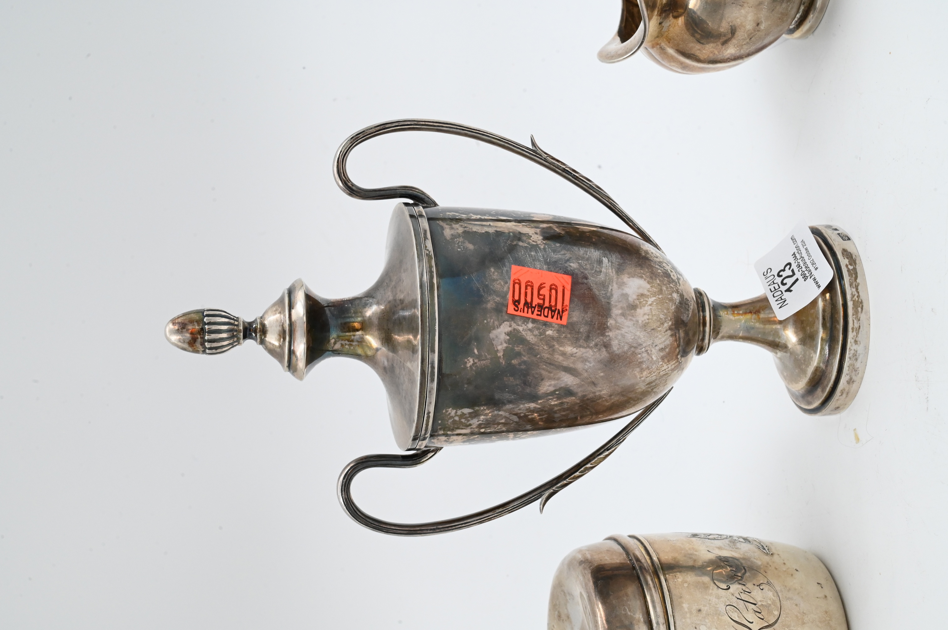 Lot 123: Three Piece Silver Lot with Covered Urn, Creamer, and Covered Sugar