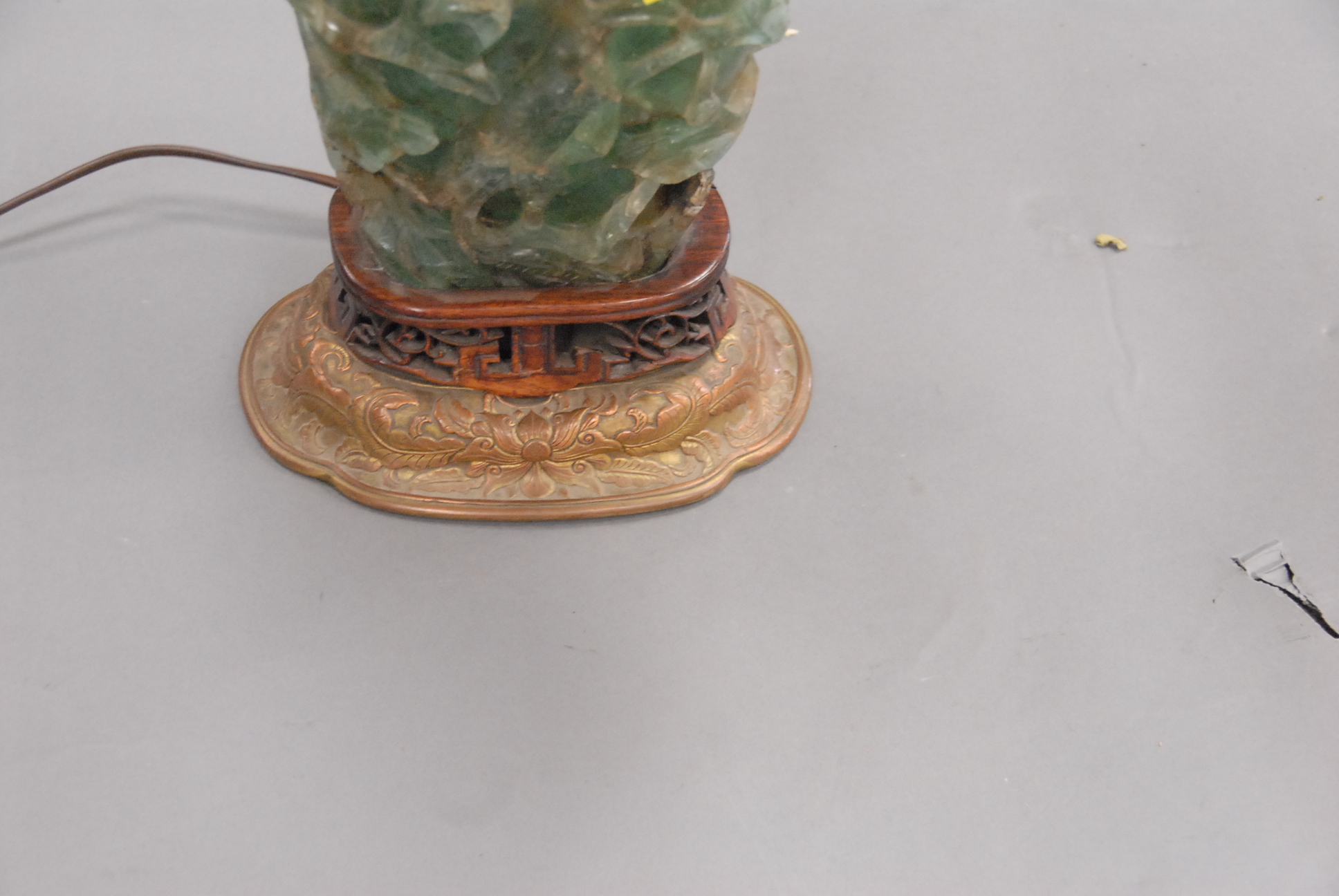 Two Oriental lamps, jadeite green quartz lamp and a soapstone figure made into a lamp.