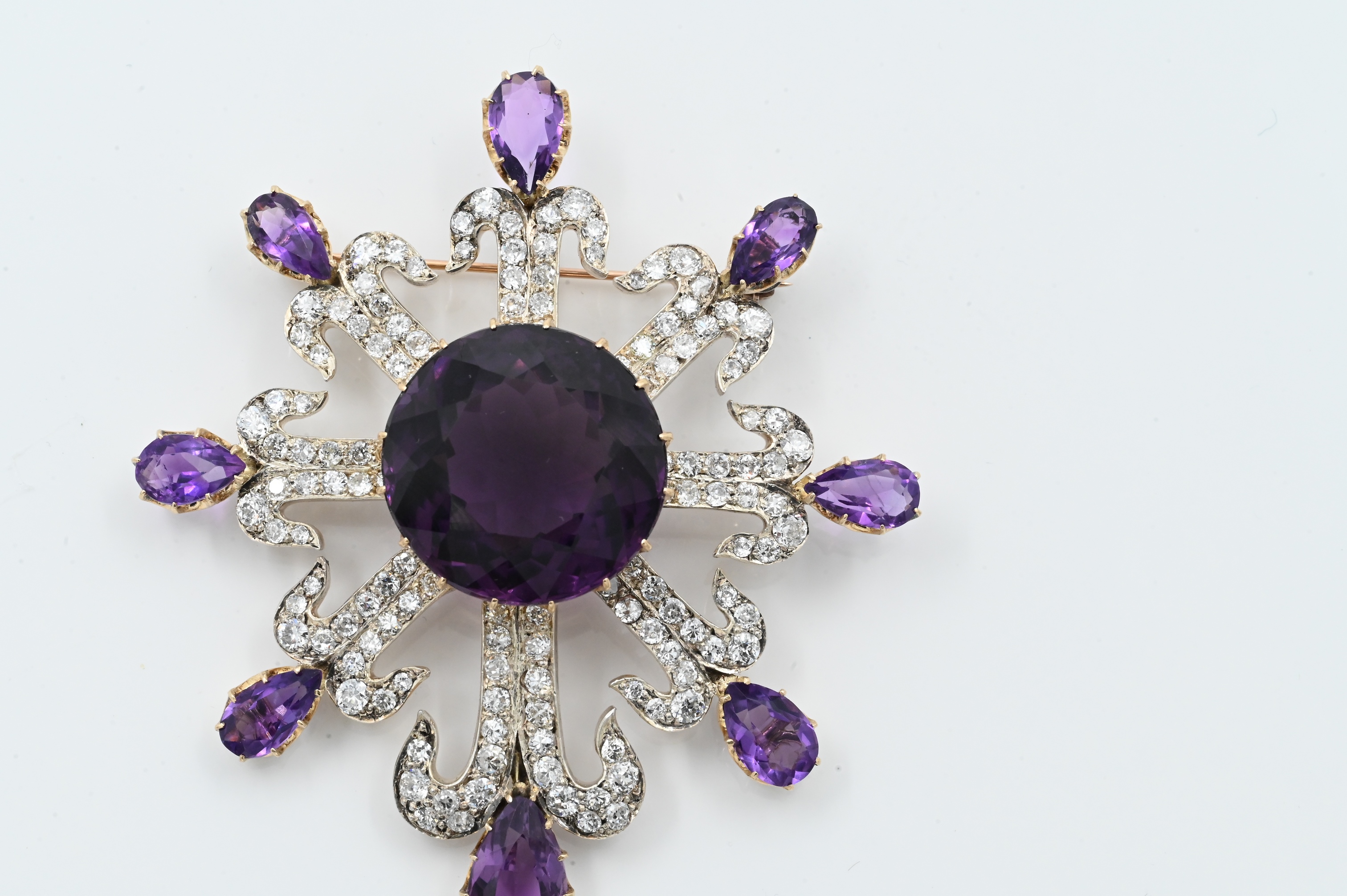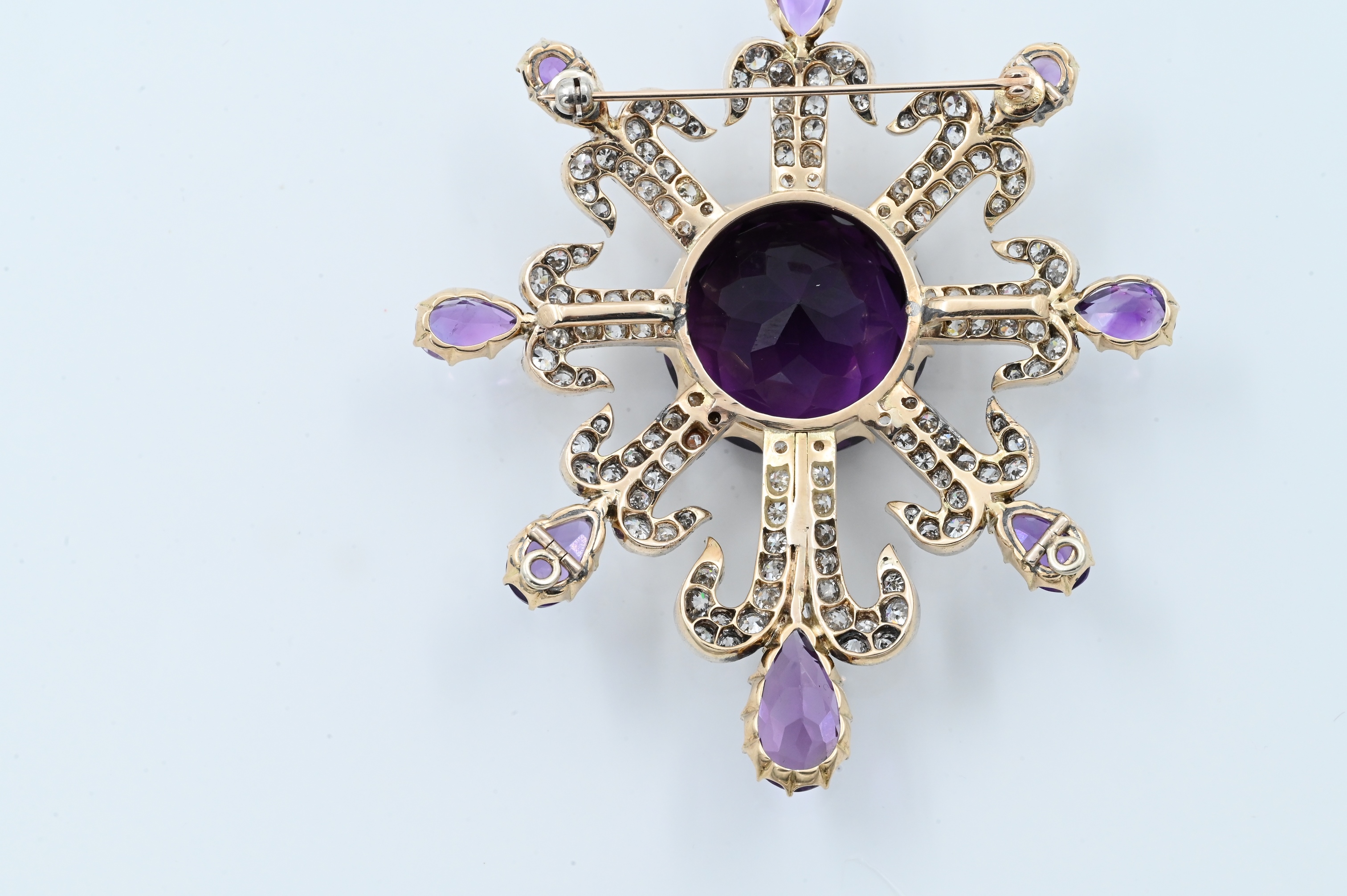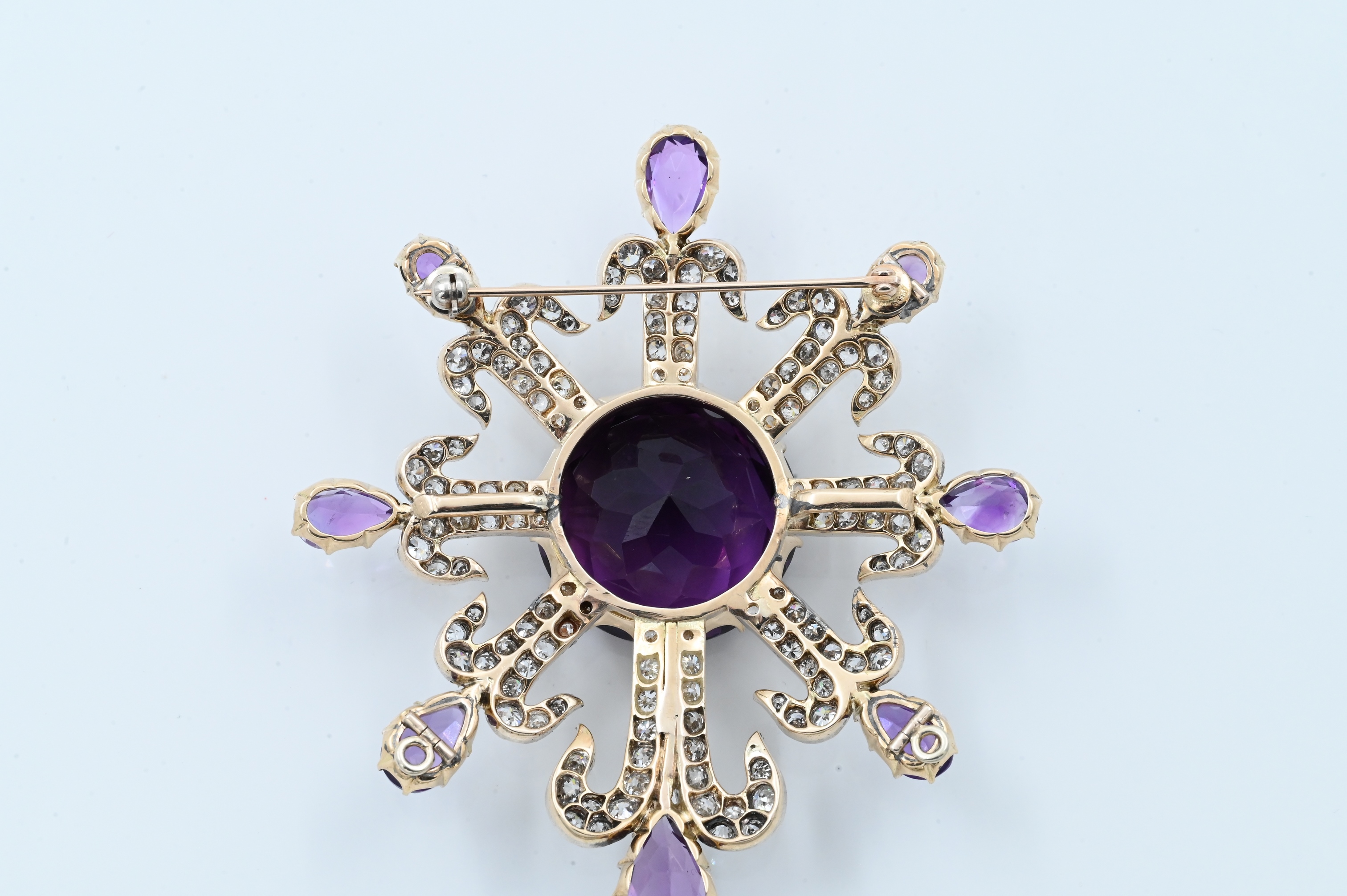 set with center amethyst approximately 14 carats surrounded by diamond set drops ending in pear cut amethysts, 136 melee diamonds (one missing), total weight 46.1 grams
