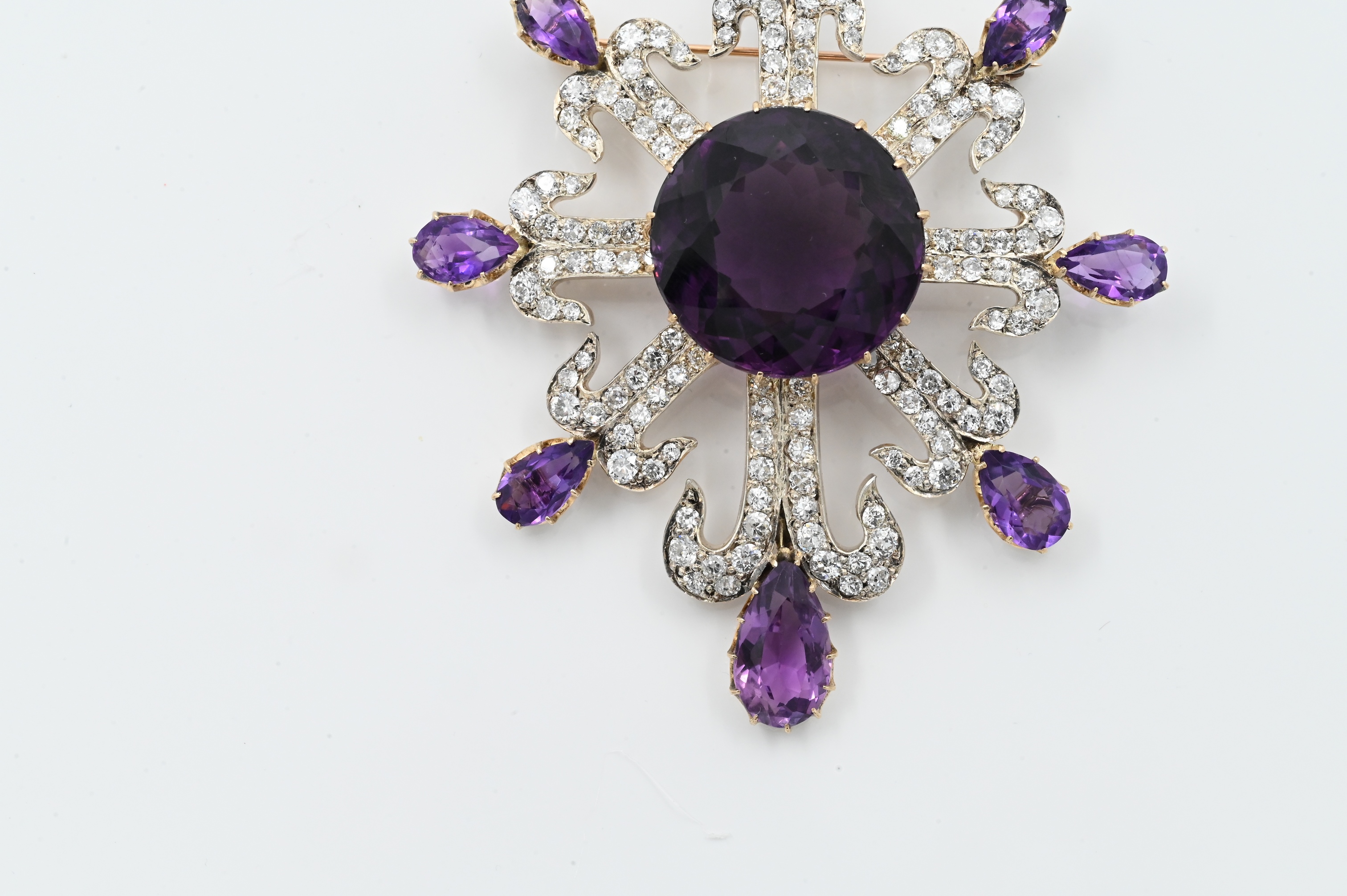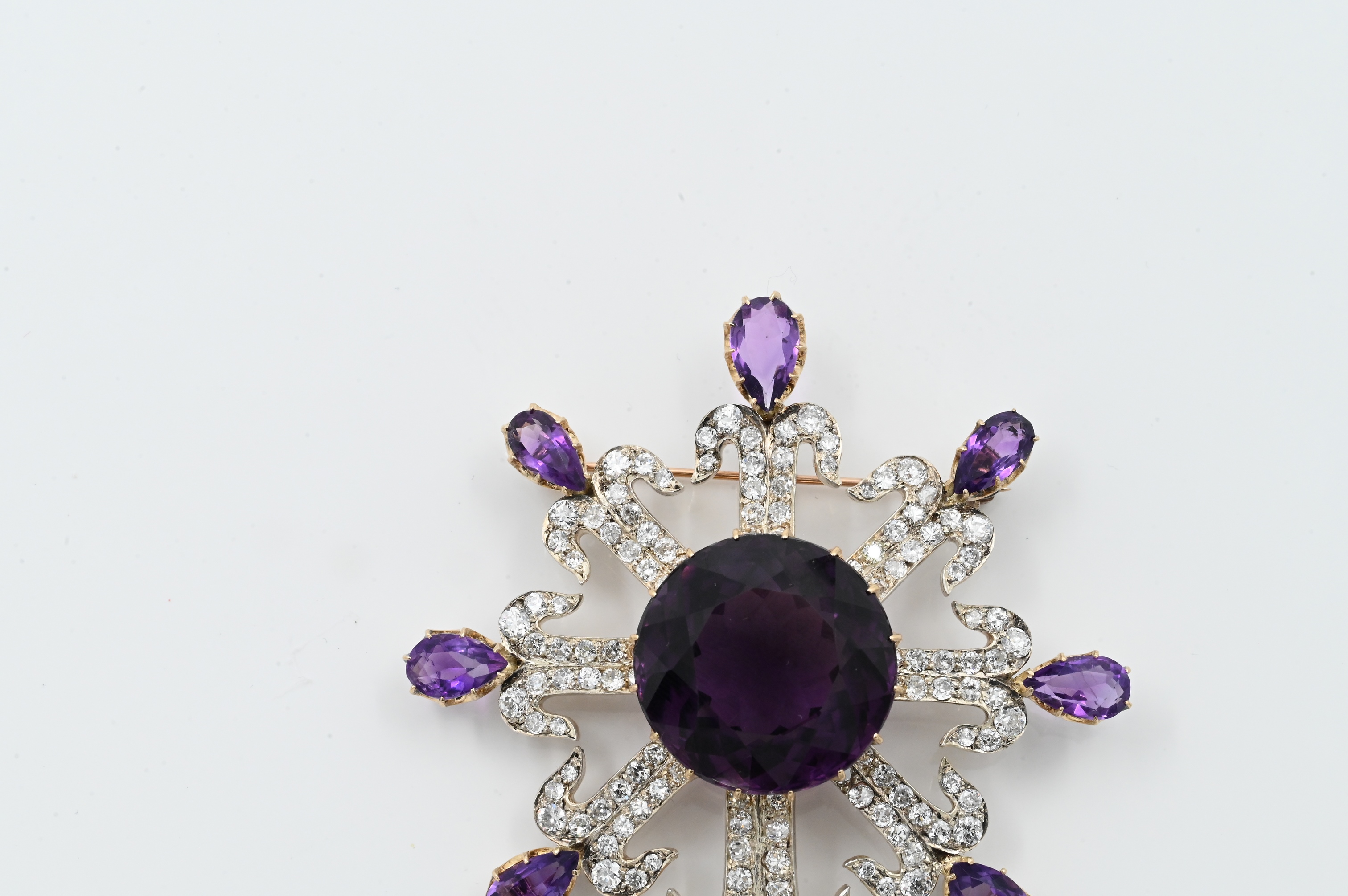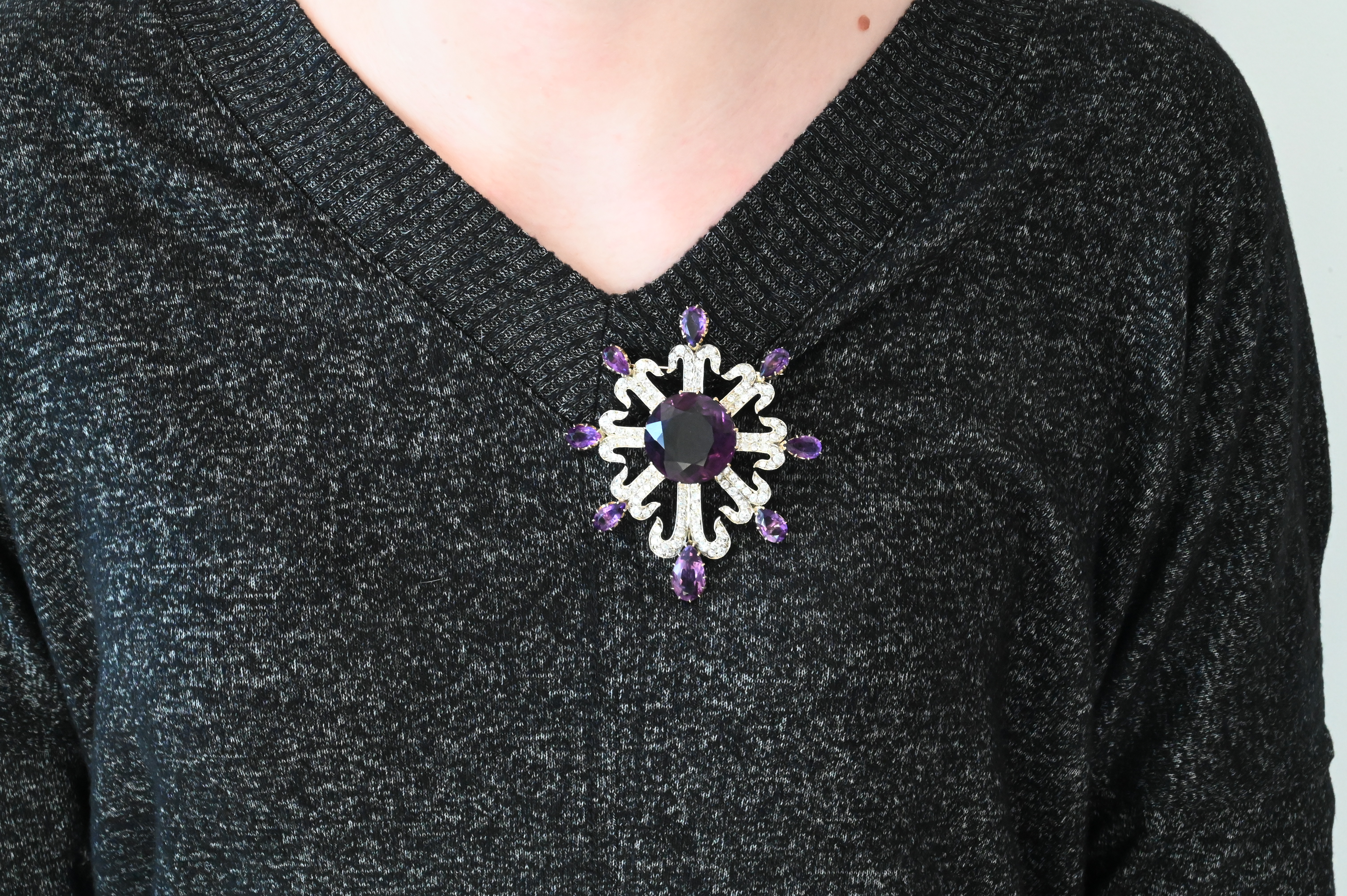 set with center amethyst approximately 14 carats surrounded by diamond set drops ending in pear cut amethysts, 136 melee diamonds (one missing), total weight 46.1 grams