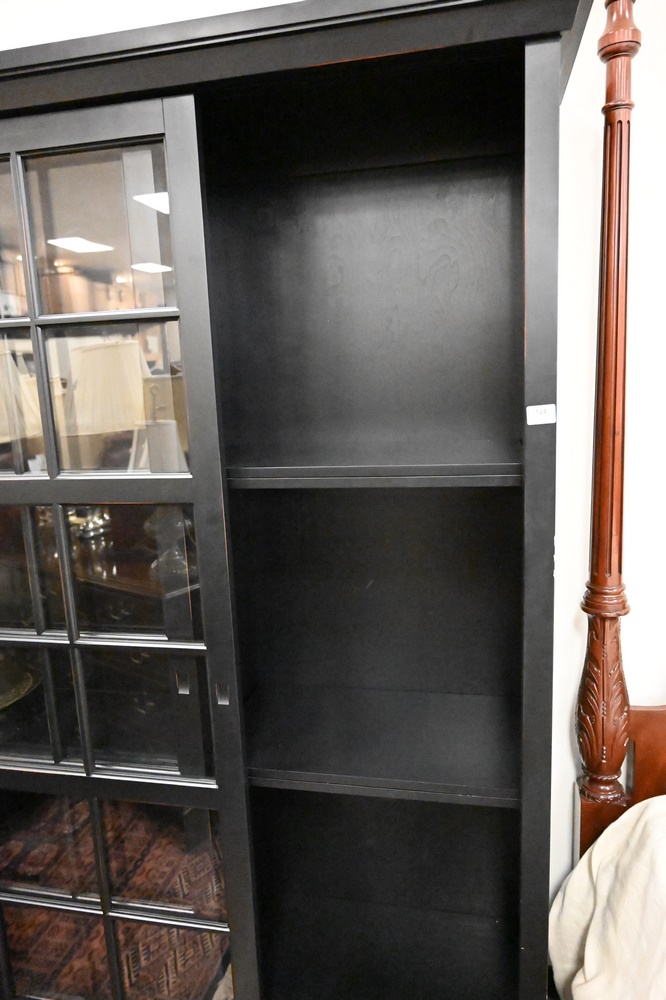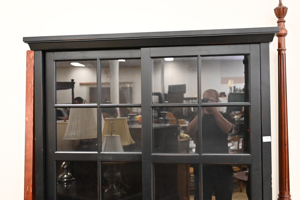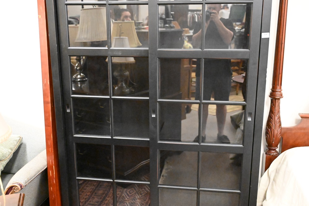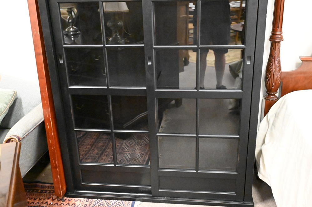 Lot 124: Contemporary China Cabinet, having two sliding doors opening to interior shelving, height 78 inches, width 49 inches.