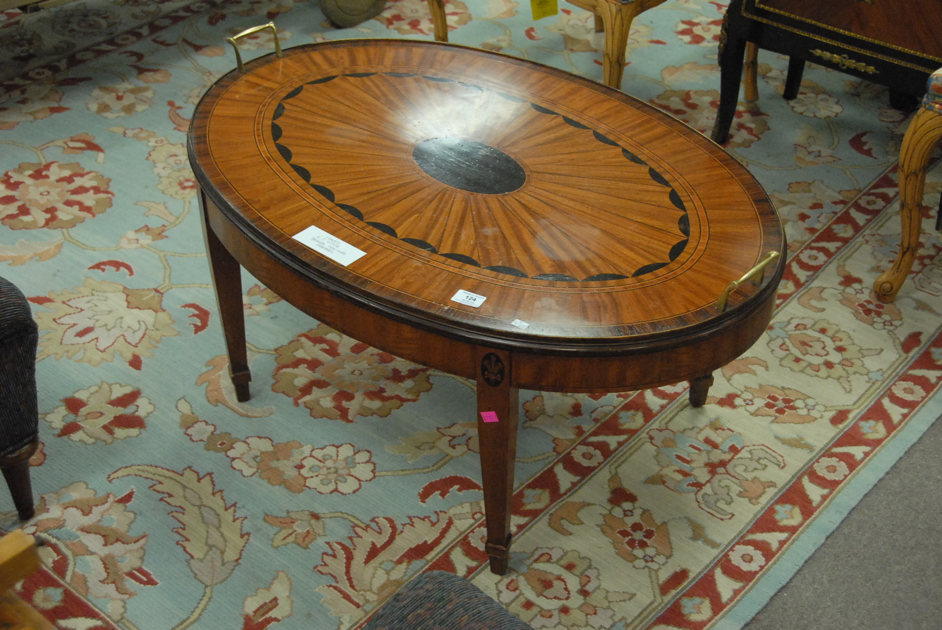 Lot 124: E. J. Victor Premier Furniture Crafters oval coffee table with inlaid top. ht. 18 in. top: 25 1/2 x 37 1/2.