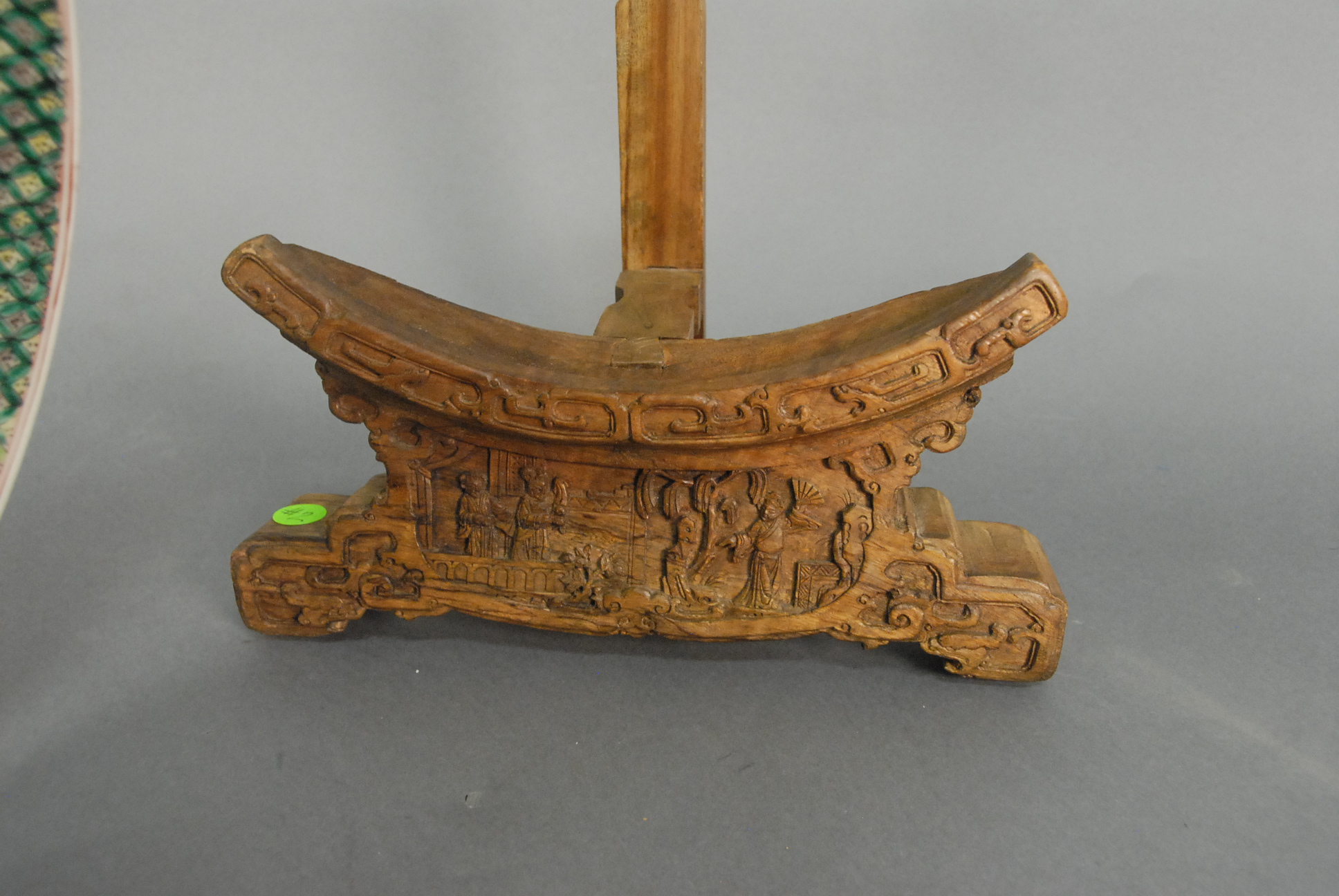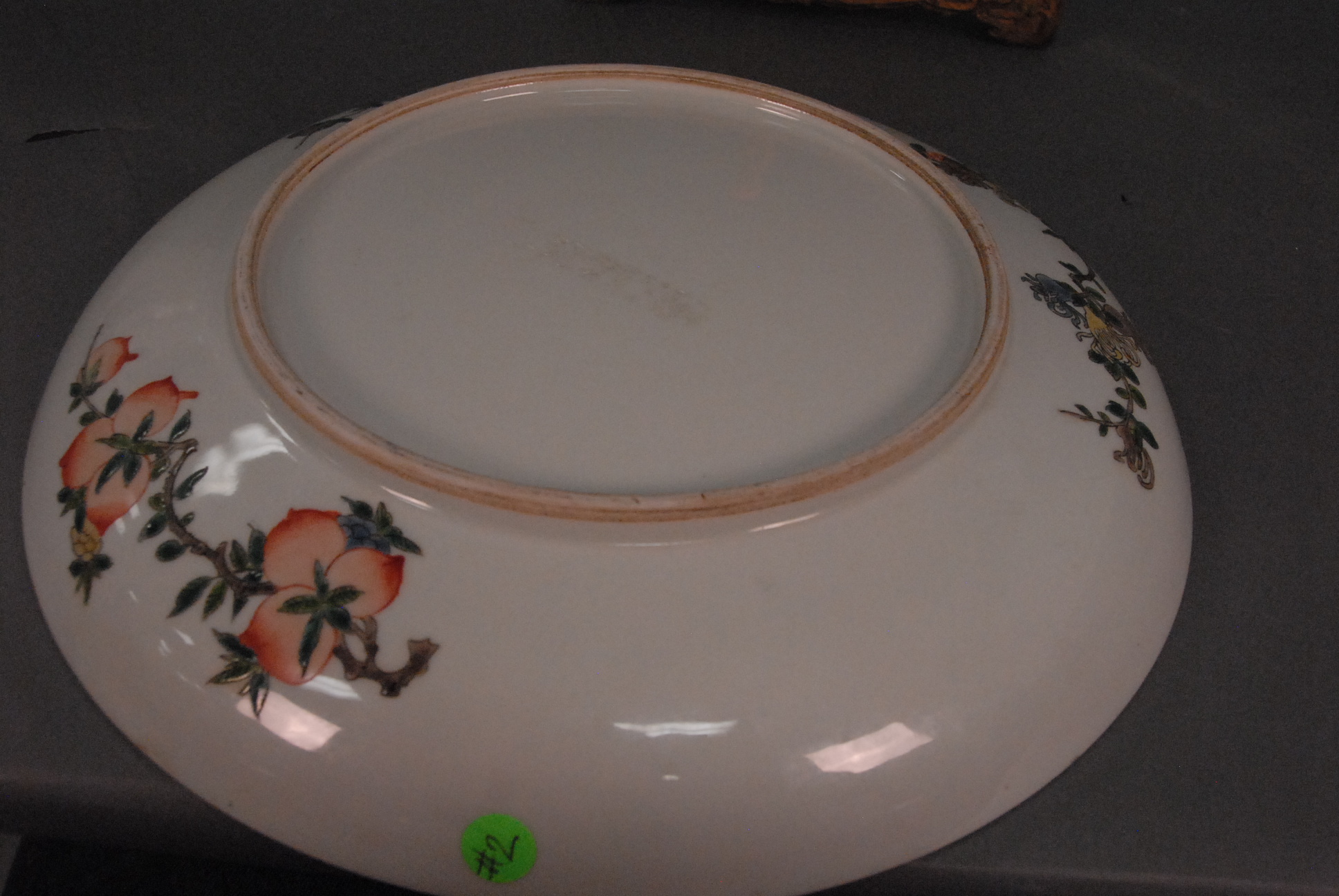 Lot 124: Famille verte phoenix bird charger with painted phoenix bird perched on a blossoming tree and peach exterior borders, dia. 16 1/2in.