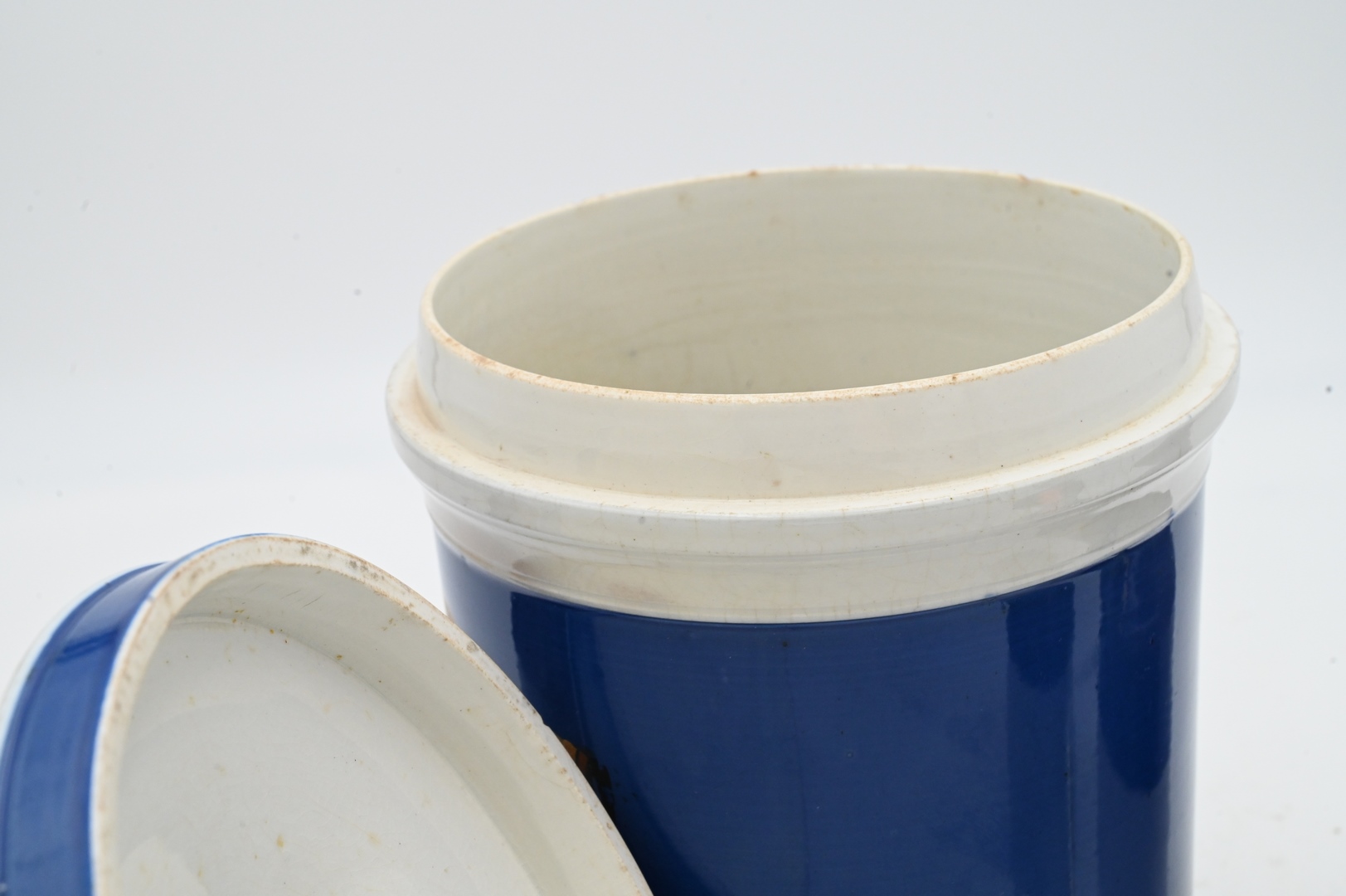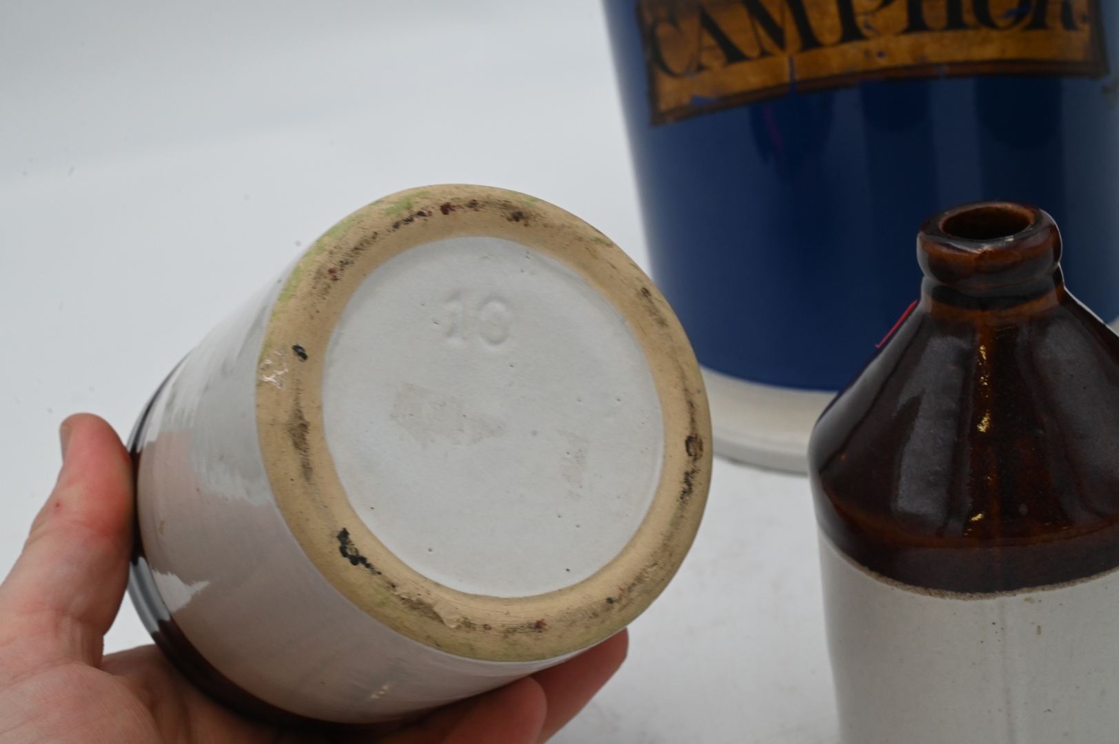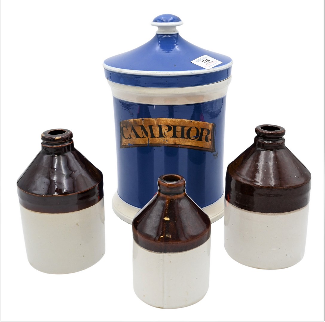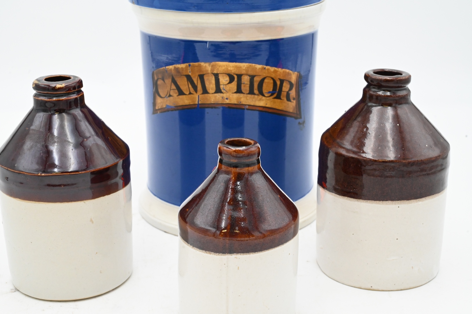 Four Piece Group, to include a large blue ground apothecary jar labeled “Camphor”, late 19th century, along with a set of three stoneware pottery jugs labeled “Mercury”, tallest 10 inches.