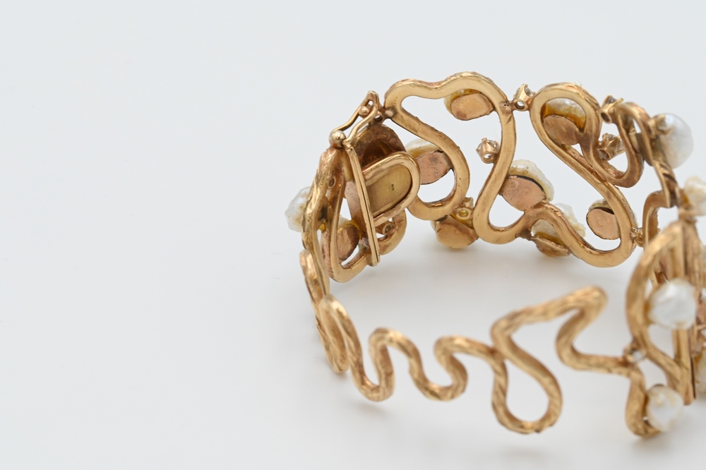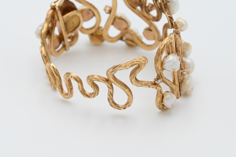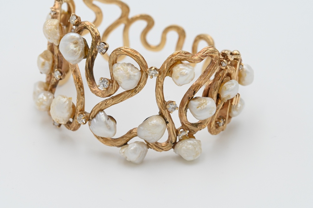 Lot 124: Gold, Diamond and Pearl Openwork Bangle Bracelet, width 1 3/8 inches, 49 grams.