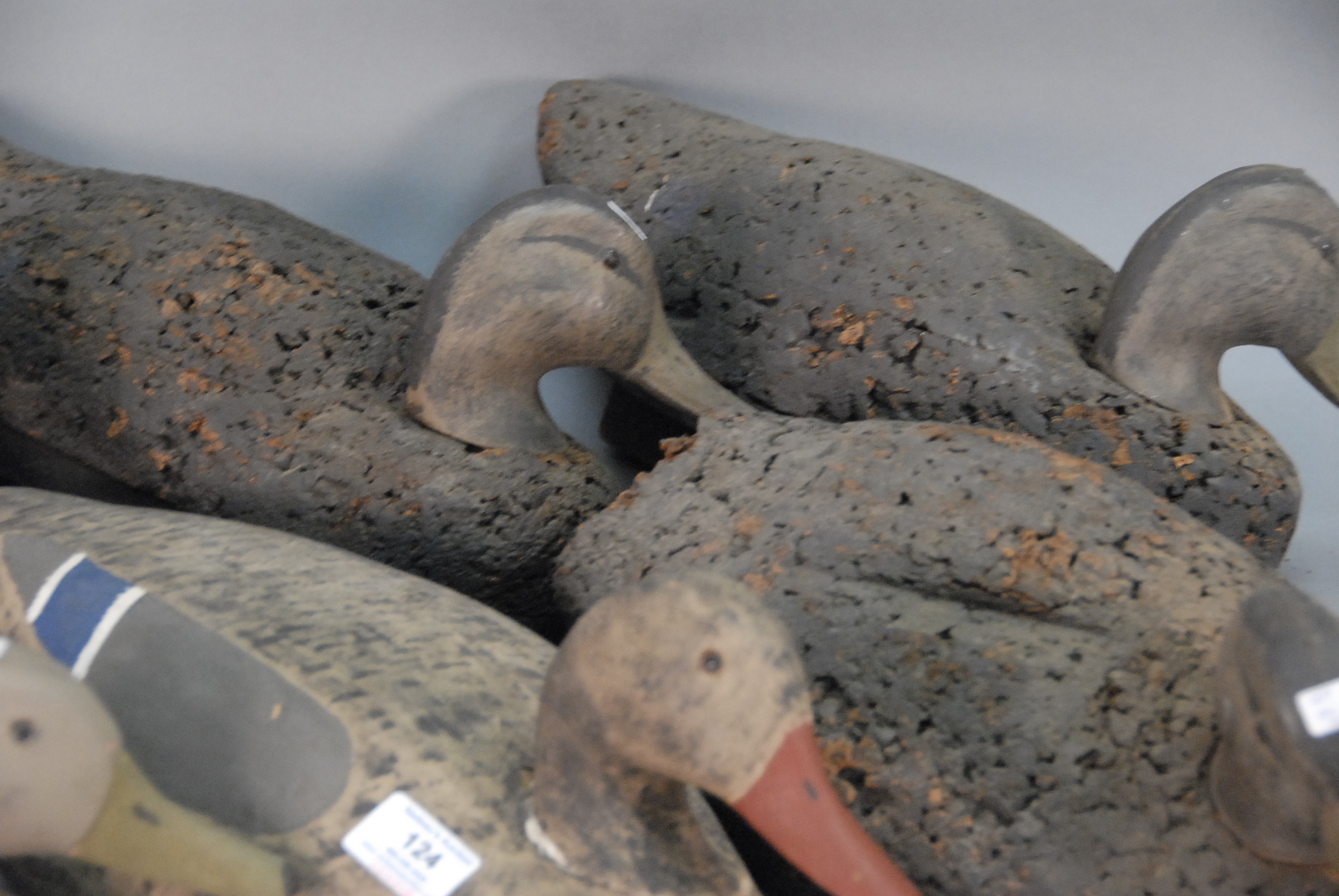 Lot 124: Group of ten duck decoys, four are cork, six are painted wood, lengths from 14 in. to 19 in.