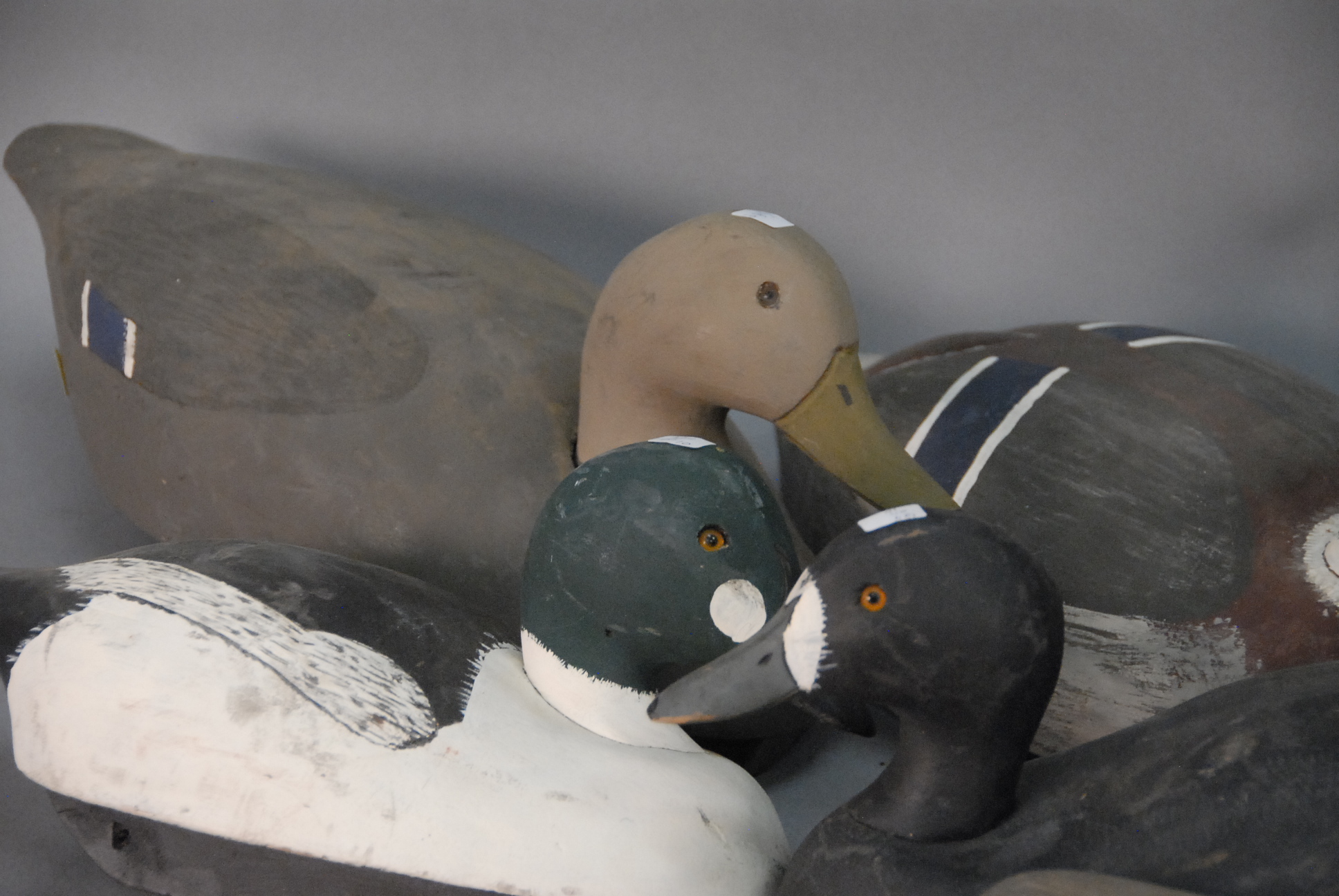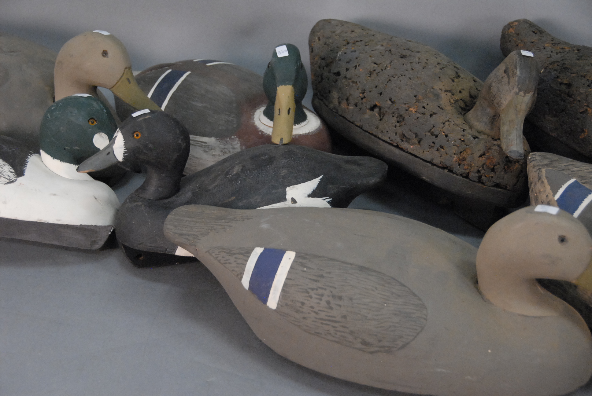 Group of ten duck decoys, four are cork, six are painted wood, lengths from 14 in. to 19 in.