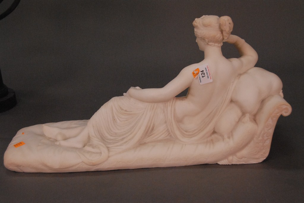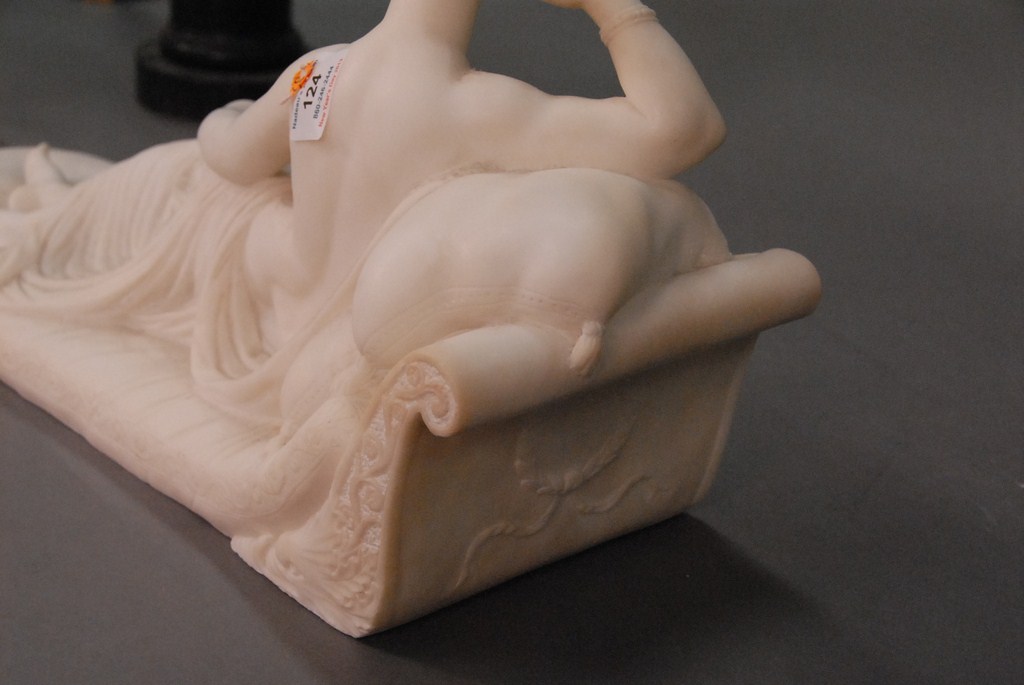 Marble sculpture of reclining woman on a chaise. ht. 11 1/2in. lg. 21in.