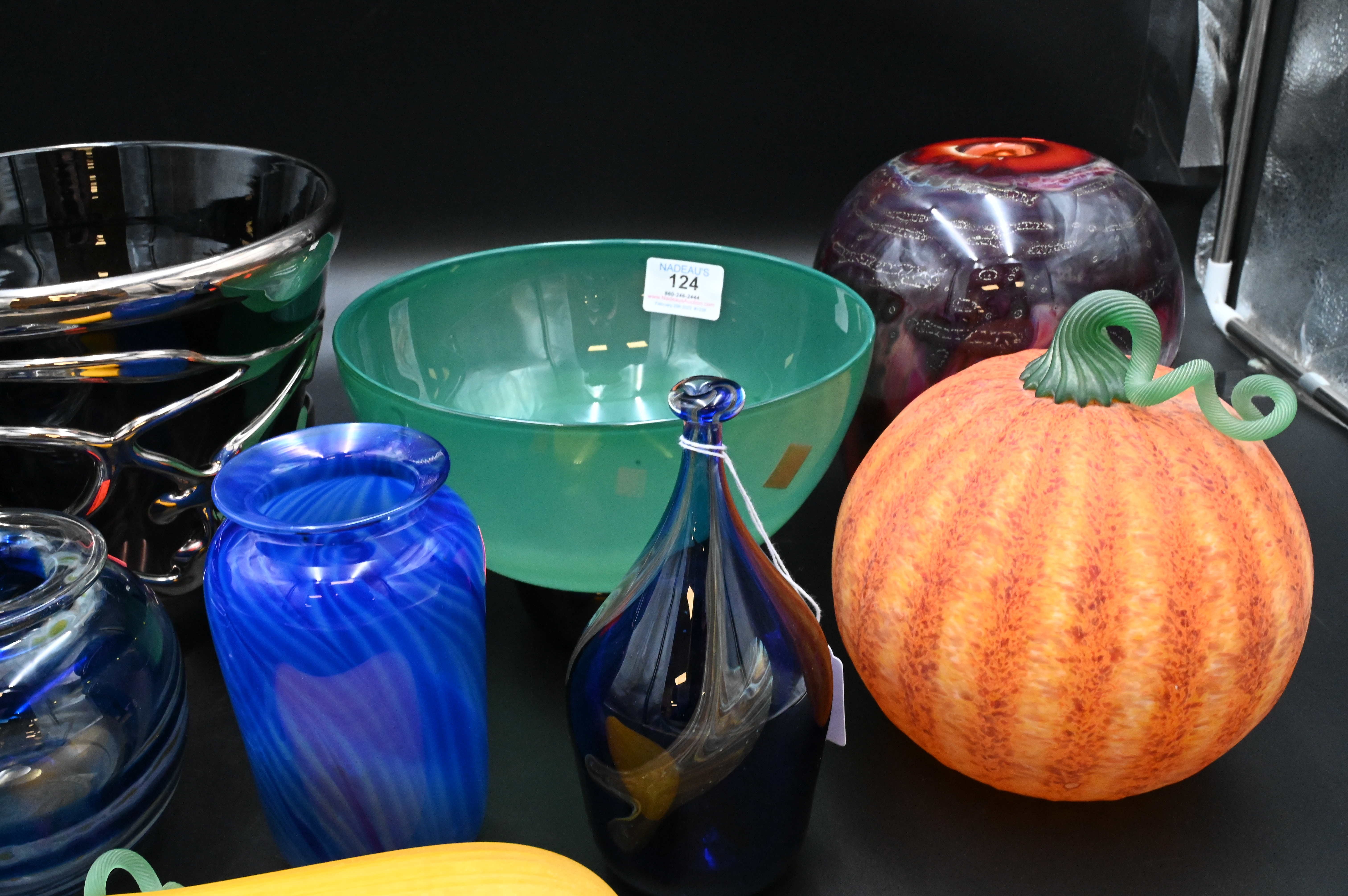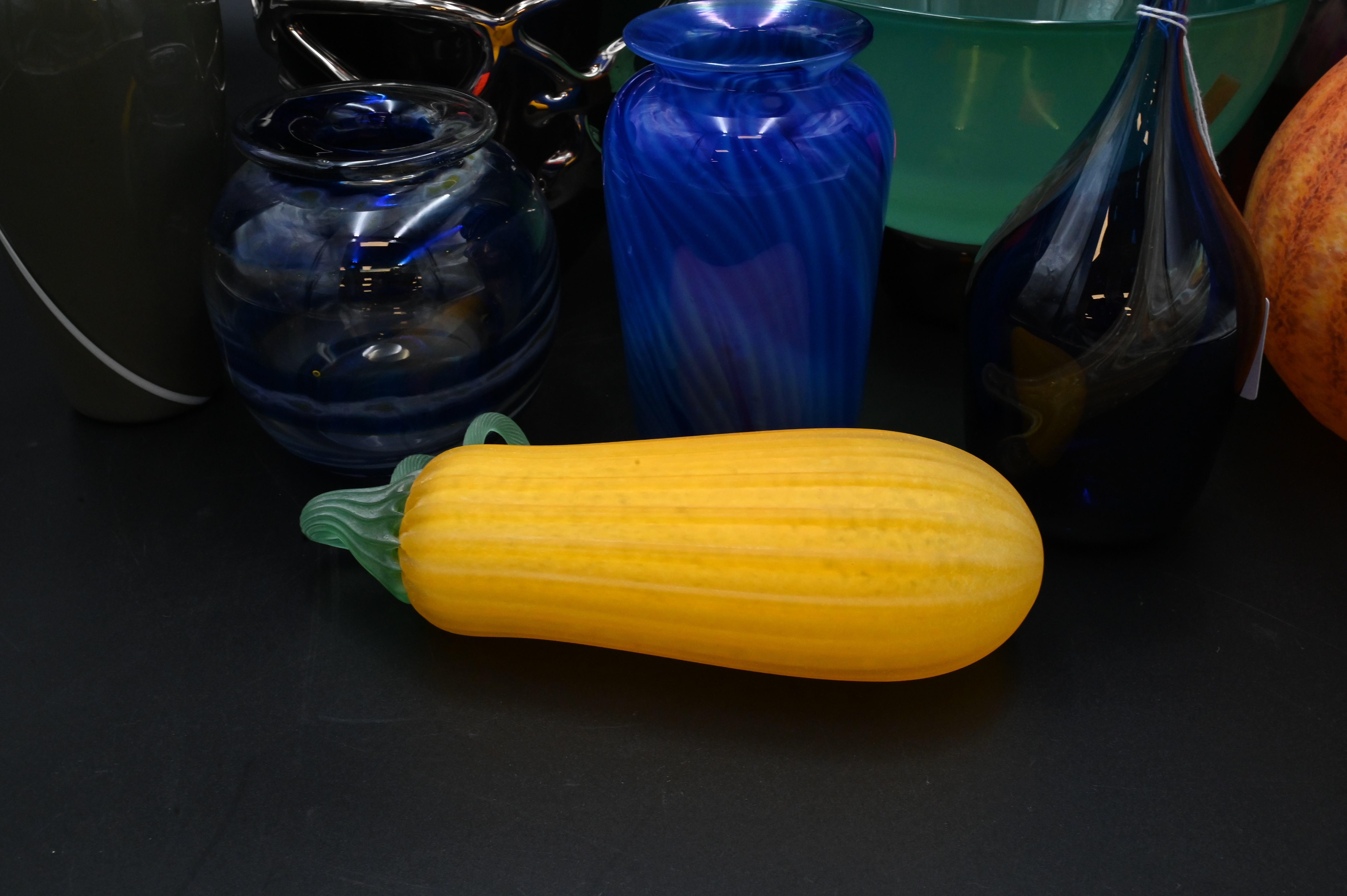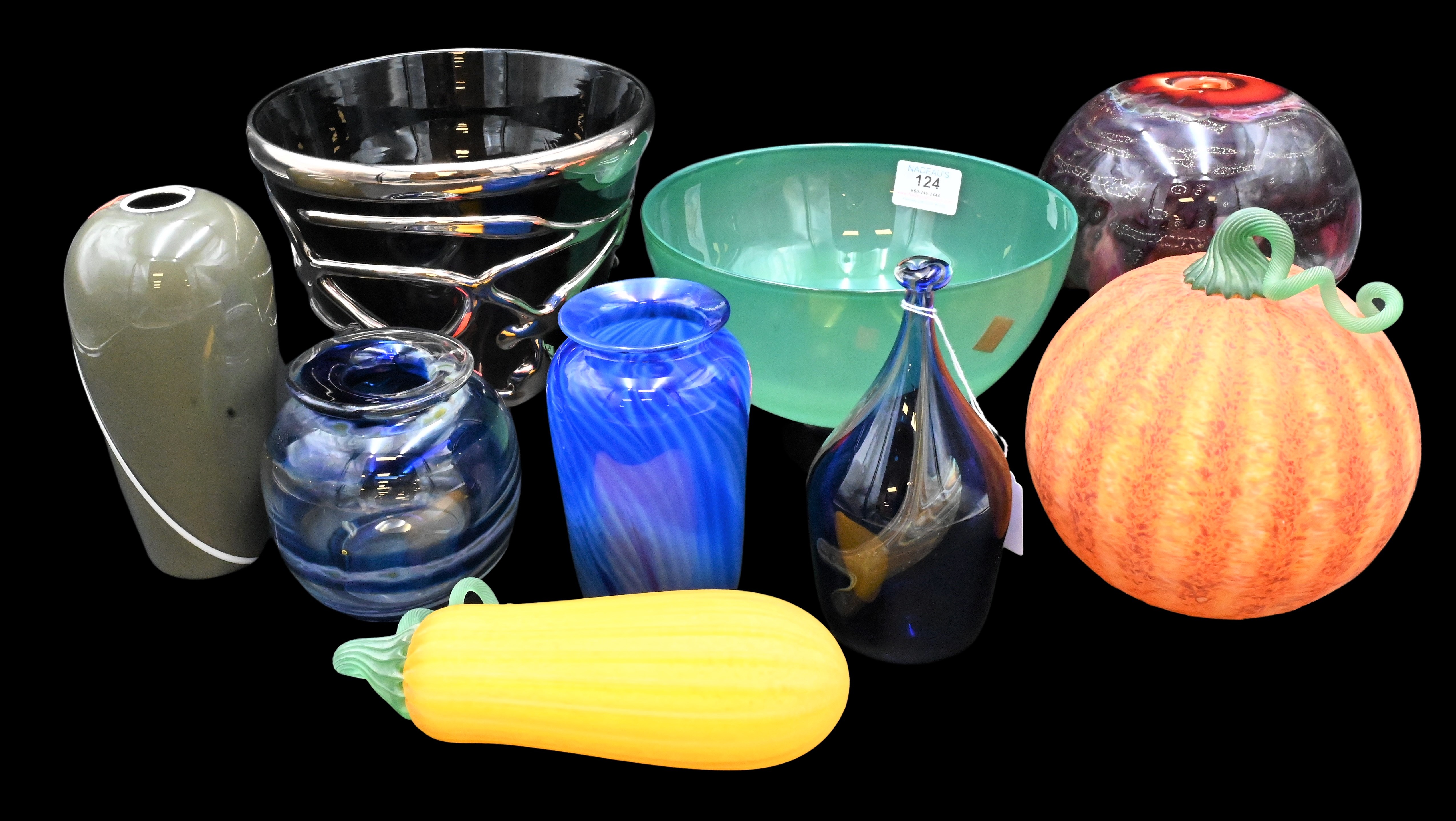 Nine Art Glass Pieces, to include a Wayne Filan silvered vase, Non Foux Studio celadon footed bowl, Gilmar Glass Works, pumpkin, squash, Deeble bottle vase, Barbara Grygutis, along with two unsigned vases, tallest 8 inches.