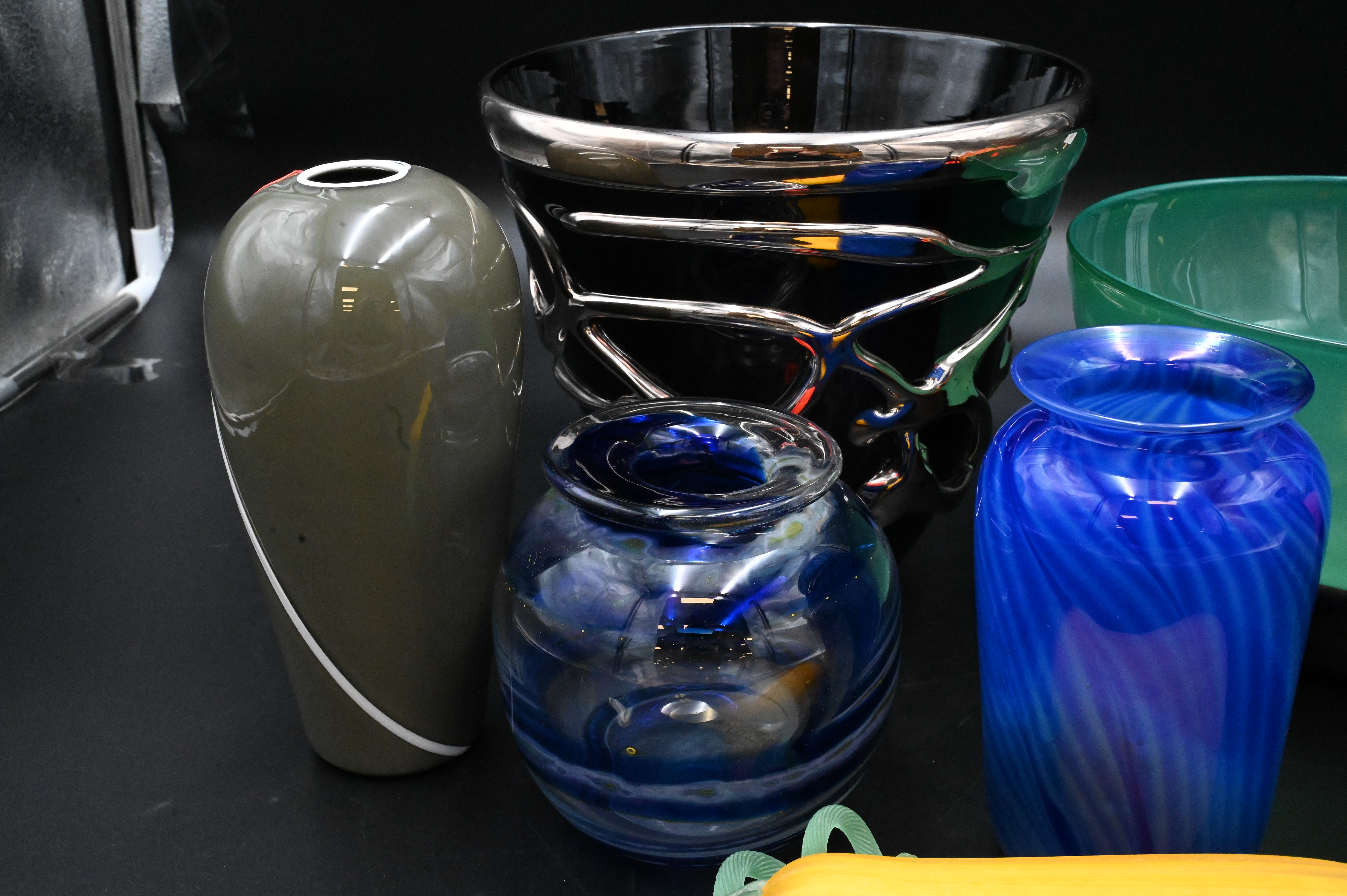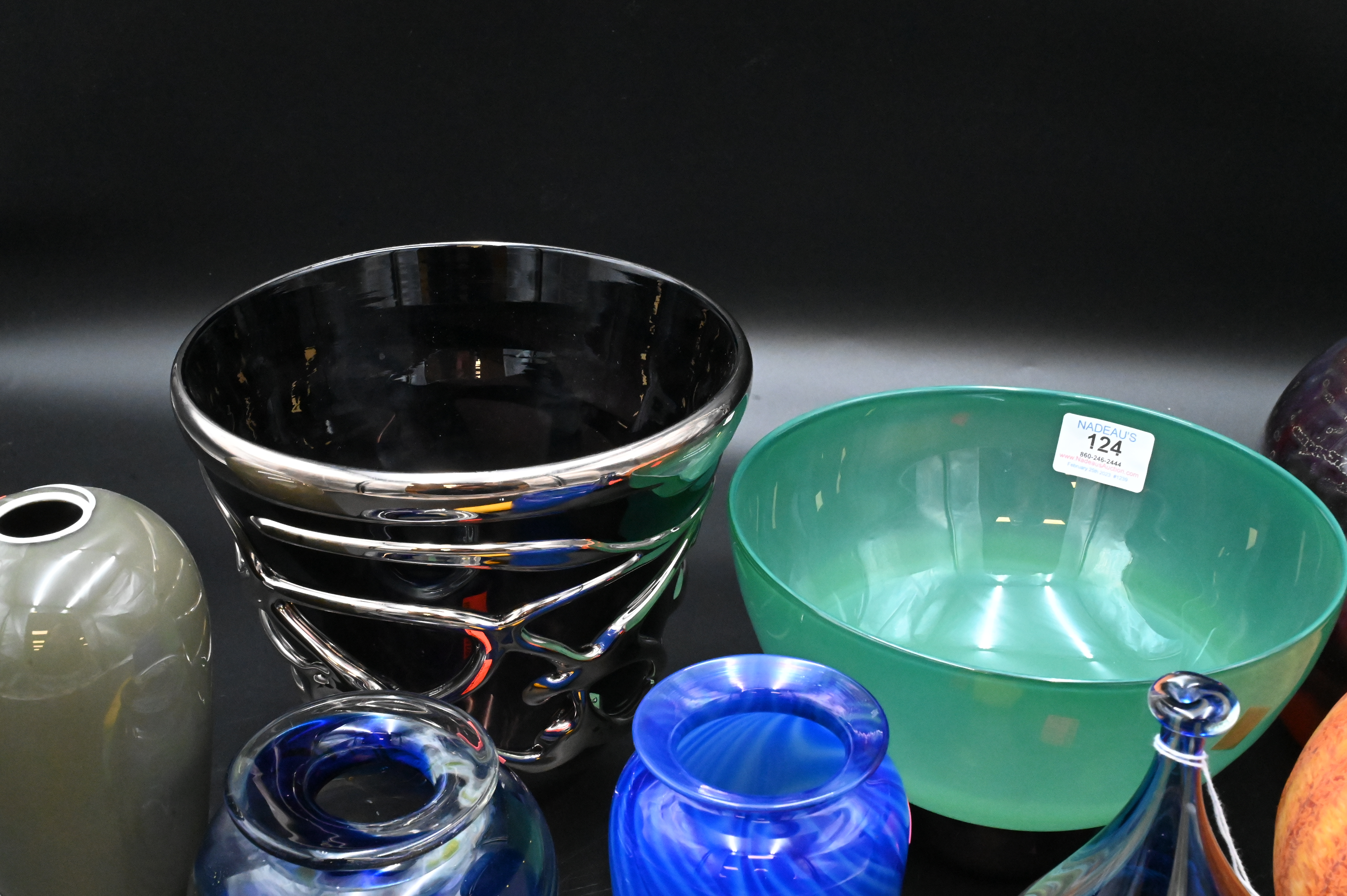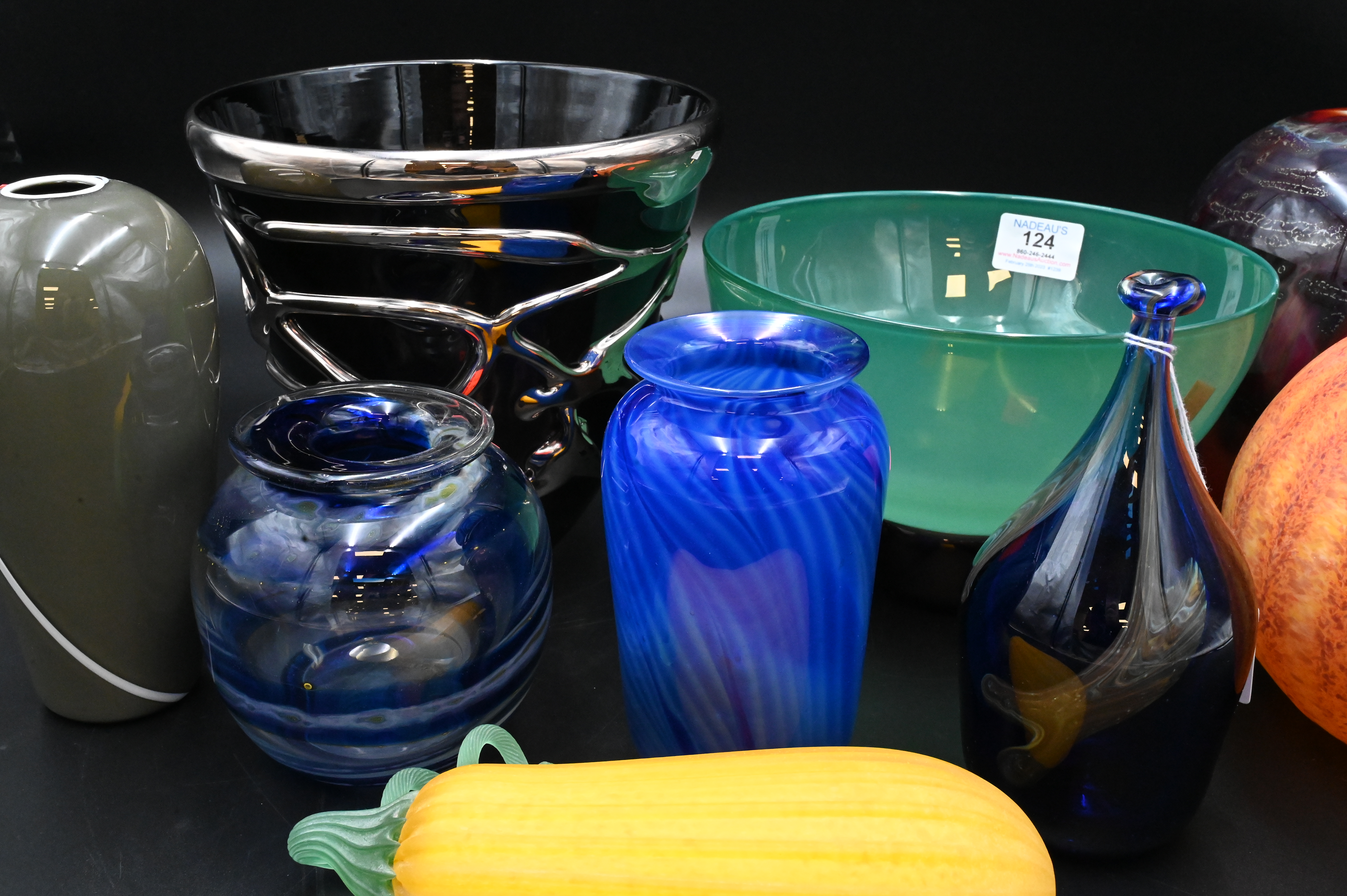 Nine Art Glass Pieces, to include a Wayne Filan silvered vase, Non Foux Studio celadon footed bowl, Gilmar Glass Works, pumpkin, squash, Deeble bottle vase, Barbara Grygutis, along with two unsigned vases, tallest 8 inches.