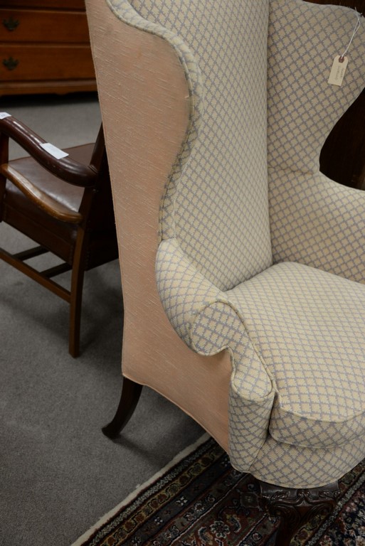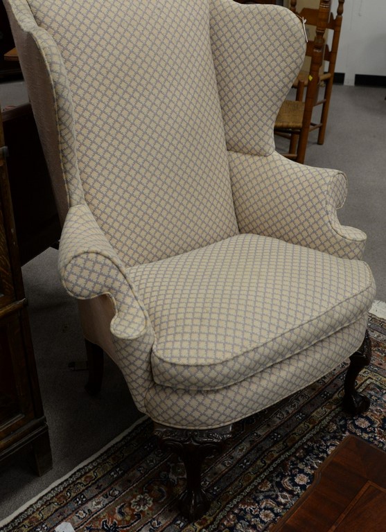 Pair Southwood Chippendale style upholstered wing chairs with ball and claw feet.