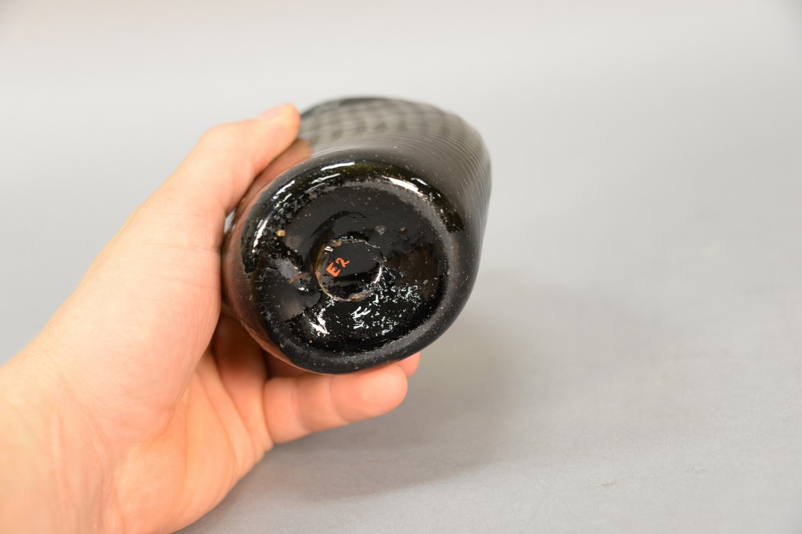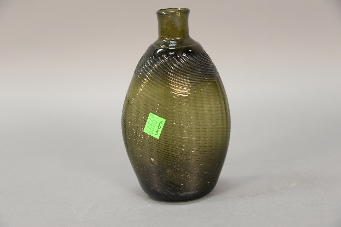 Pitkin glass flask with olive green swirl decorated. ht. 7in.